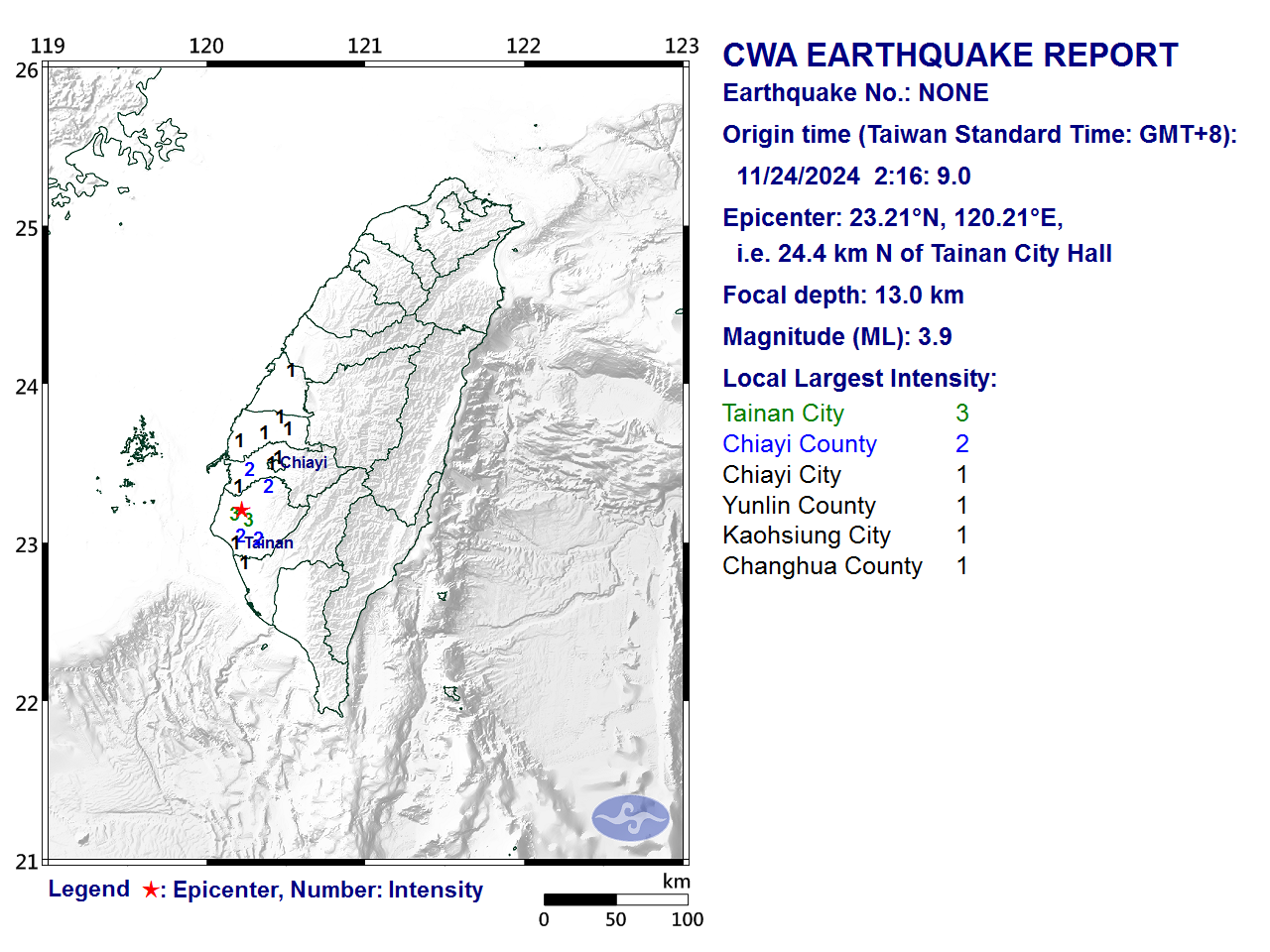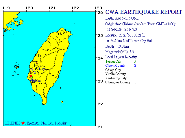 11/24 2:16 ML 3.9 23.21N 120.21E, i.e. 24.4 km N of Tainan City