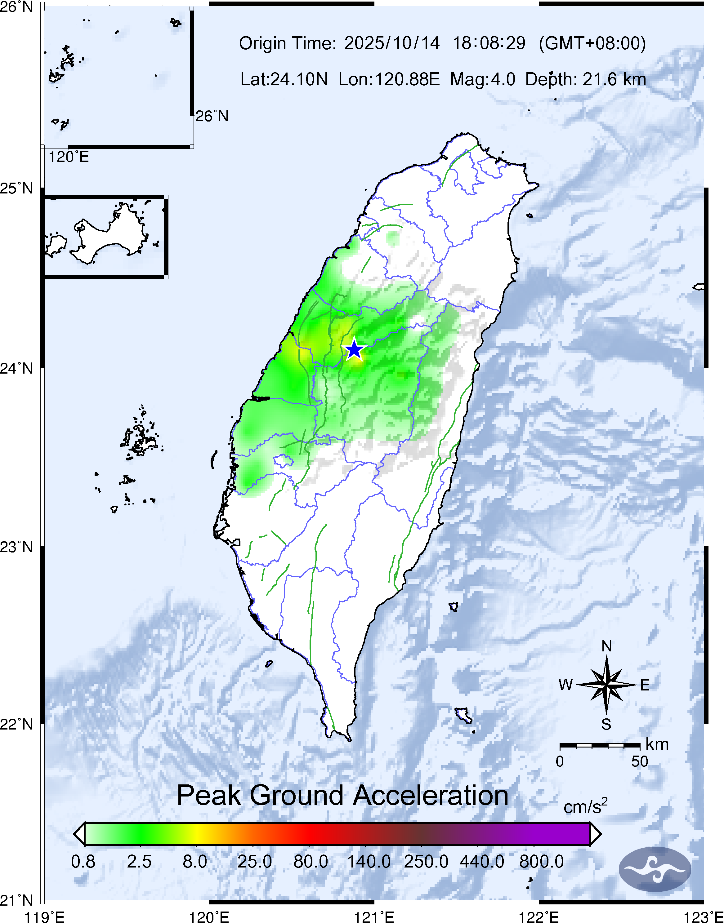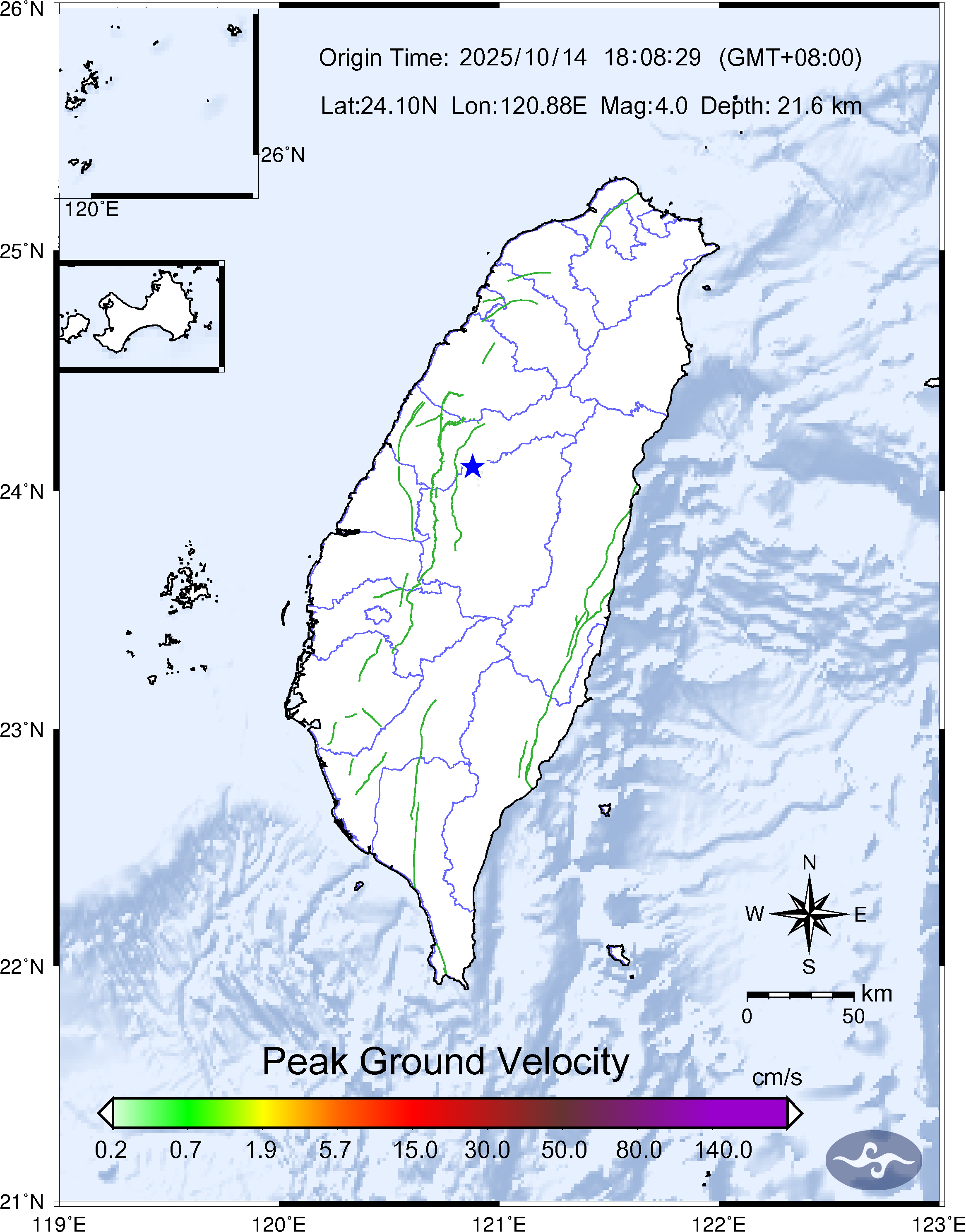 Origin Time:2025/10/14 18:08:29 Lon:120.88°E Lat:24.10°N Depth:21.6km