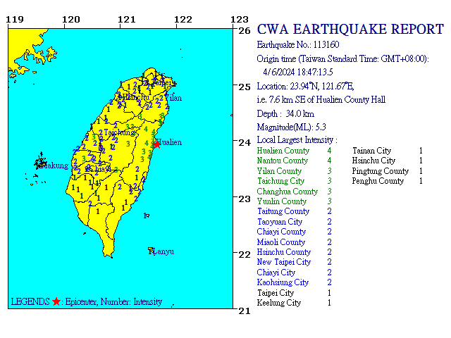 160 4/6 18:47 ML 5.3 23.94N 121.67E, i.e. 7.6 km SE of Hualien County