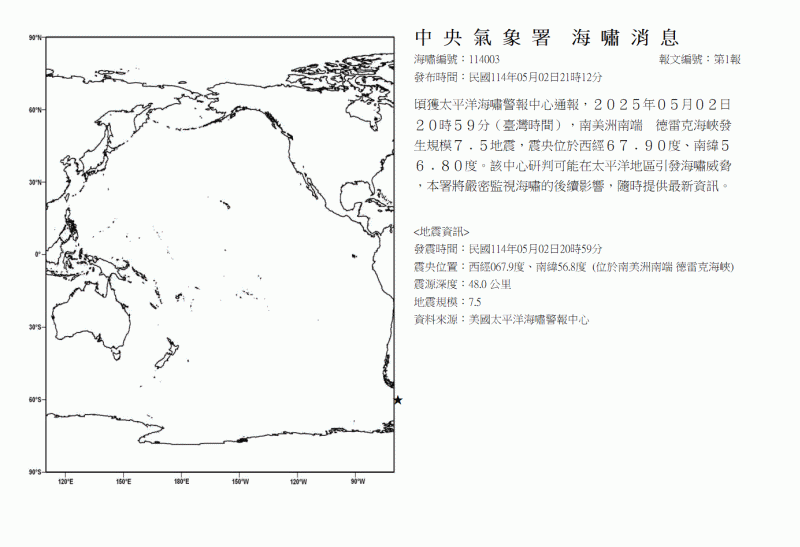 頃獲太平洋海嘯警報中心通報,2025年05月02日20時59分(臺灣時間),南美洲南端 德雷克海峽發生規模7﹒5地震,震央位於西經67﹒90度、南緯56﹒80度。該中心研判可能在太平洋地區引發海嘯威脅,本署將嚴密監視海嘯的後續影響,隨時提供最新資訊。