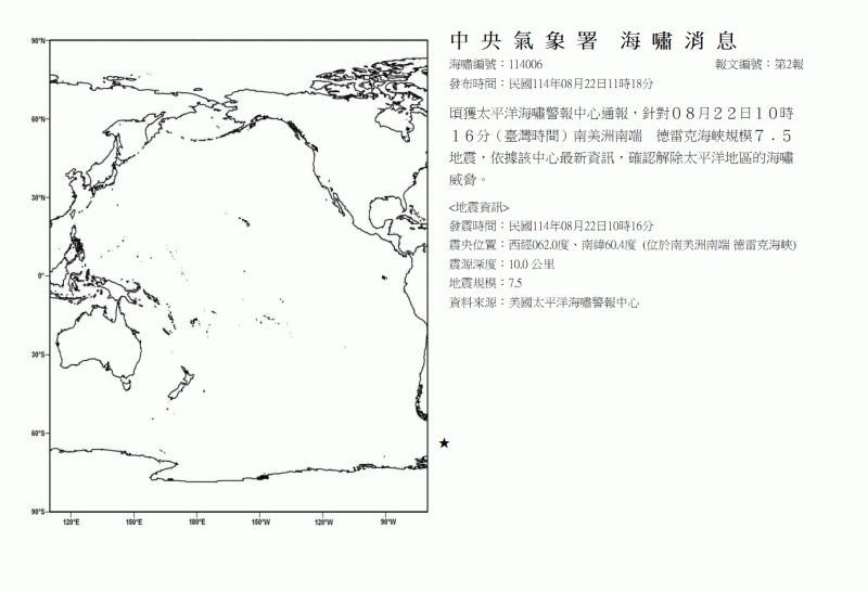頃獲太平洋海嘯警報中心通報,針對08月22日10時16分(臺灣時間)南美洲南端 德雷克海峽規模7﹒5地震,依據該中心最新資訊,確認解除太平洋地區的海嘯威脅。