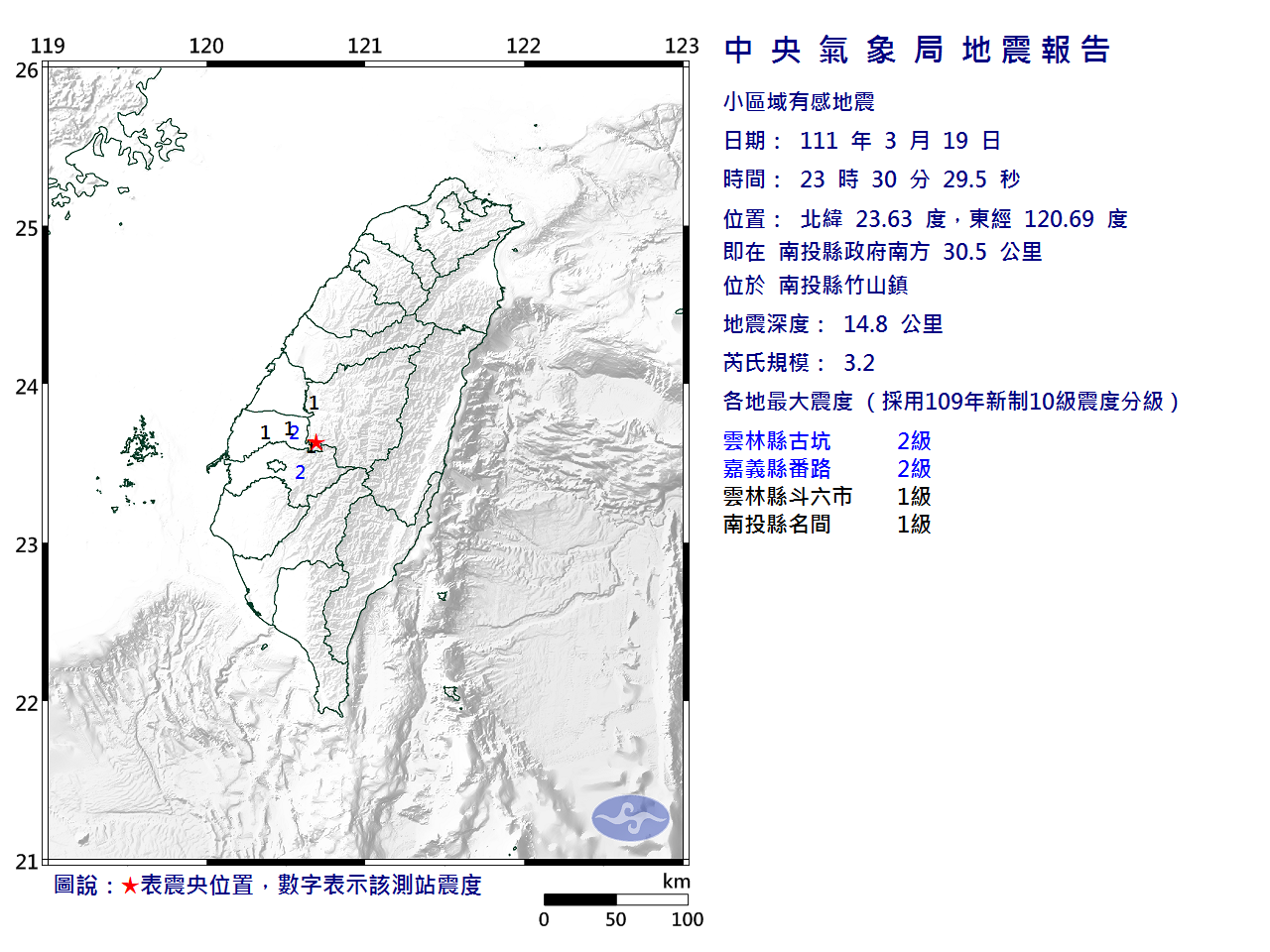 | 發 震 時 間: | 111年 3月19日23時30分29.5秒 |