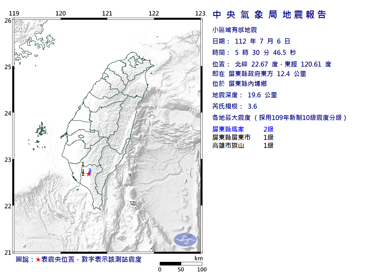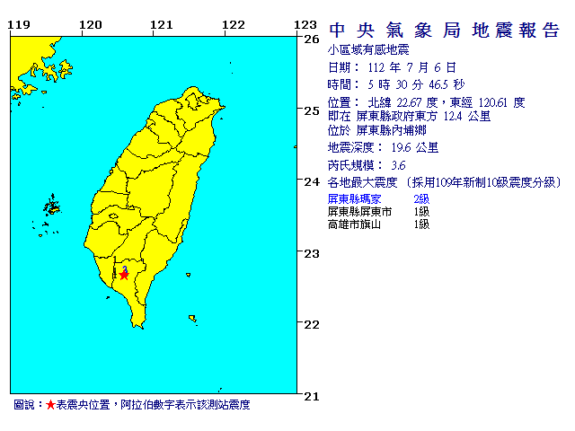 7月6日5時30分 規模 3.6 屏東縣政府東方 12.4 公里 (位於屏東縣內埔鄉)