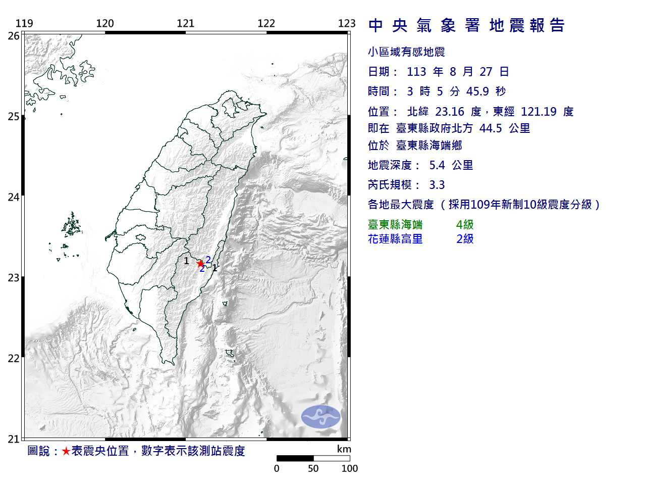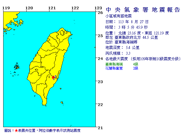 8月27日3時5分 規模 3.3 臺東縣政府北方 44.5 公里 (位於臺東縣海端鄉)
