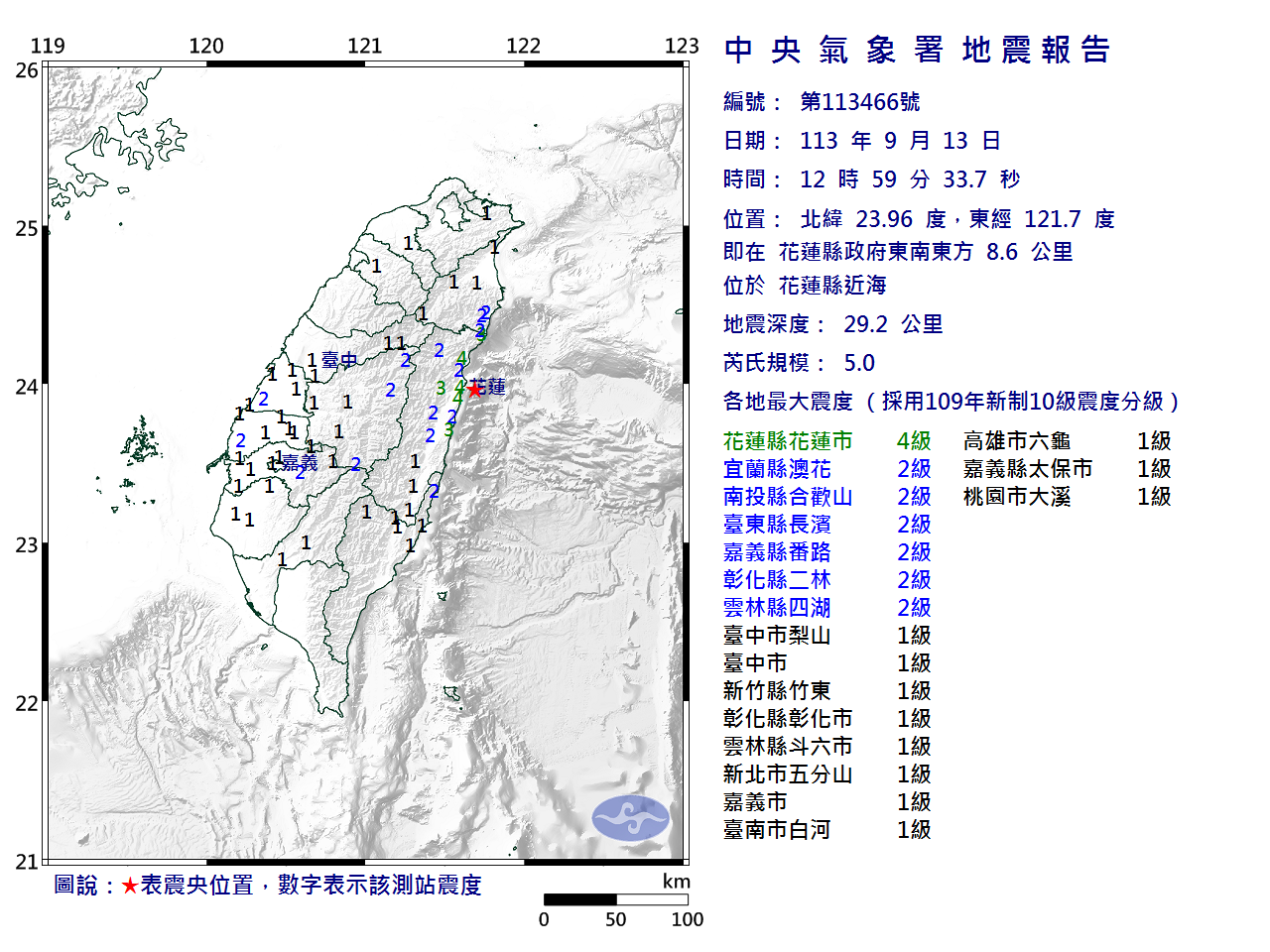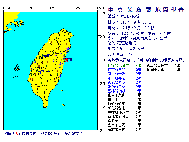 | 發 震 時 間: | 113年 9月13日12時59分33.7秒 |