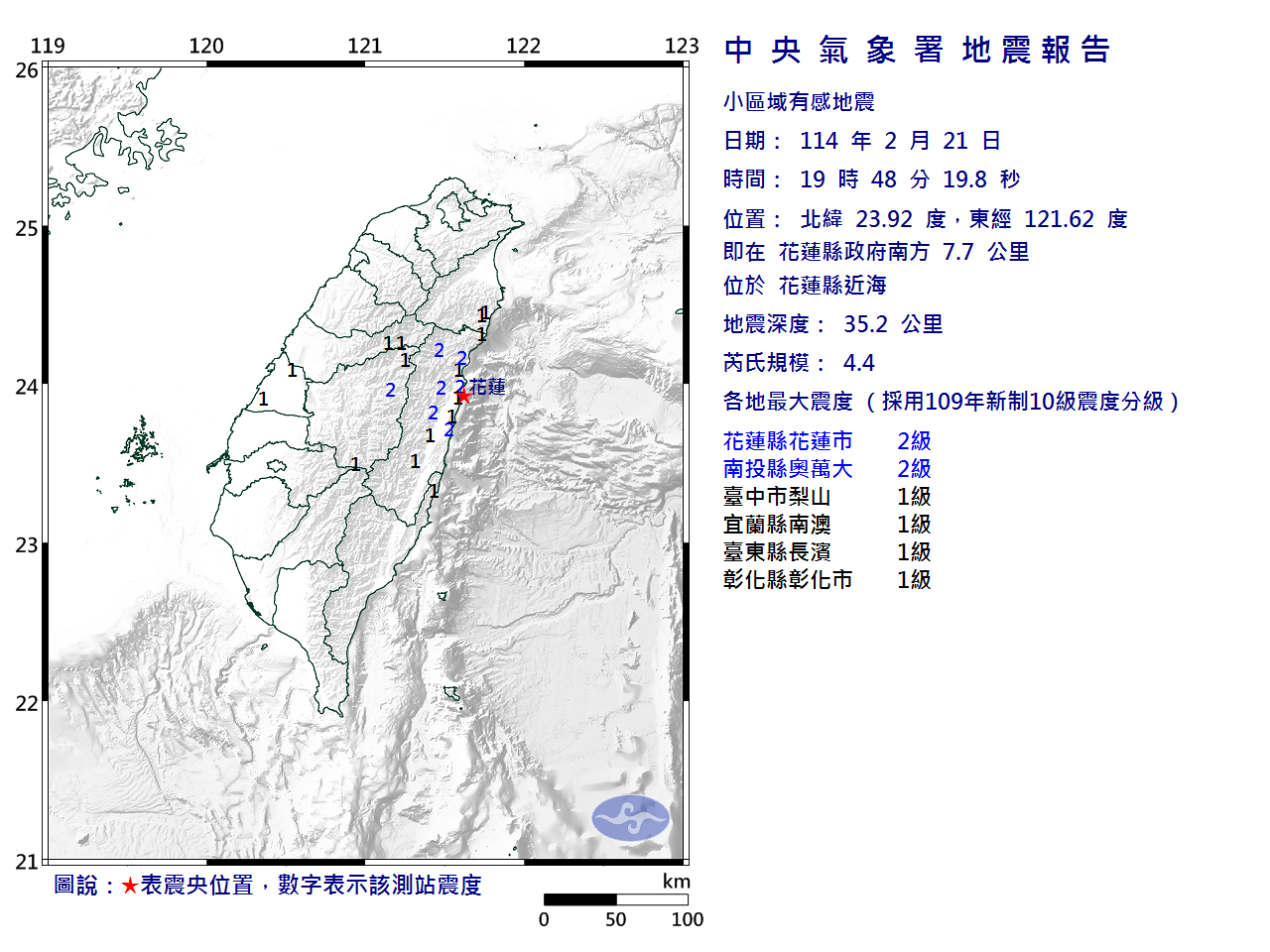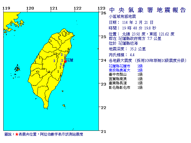 | 發 震 時 間: | 114年 2月21日19時48分19.8秒 |