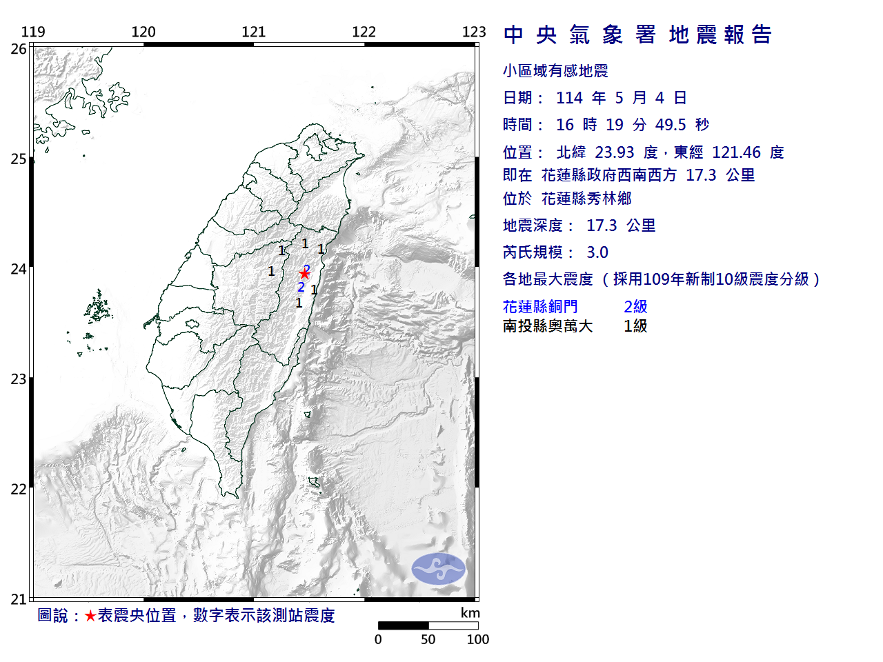 | 發 震 時 間: | 114年 5月 4日16時19分49.5秒 |