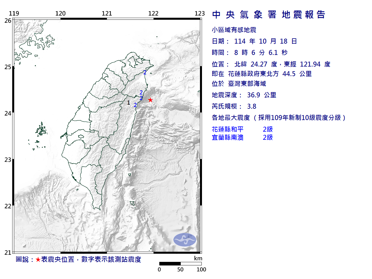 10月18日8時6分 規模 3.8 花蓮縣政府東北方 44.5 公里 (位於臺灣東部海域)