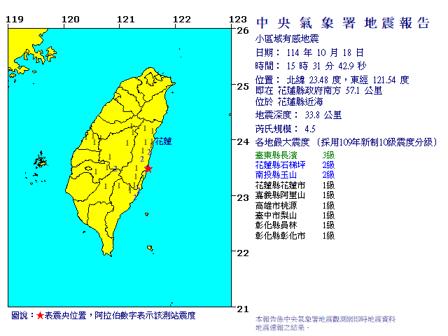 | 發 震 時 間: | 114年10月18日15時31分42.9秒 |