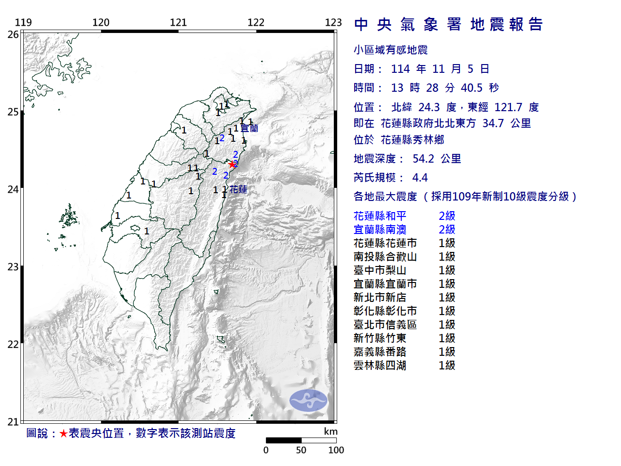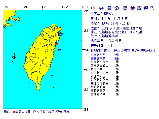 | 發 震 時 間: | 114年11月 5日13時28分40.5秒 |