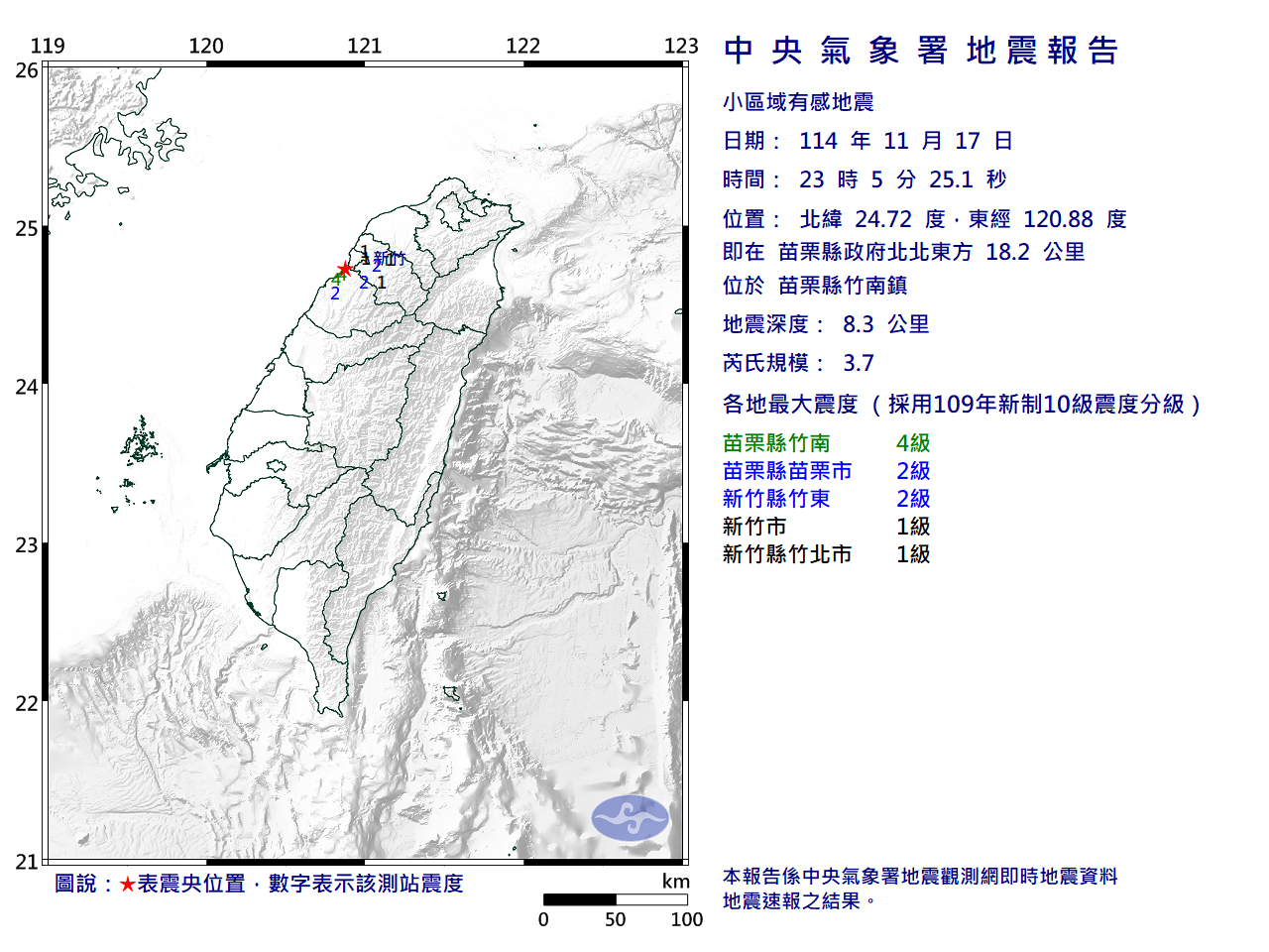 | 苗栗縣地區最大震度 4級 | 新竹縣地區最大震度 2級 | 新竹市地區最大震度 1級 |