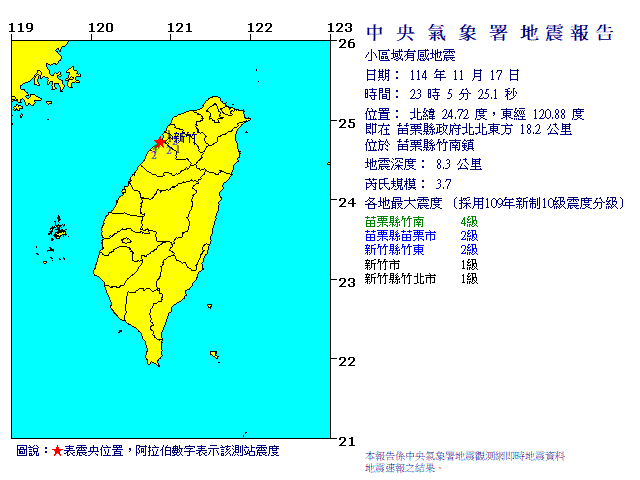 | 發 震 時 間: | 114年11月17日23時 5分25.1秒 |