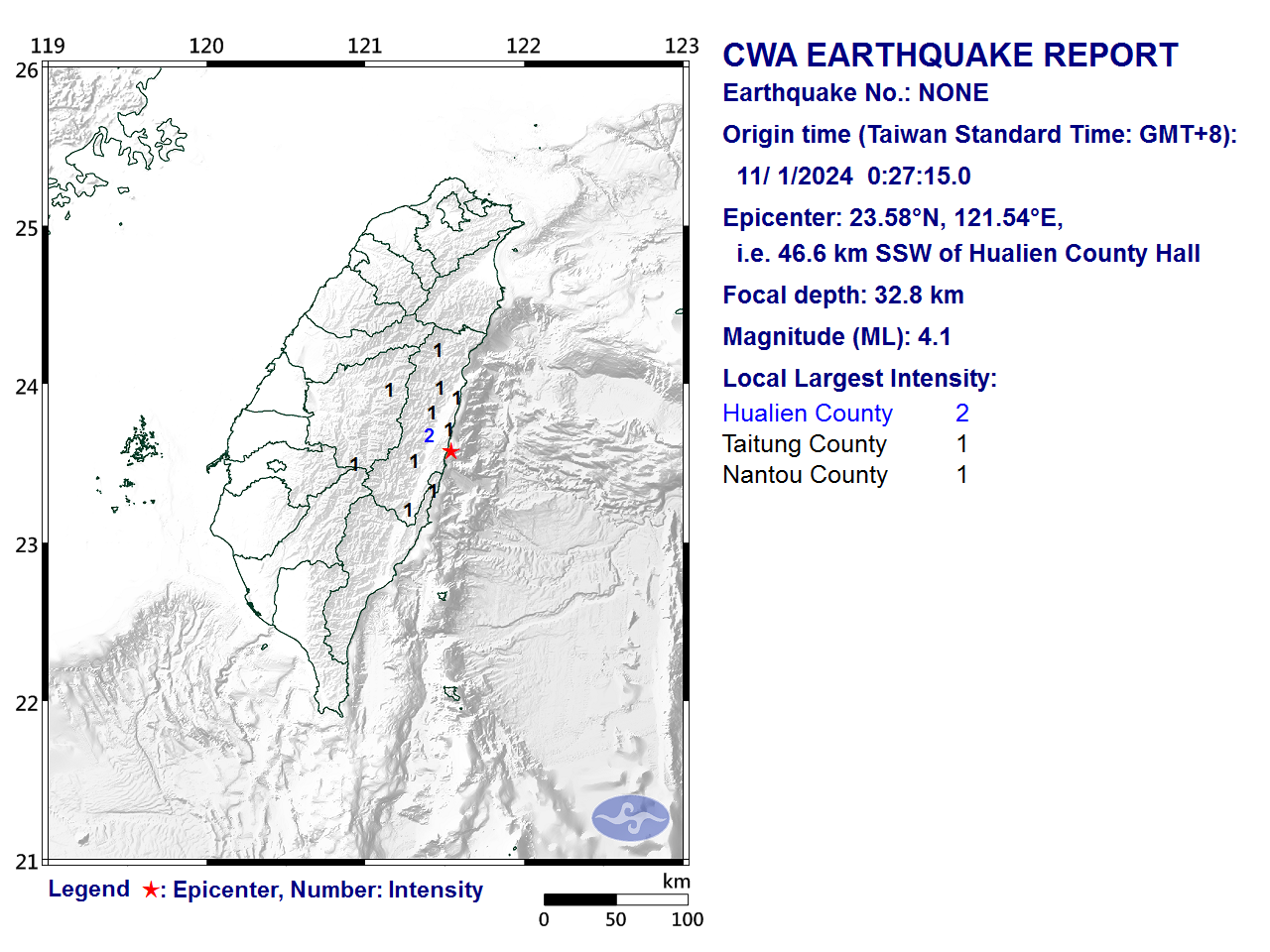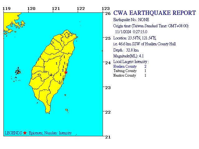 11月1日0時27分 規模 4.1 23.58N 121.54E, i.e. 46.6 km SSW of Hualien County