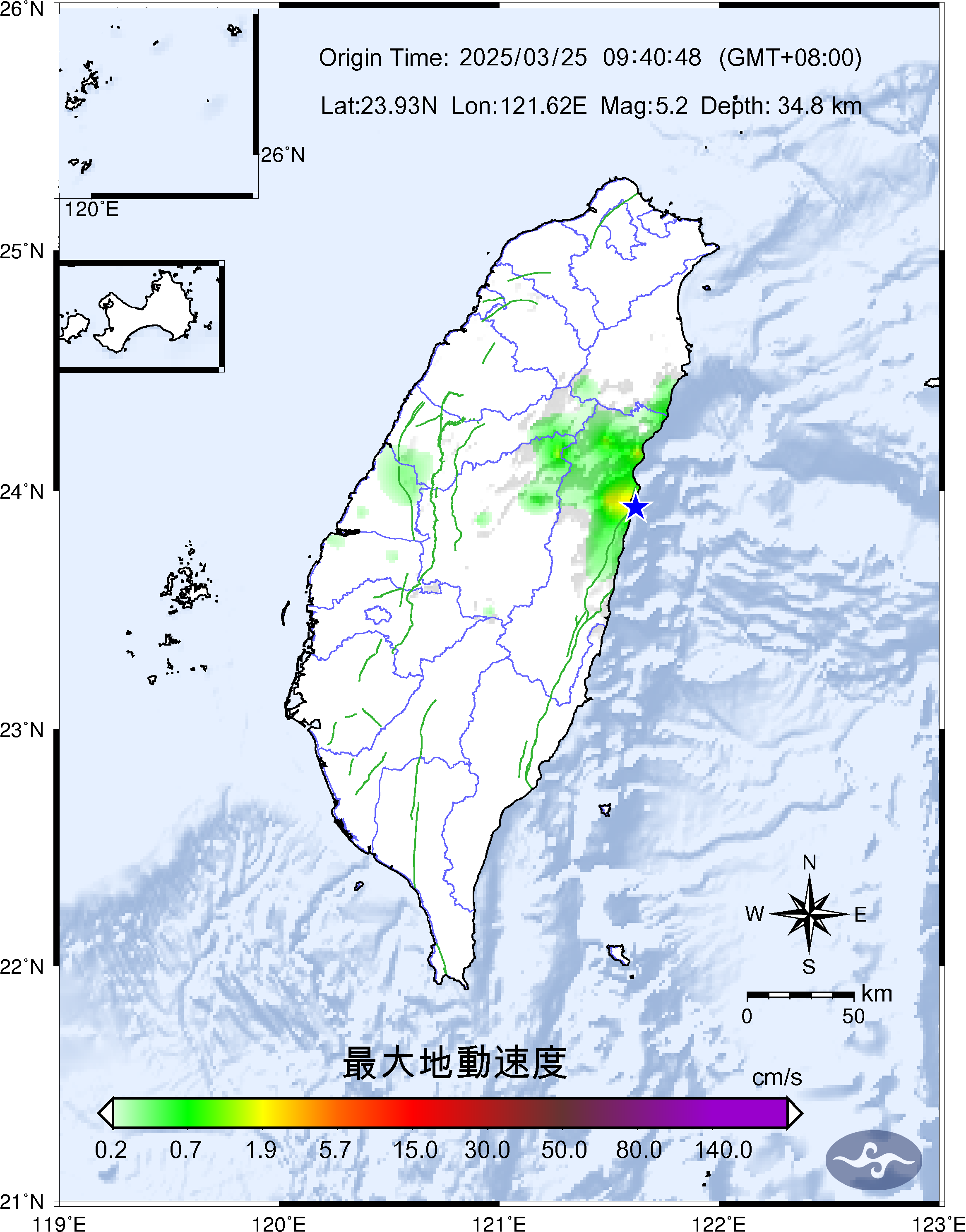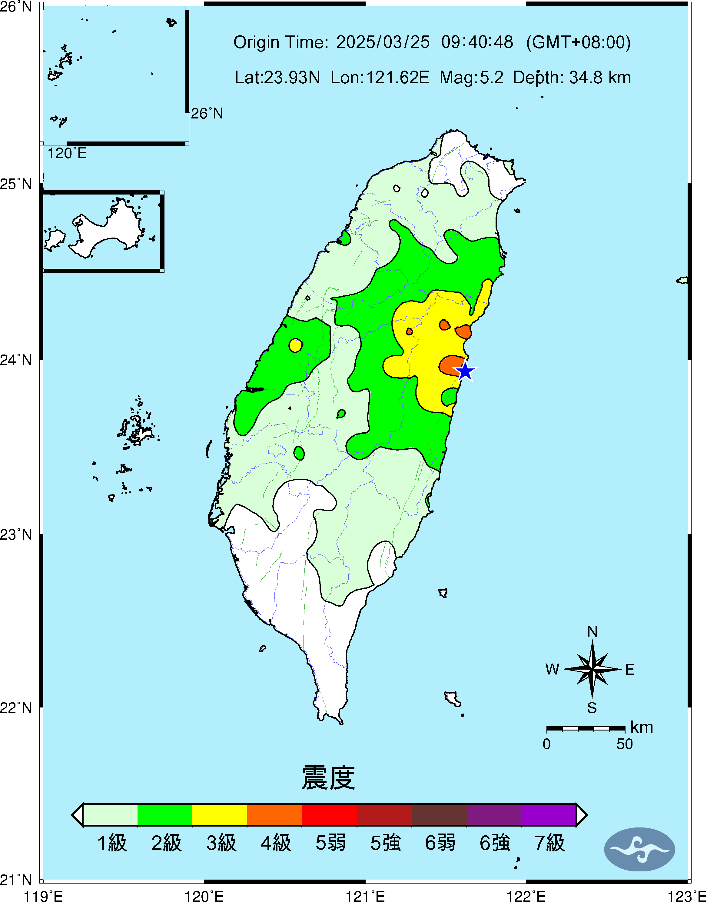 Origin Time:2025/03/25 09:40:48 Lon:121.62°E Lat:23.93°N Depth:34.8km