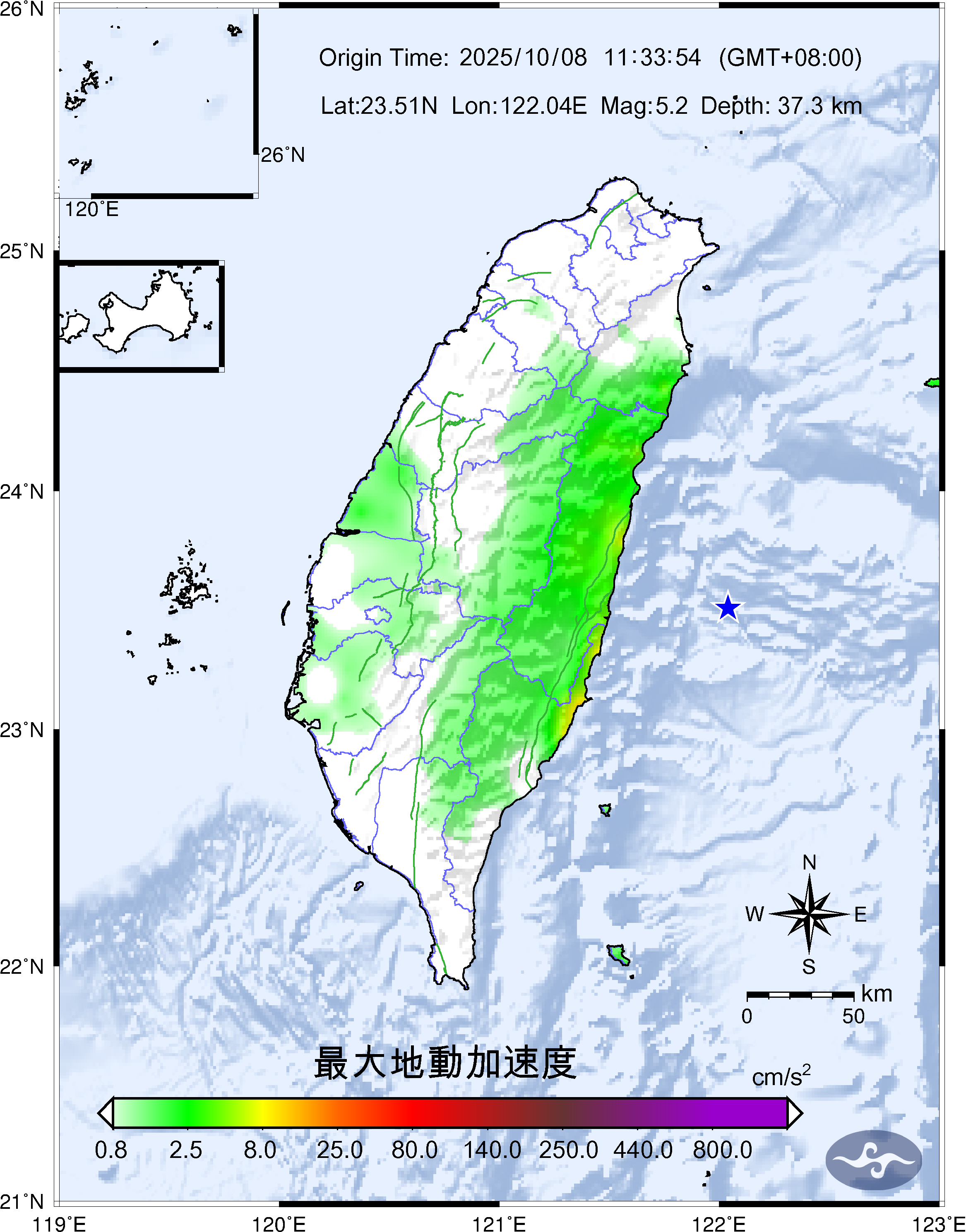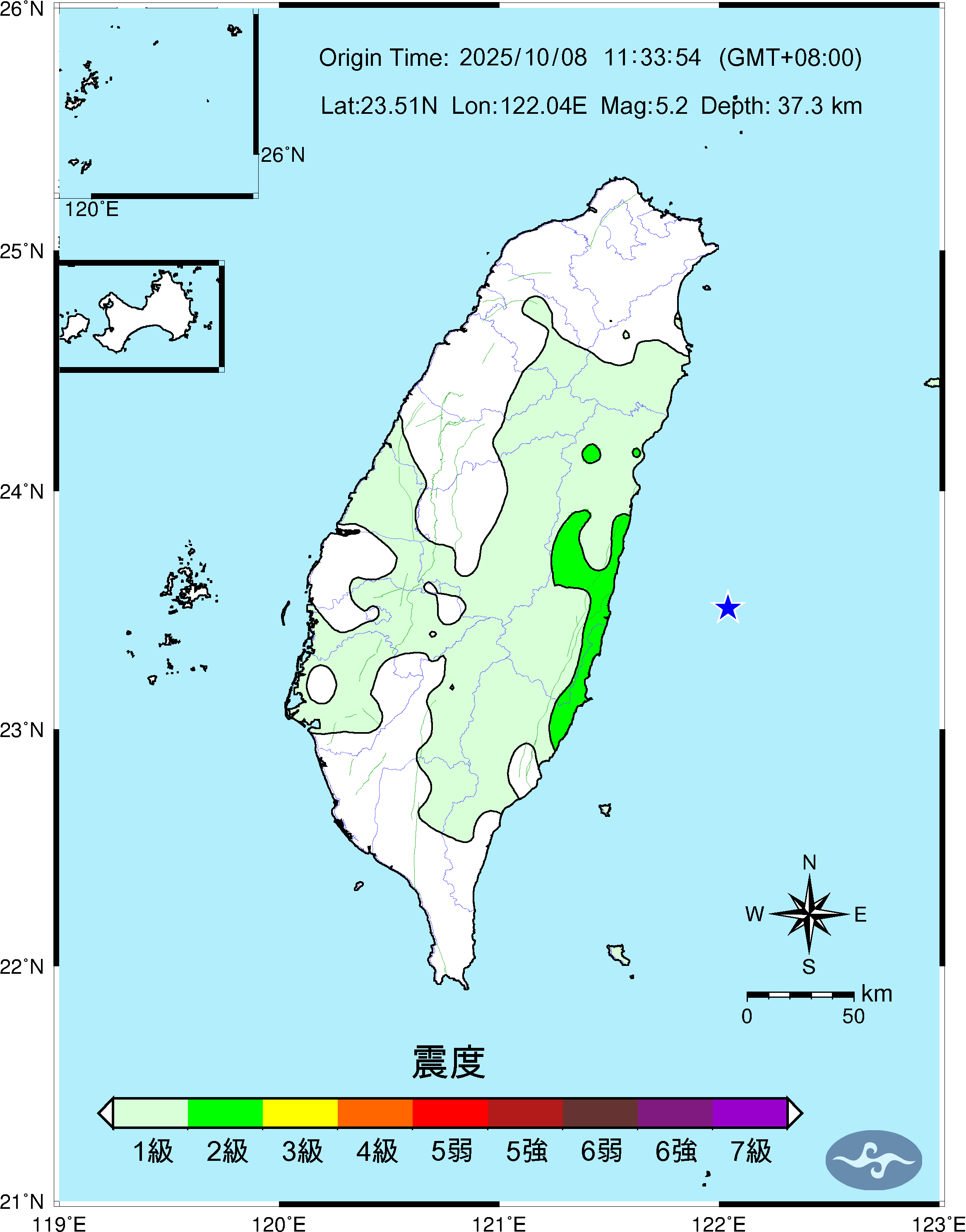 Origin Time:2025/10/08 11:33:54 Lon:122.04°E Lat:23.51°N Depth:37.3km
