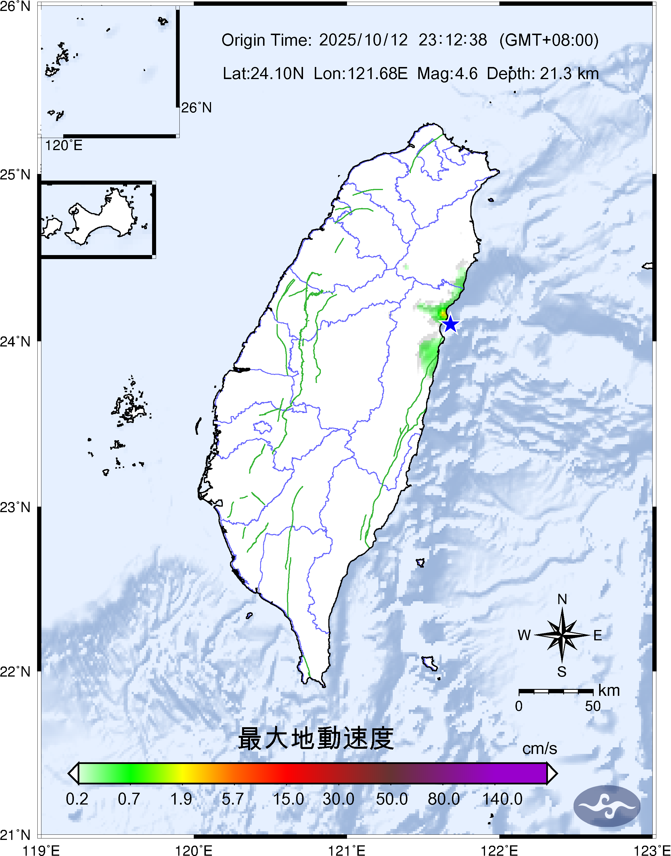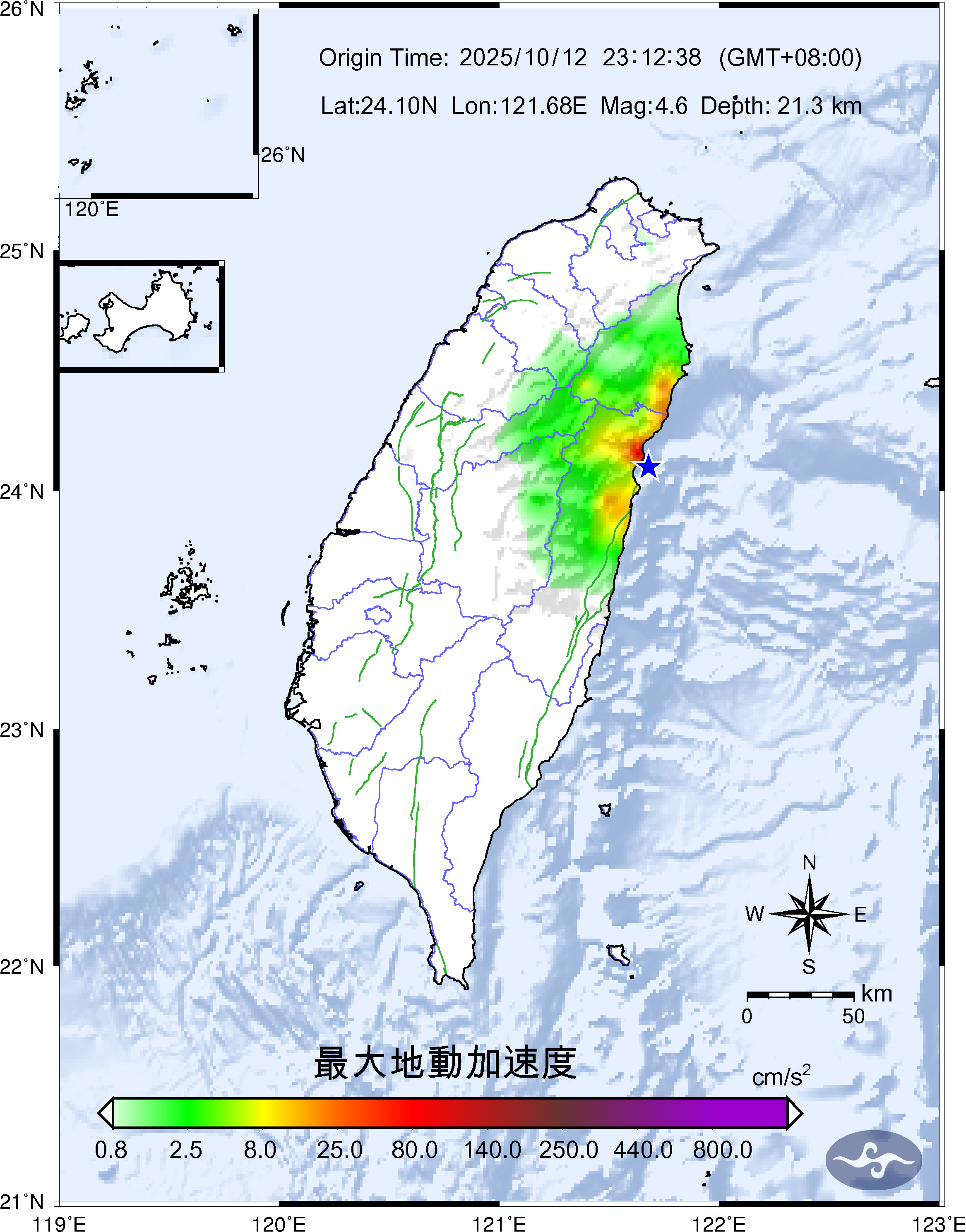 Origin Time:2025/10/12 23:12:38 Lon:121.68°E Lat:24.10°N Depth:21.3km
