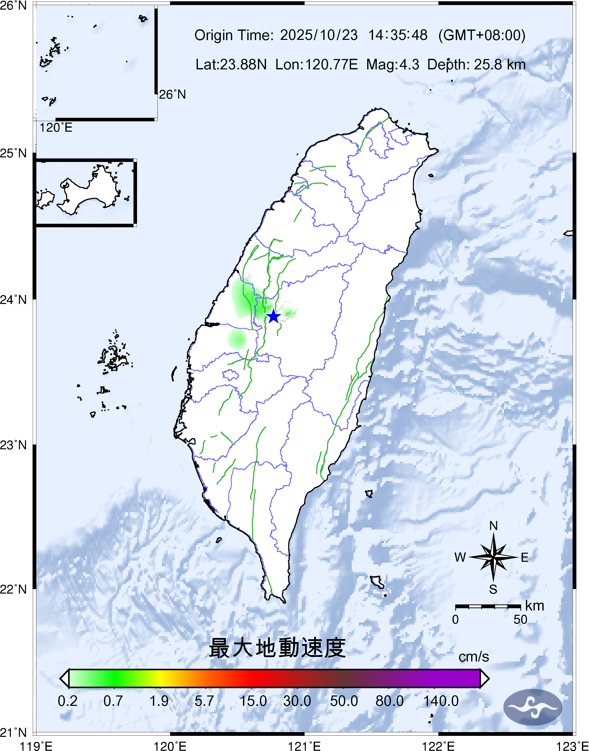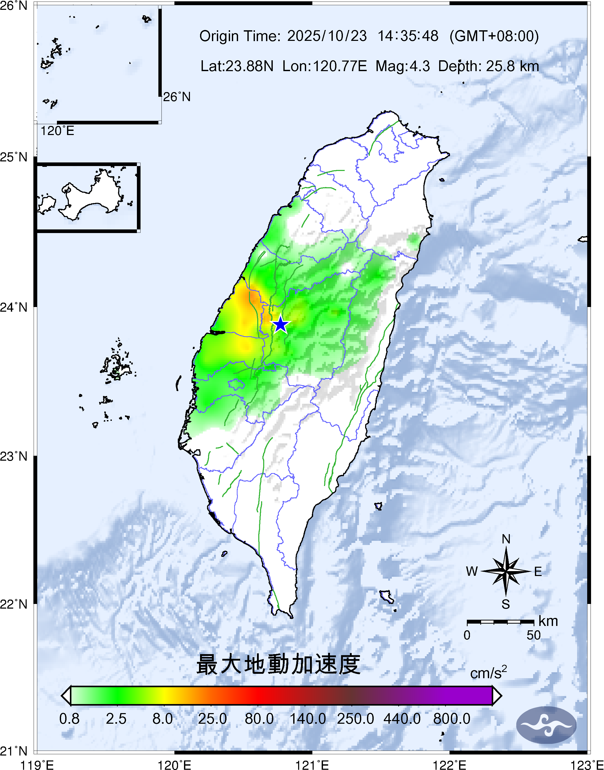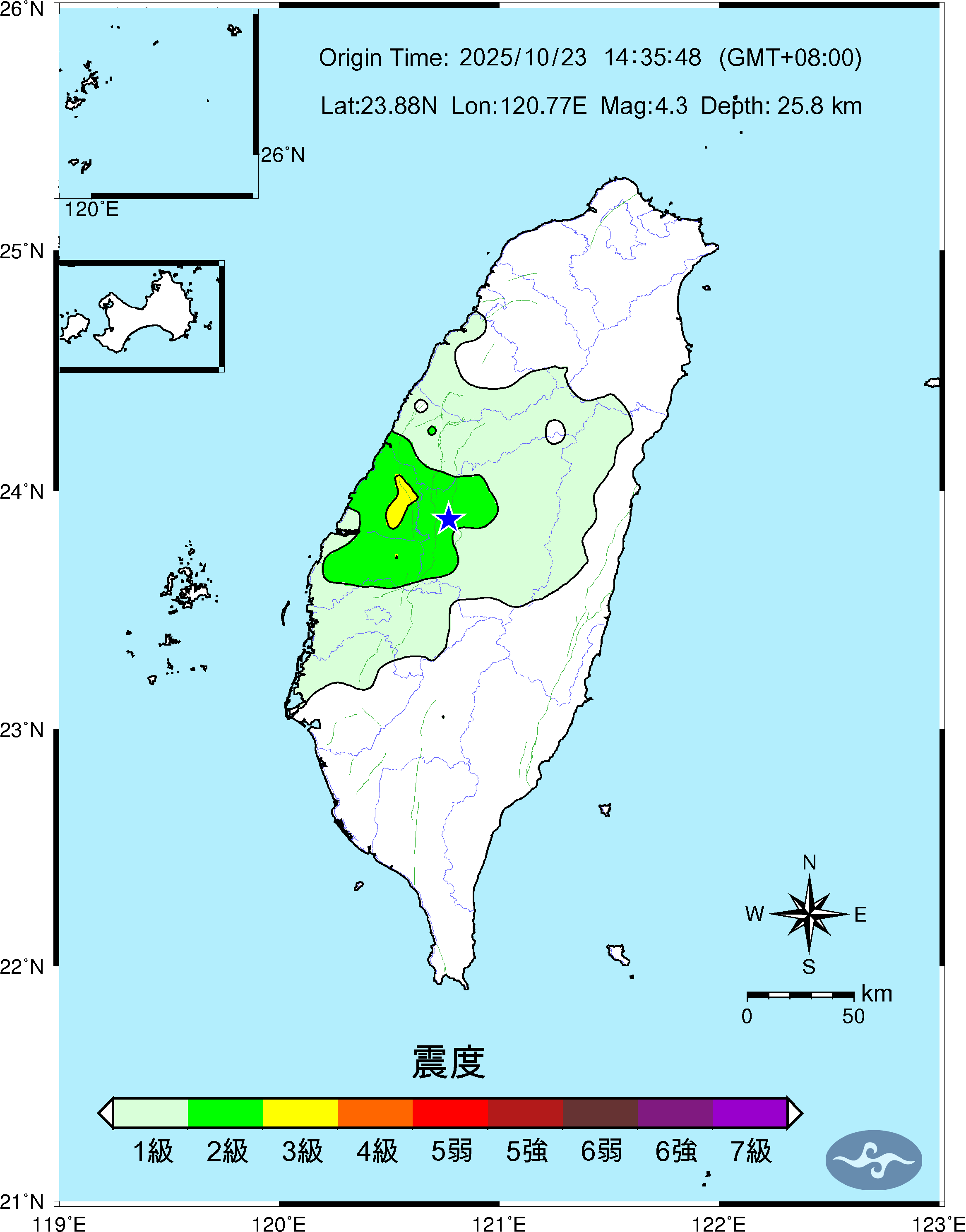 Origin Time:2025/10/23 14:35:48 Lon:120.77°E Lat:23.88°N Depth:25.8km