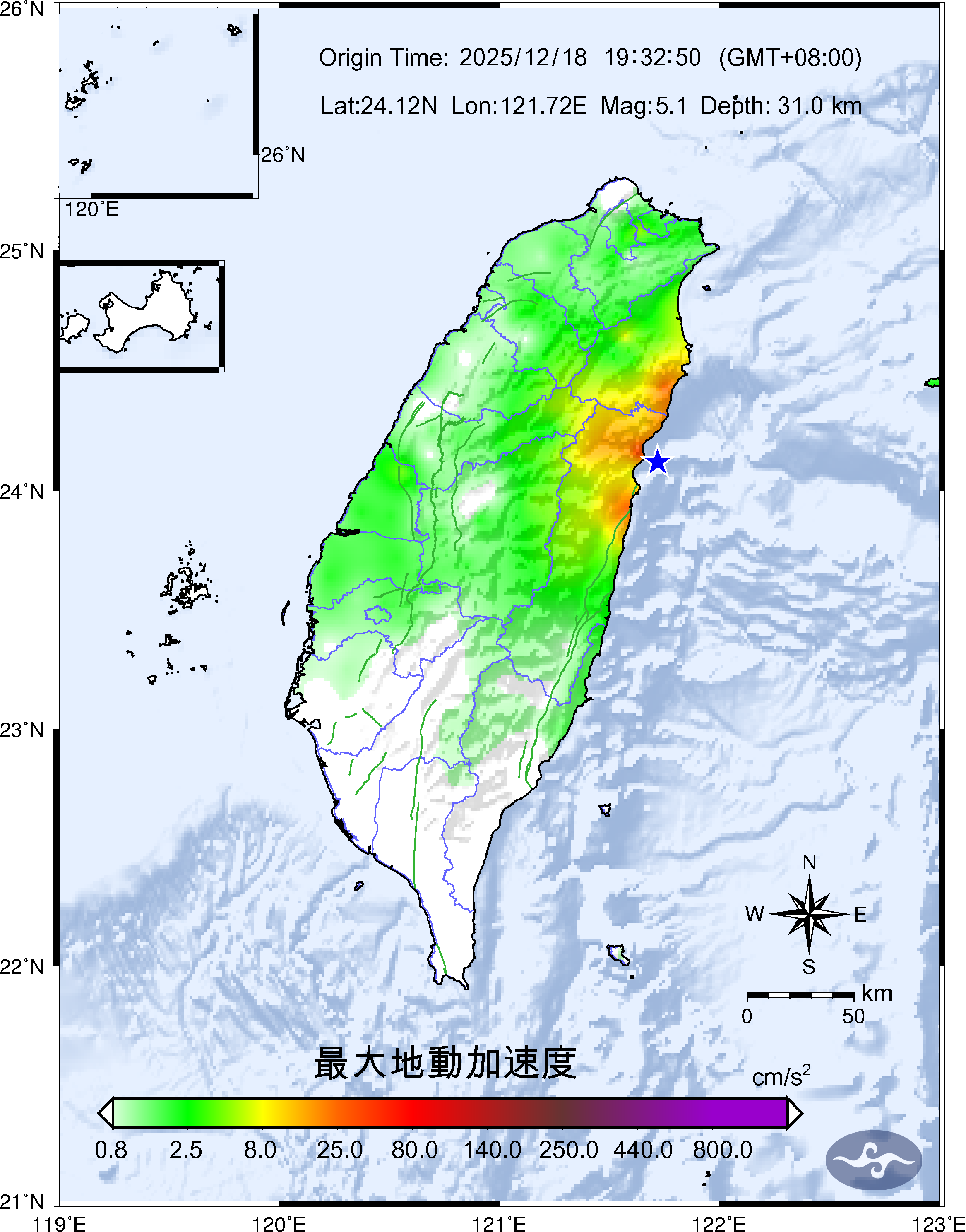 Origin Time:2025/12/18 19:32:50 Lon:121.72°E Lat:24.12°N Depth:31.0km