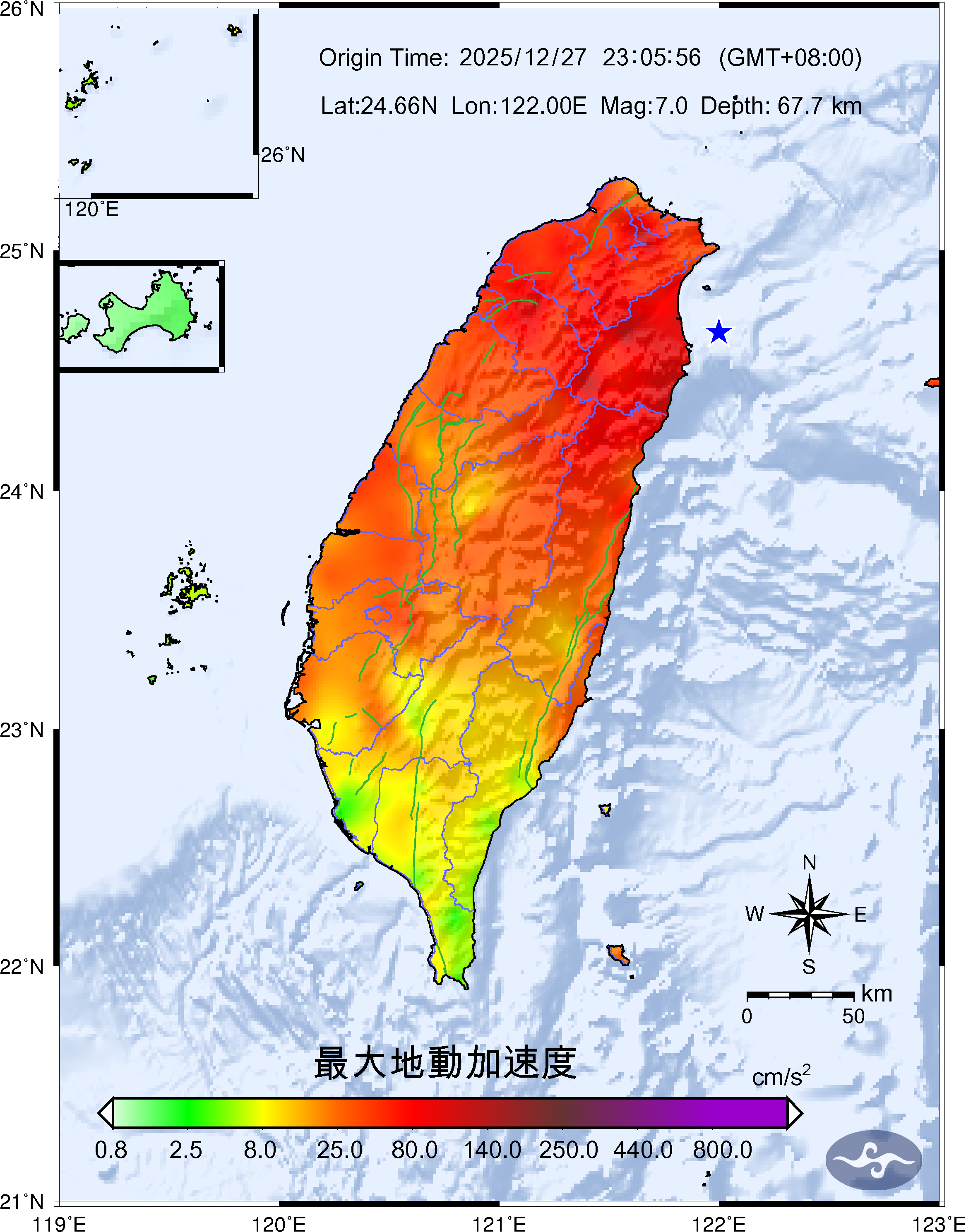 Origin Time:2025/12/27 23:05:56 Lon:122.00°E Lat:24.66°N Depth:67.7km