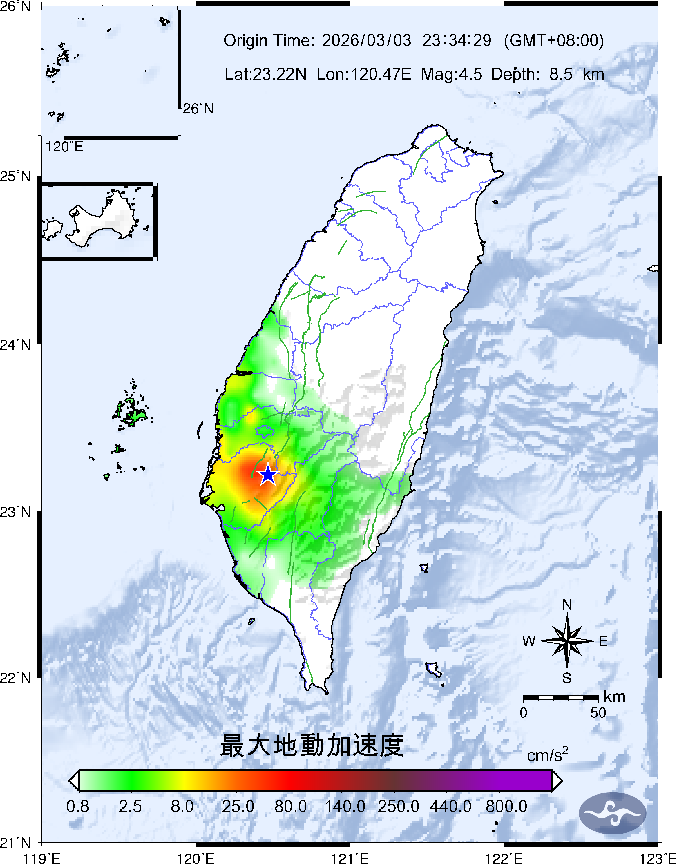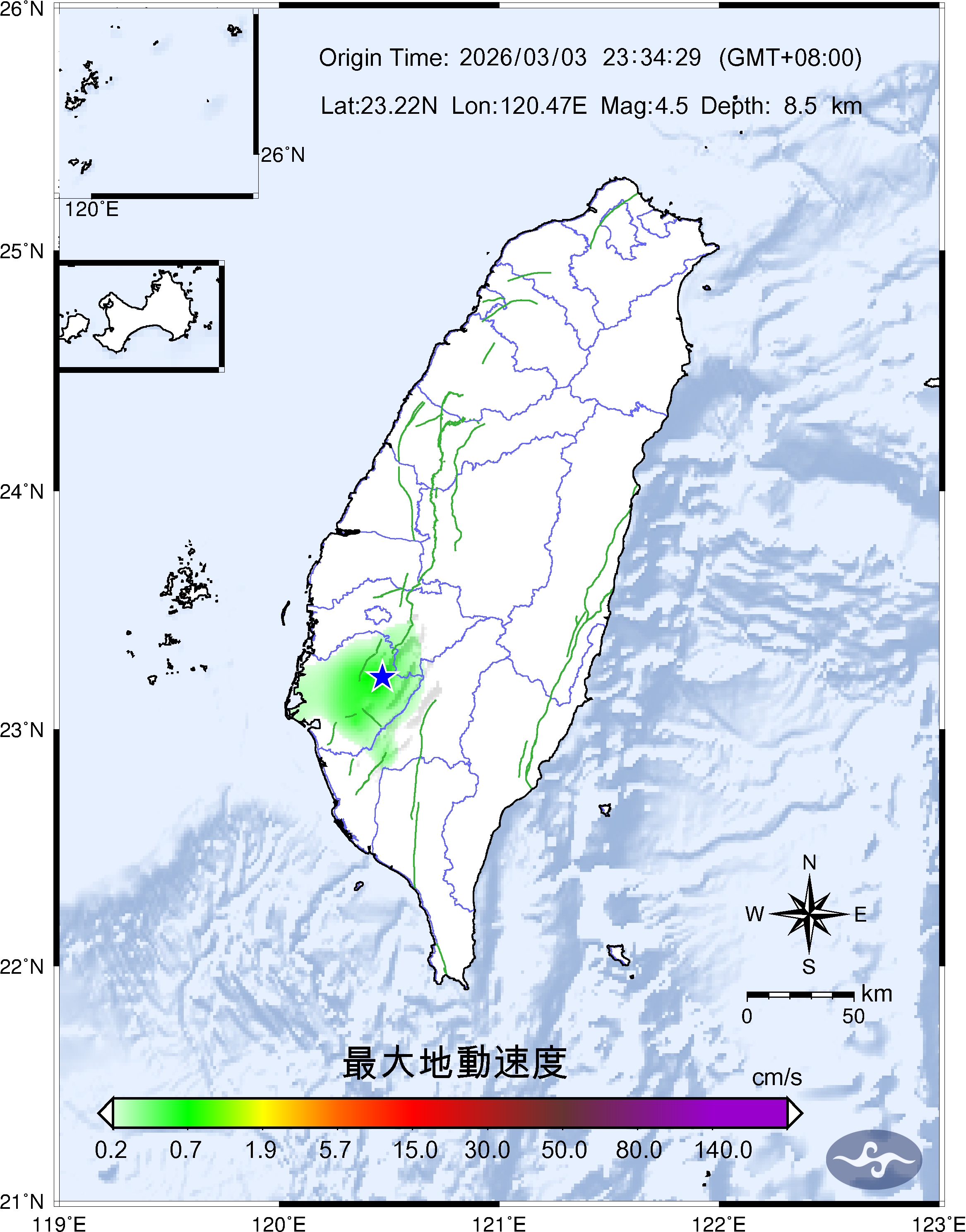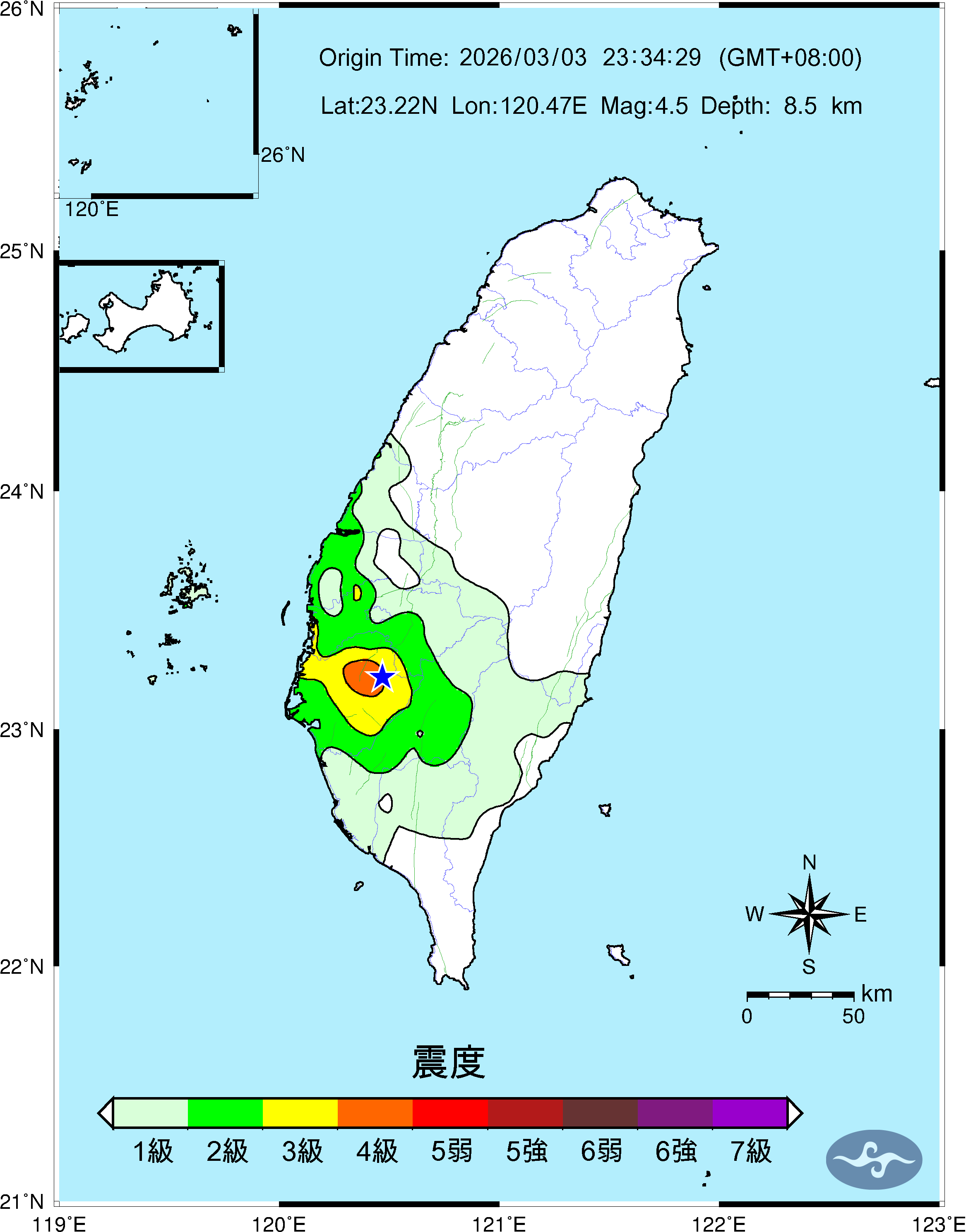 Origin Time:2026/03/03 23:34:29 Lon:120.47°E Lat:23.22°N Depth:8.5km