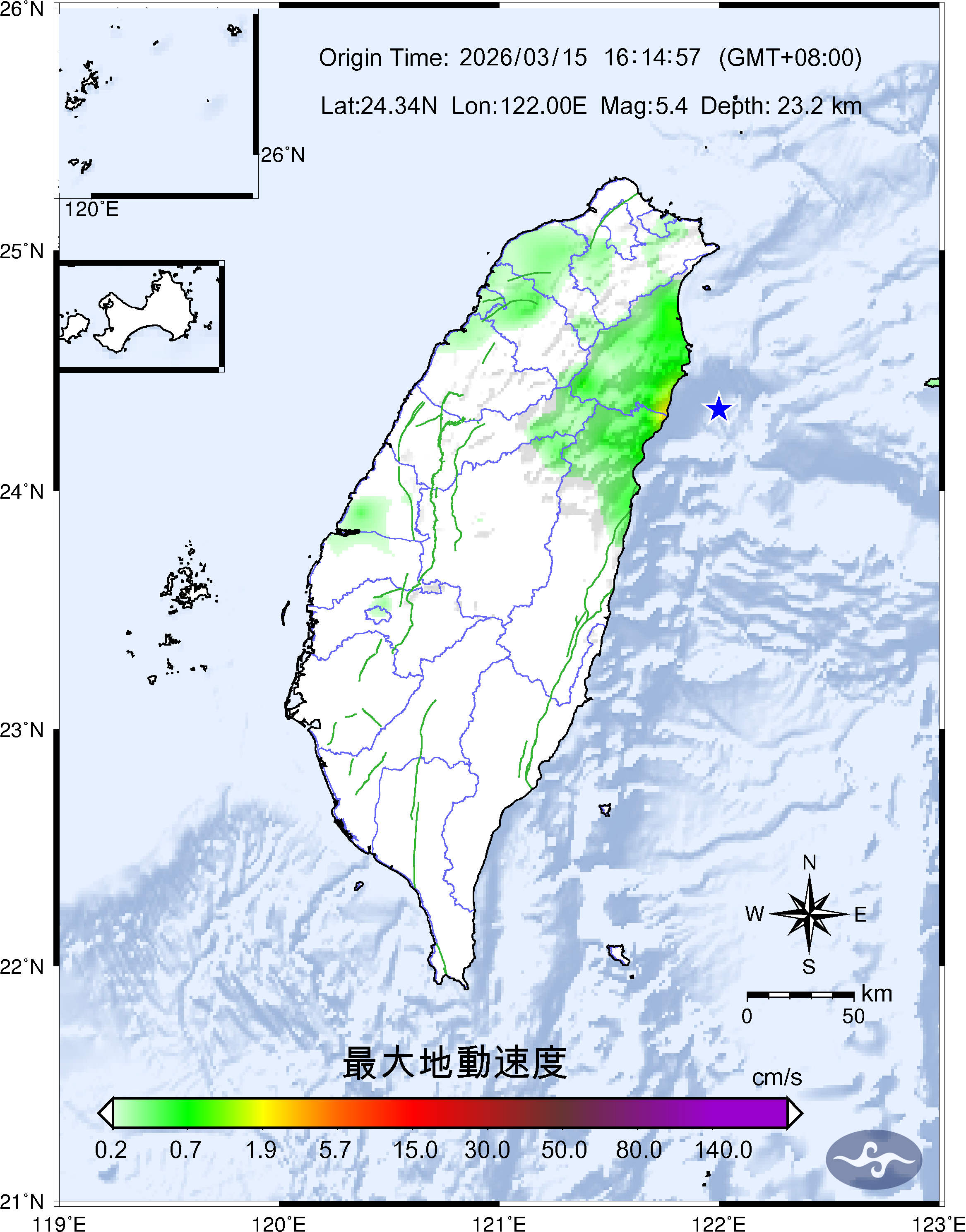 Origin Time:2026/03/15 16:14:57 Lon:122.00°E Lat:24.34°N Depth:23.2km