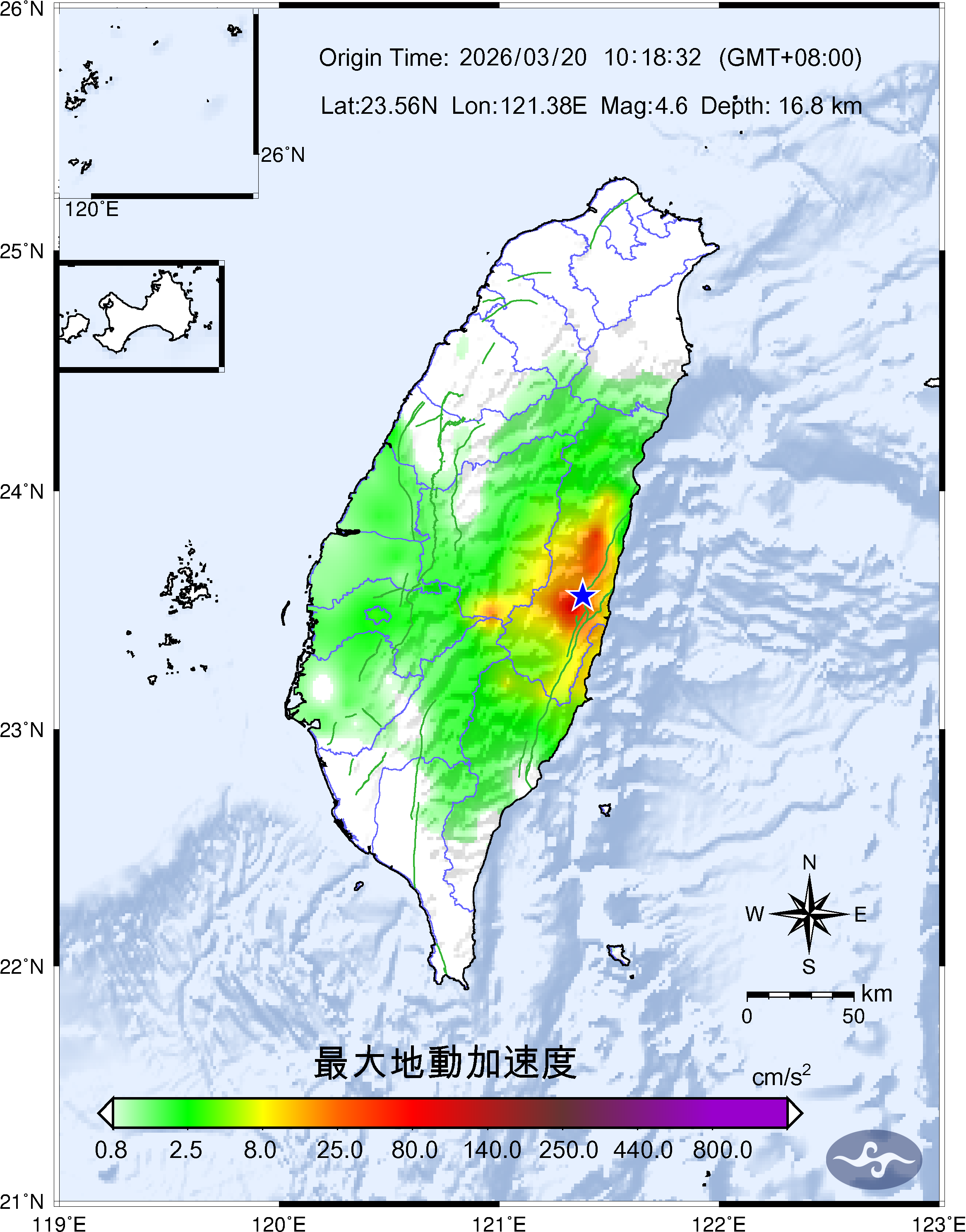 Origin Time:2026/03/20 10:18:32 Lon:121.38°E Lat:23.56°N Depth:16.8km