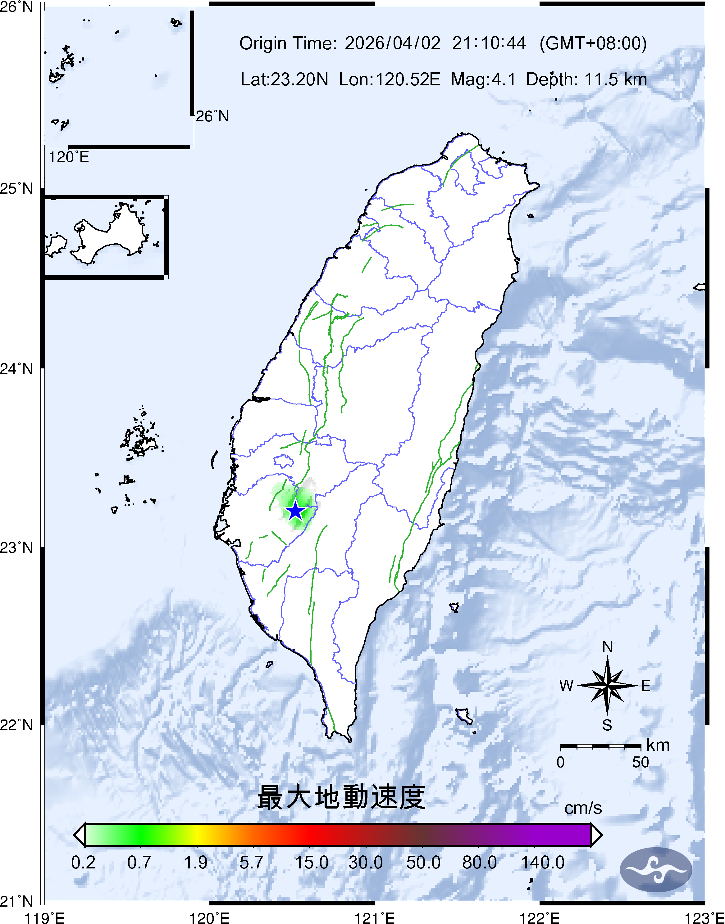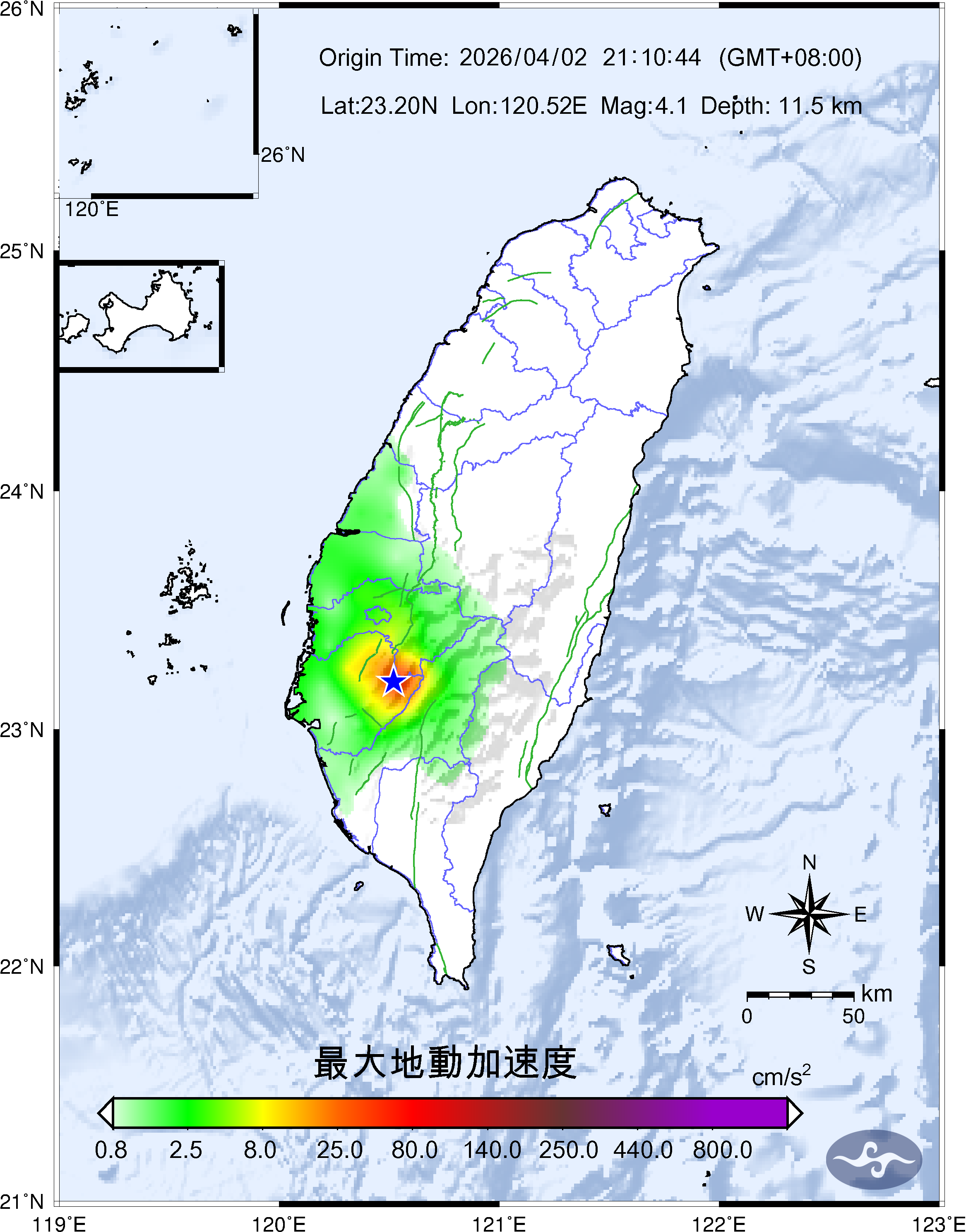 Origin Time:2026/04/02 21:10:44 Lon:120.52°E Lat:23.20°N Depth:11.5km