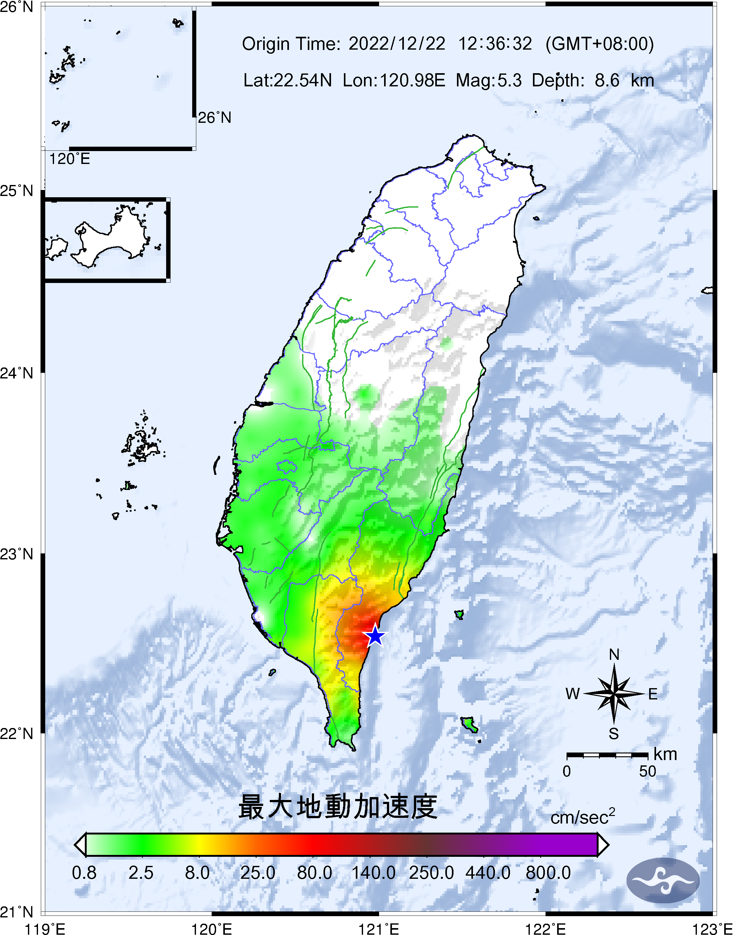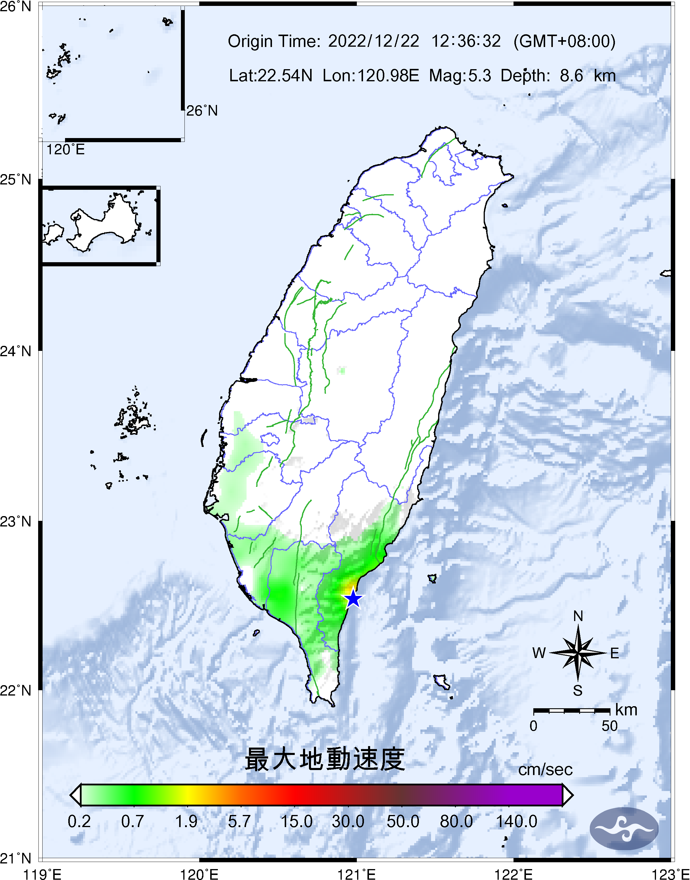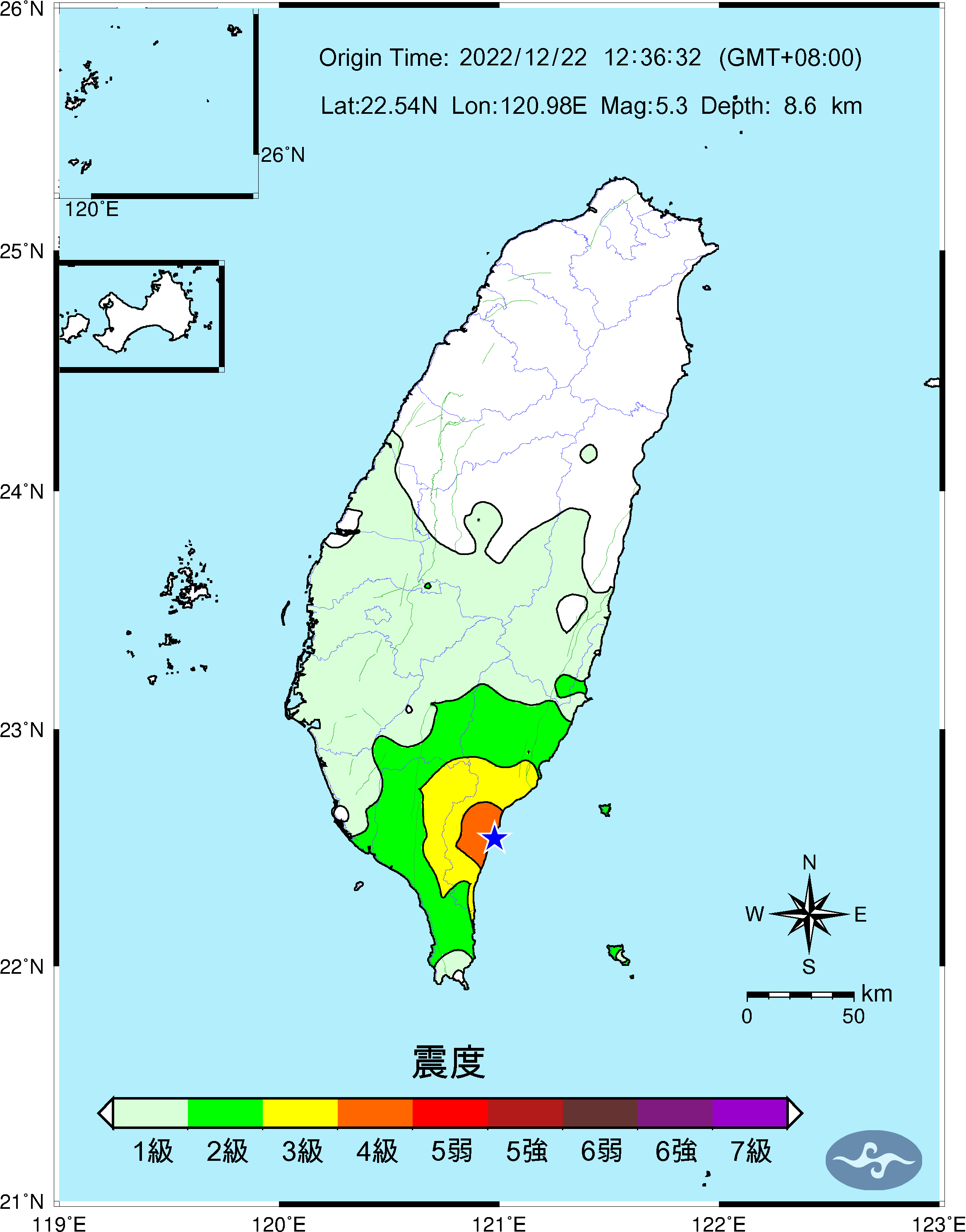 Origin Time:2022/12/22 12:36:32 Lon:120.98°E Lat:22.54°N Depth:8.6km