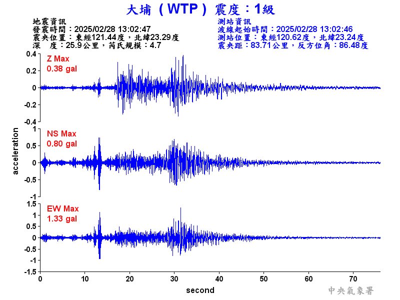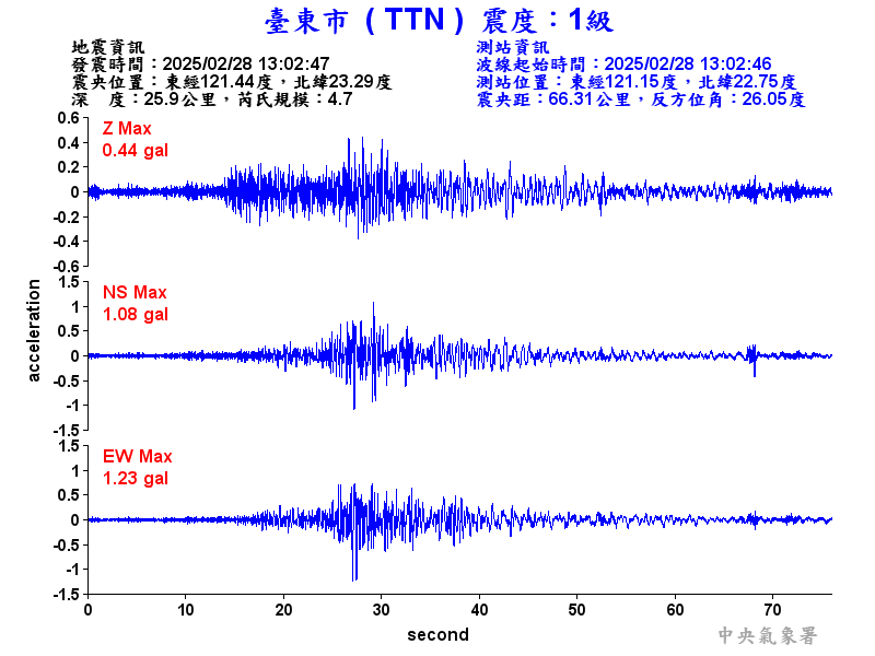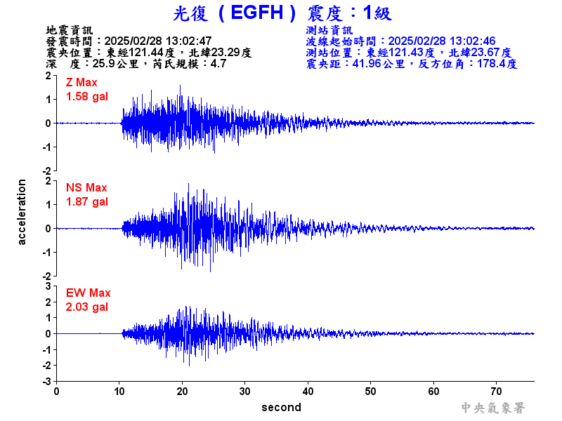 Origin Time:2025/02/28 13:02:47 Lon:121.44°E Lat:23.29°N Depth:25.9km