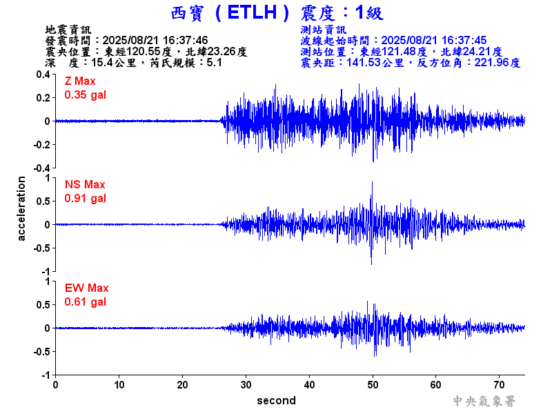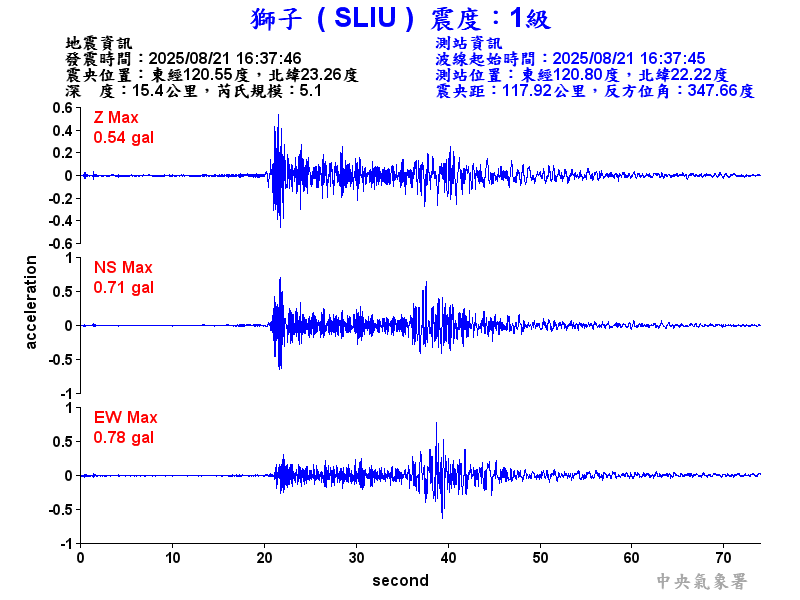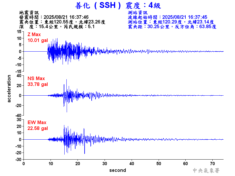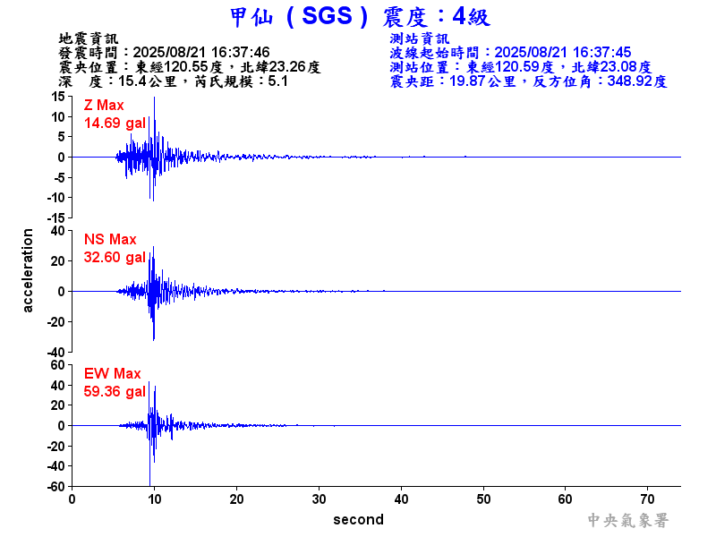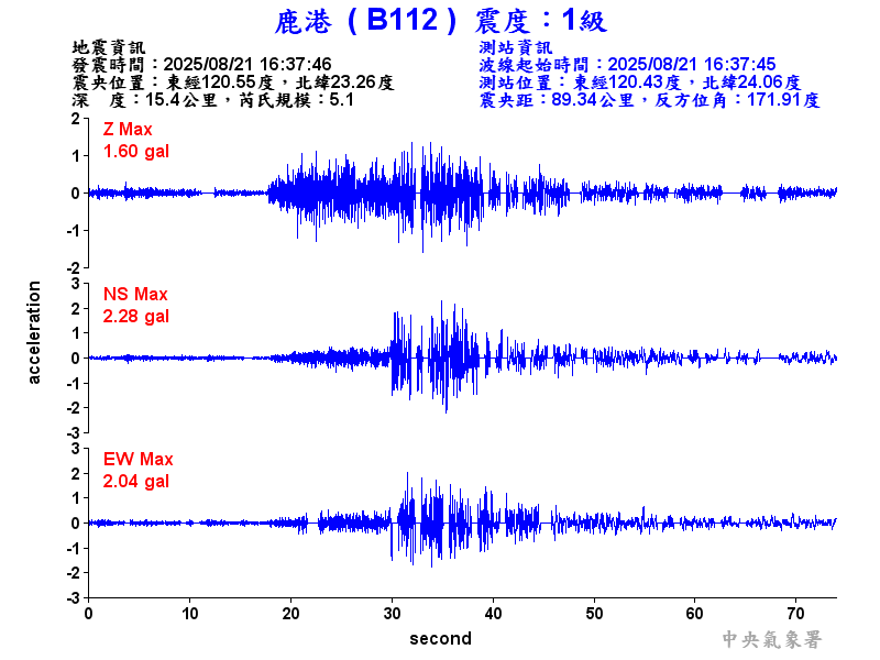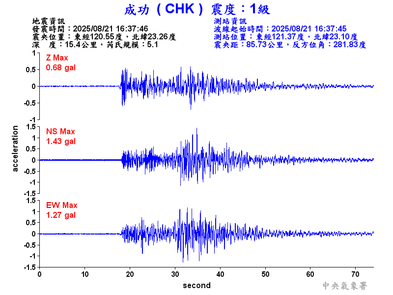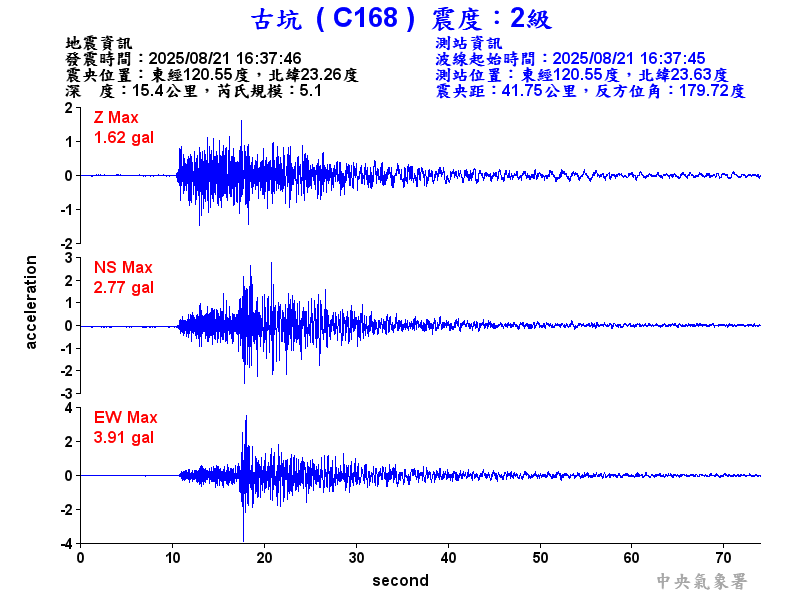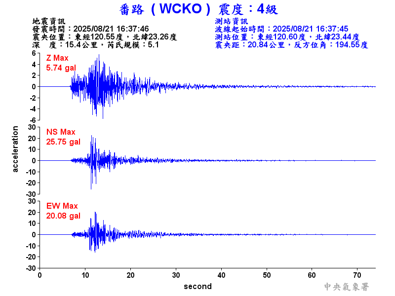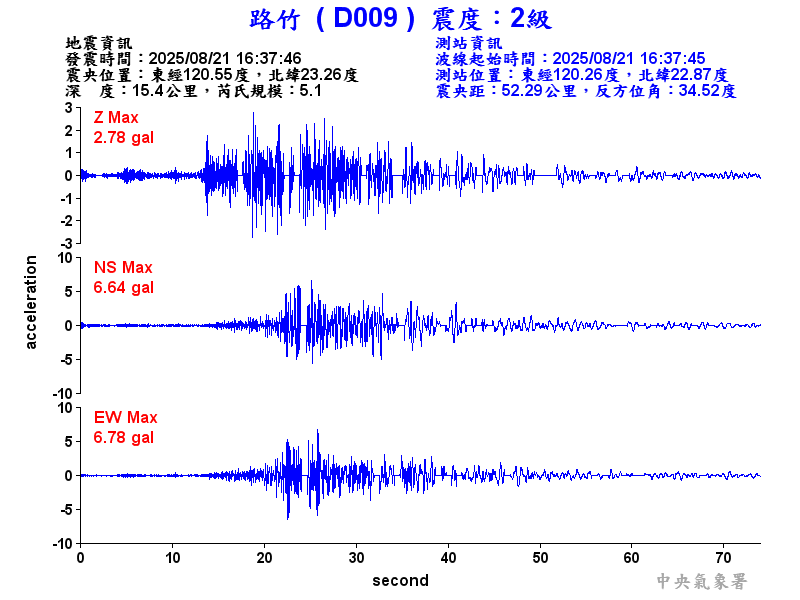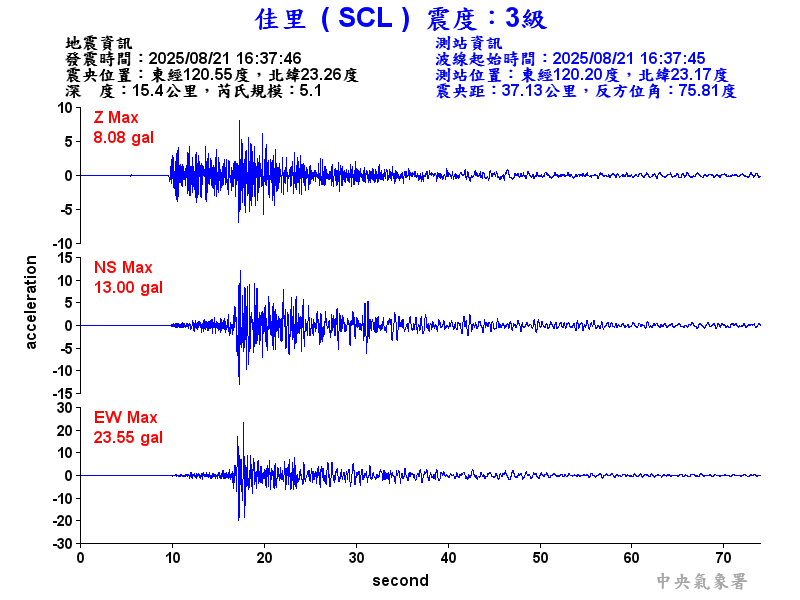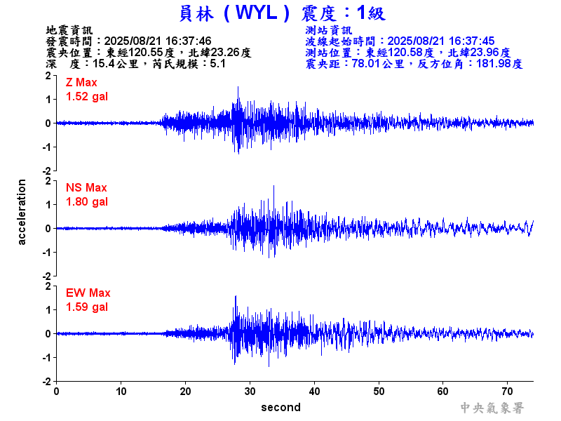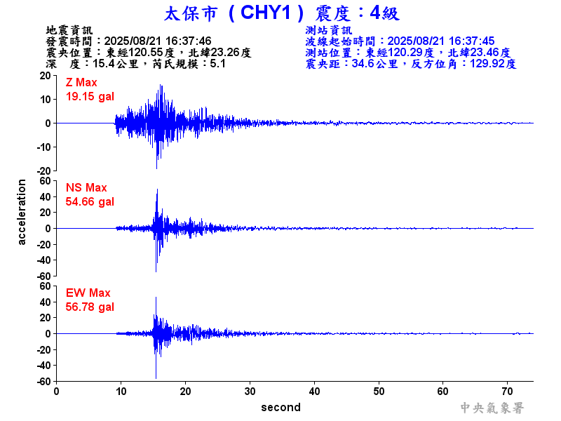 Origin Time:2025/08/21 16:37:46 Lon:120.55°E Lat:23.26°N Depth:15.4km