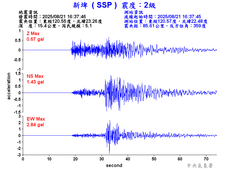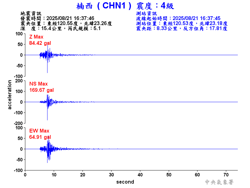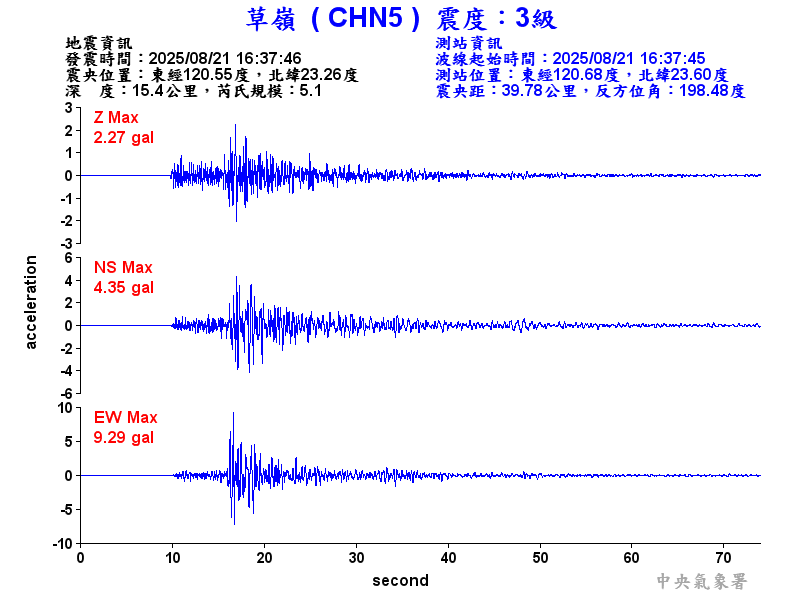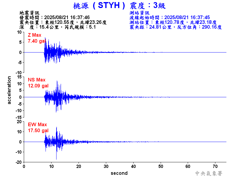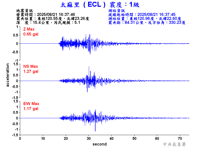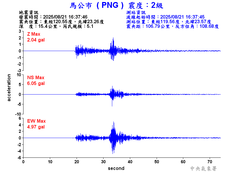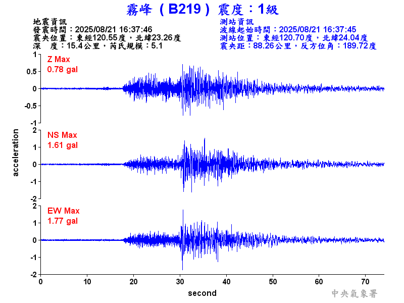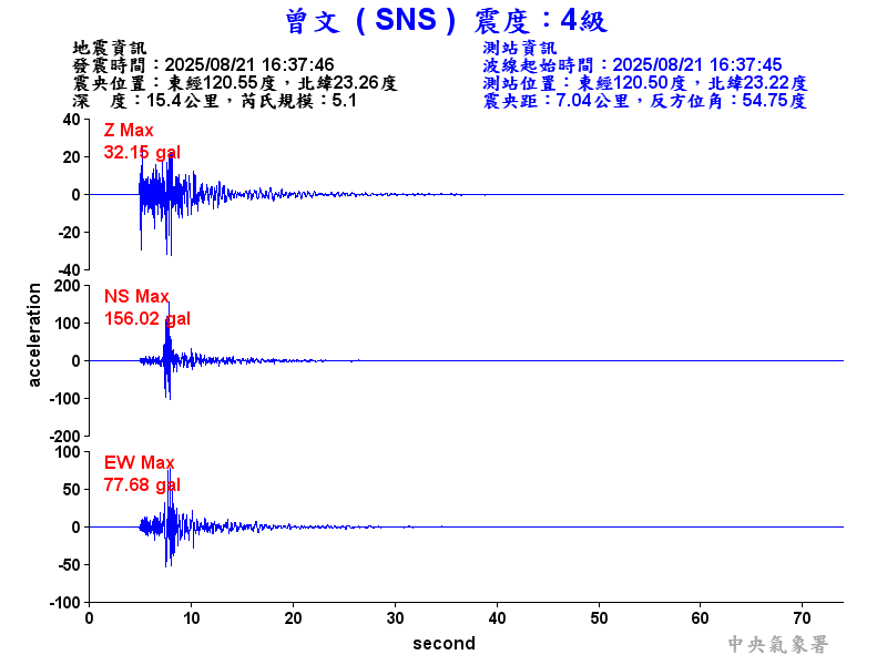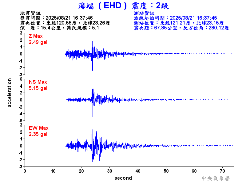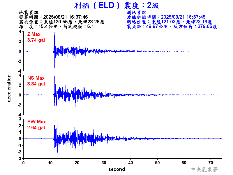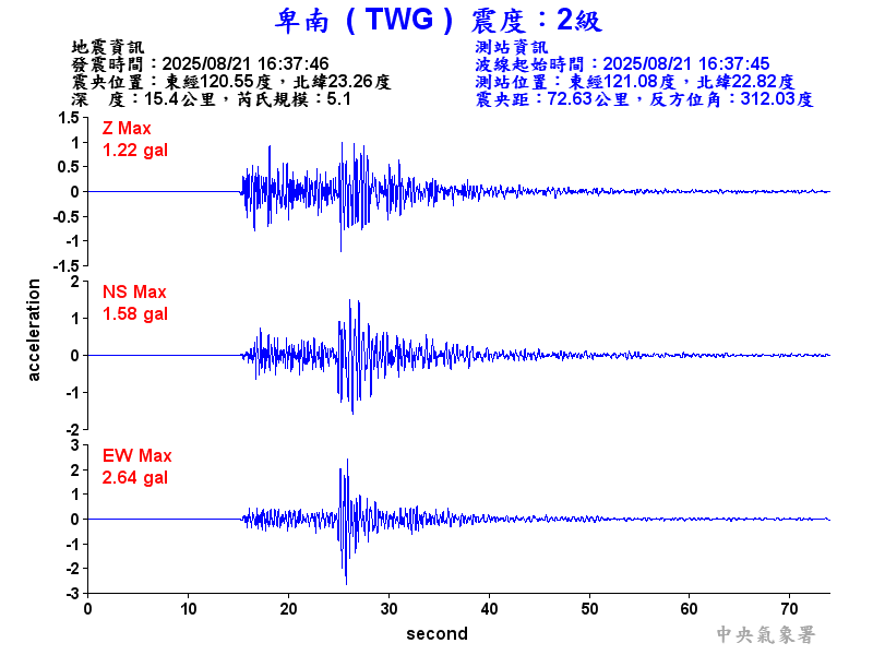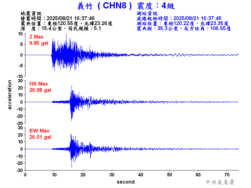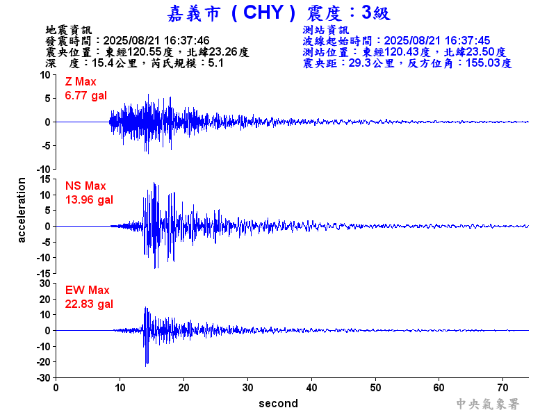 Origin Time:2025/08/21 16:37:46 Lon:120.55°E Lat:23.26°N Depth:15.4km