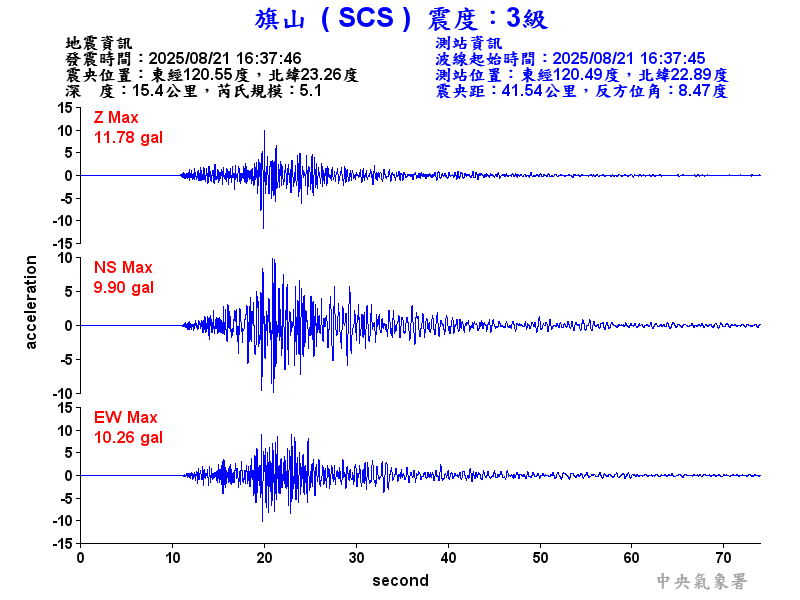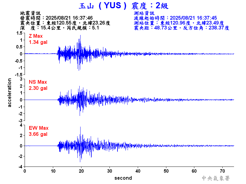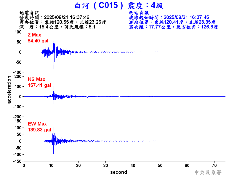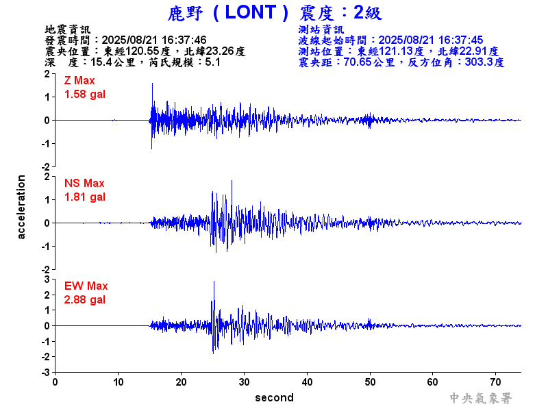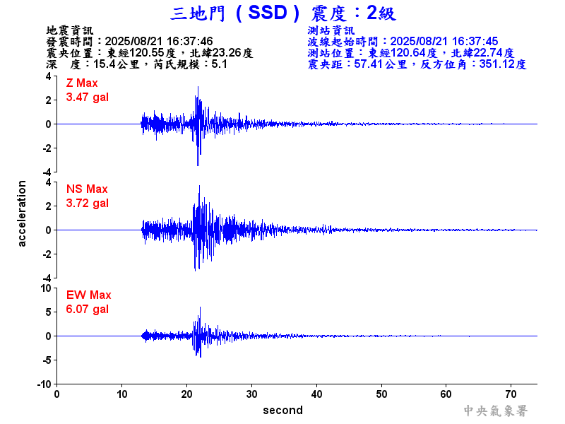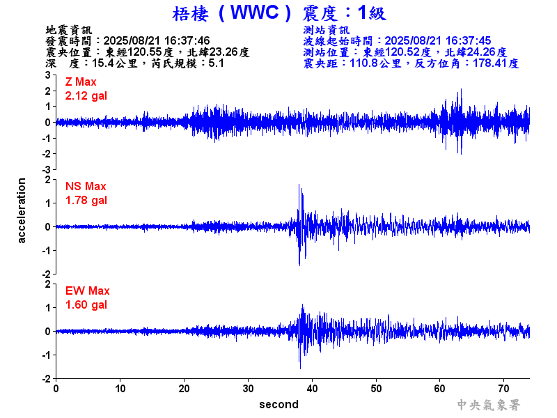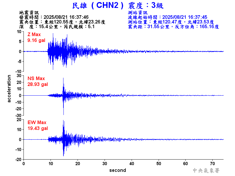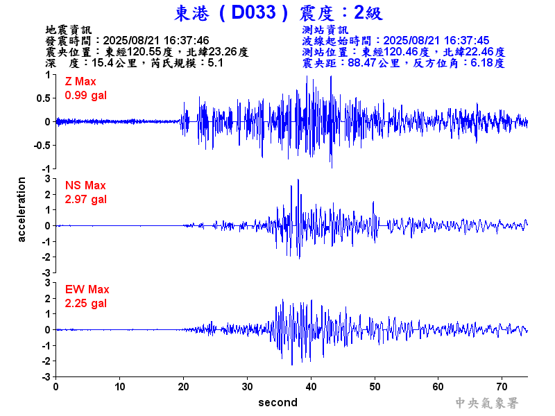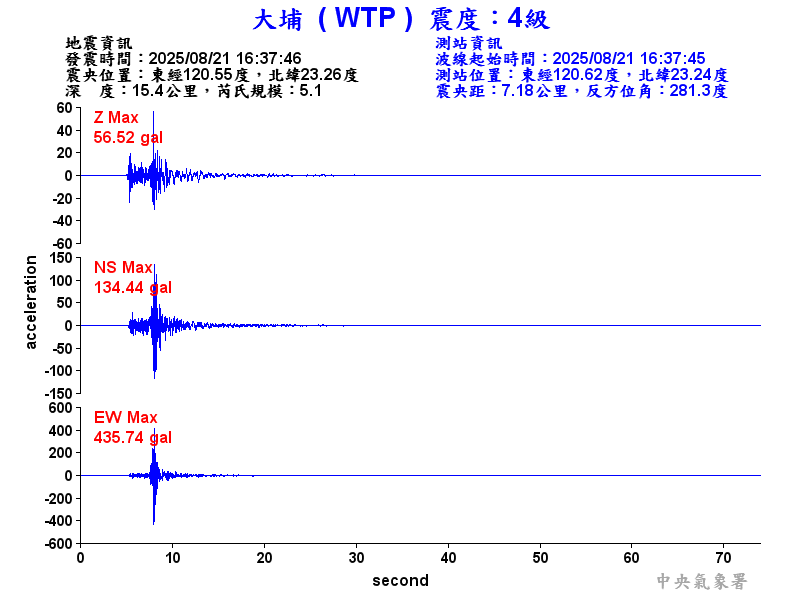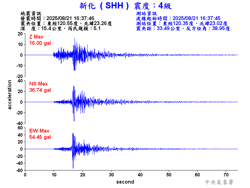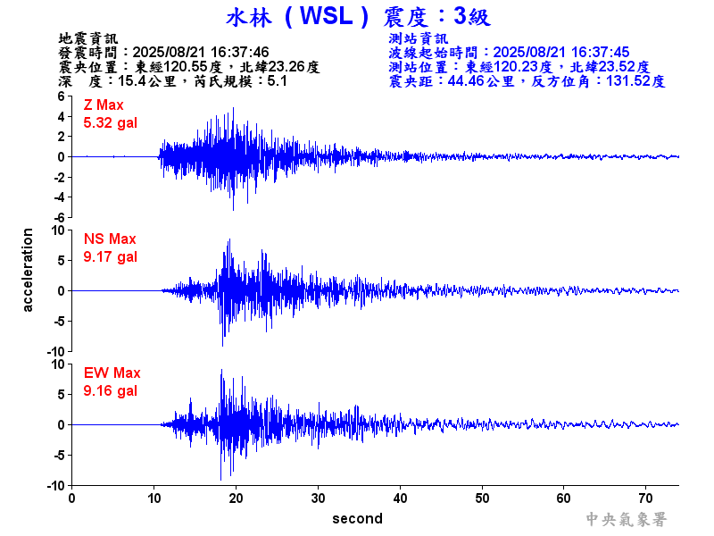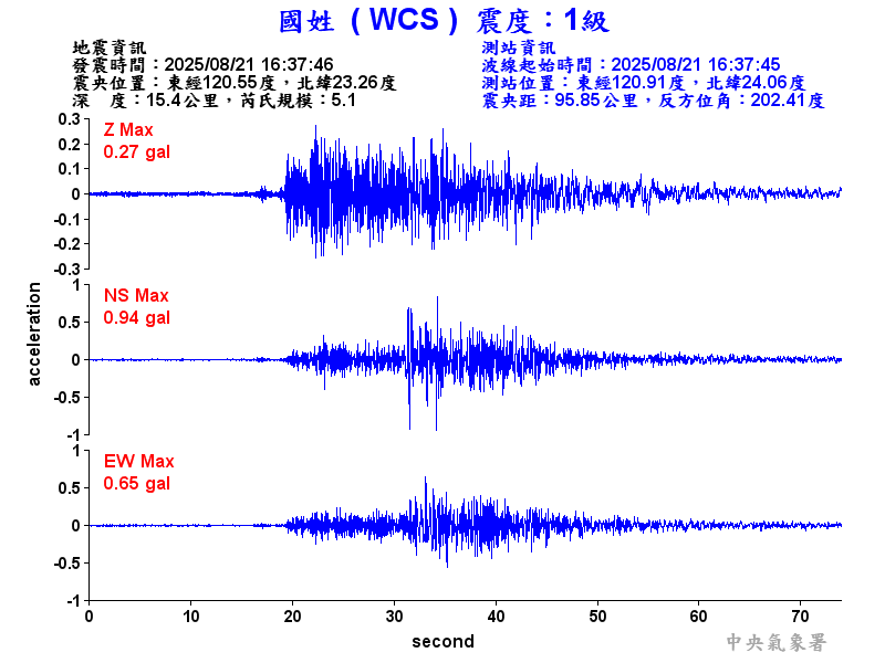 Origin Time:2025/08/21 16:37:46 Lon:120.55°E Lat:23.26°N Depth:15.4km