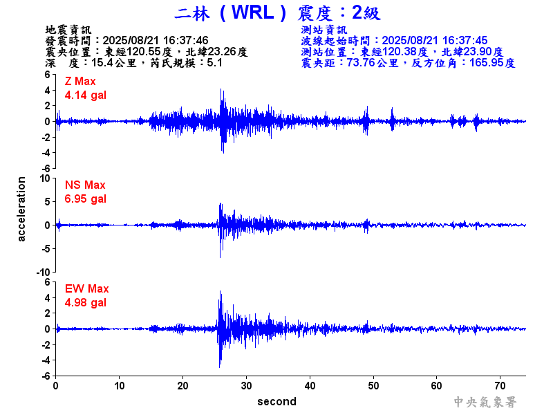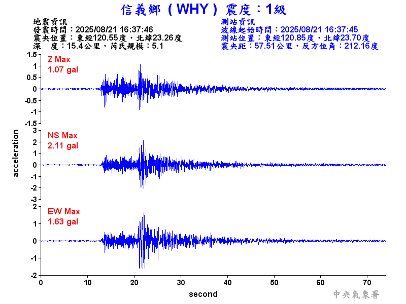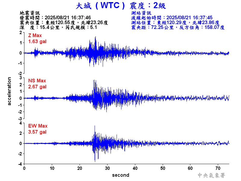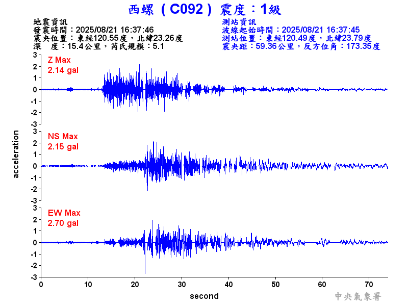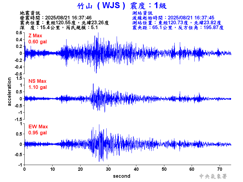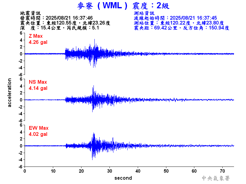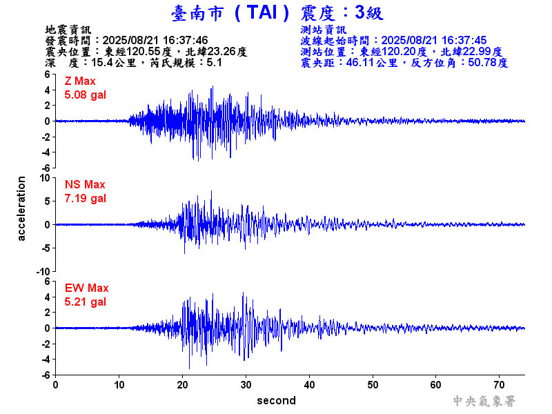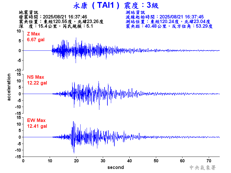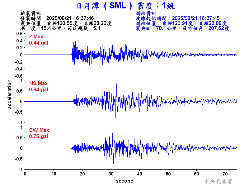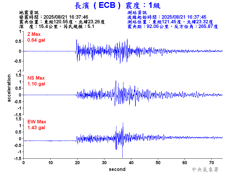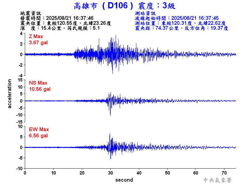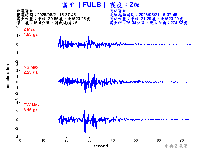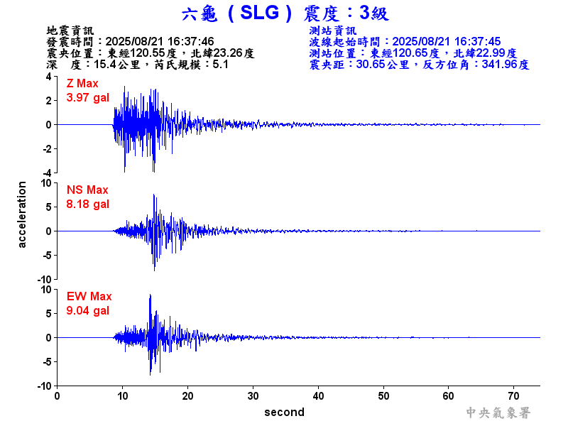 Origin Time:2025/08/21 16:37:46 Lon:120.55°E Lat:23.26°N Depth:15.4km