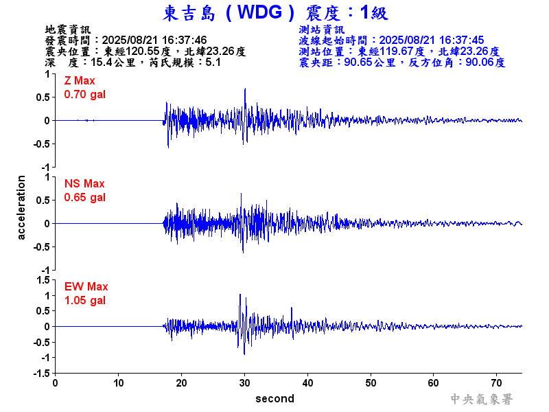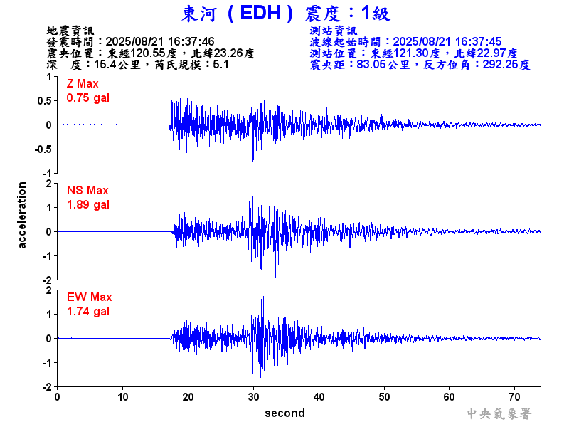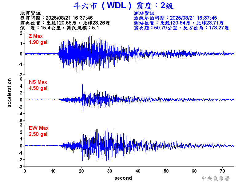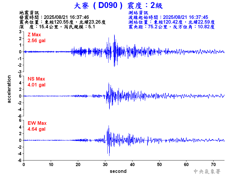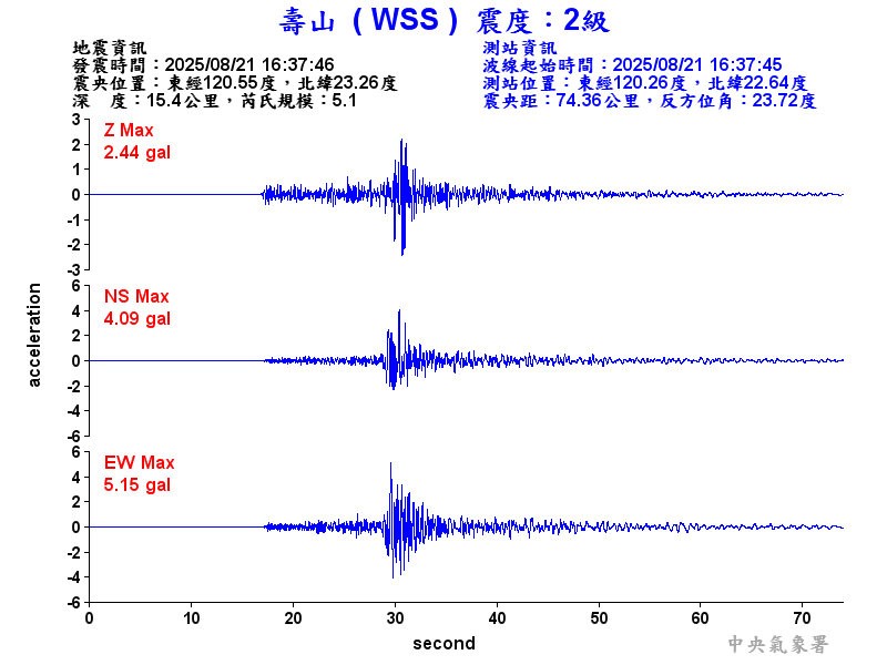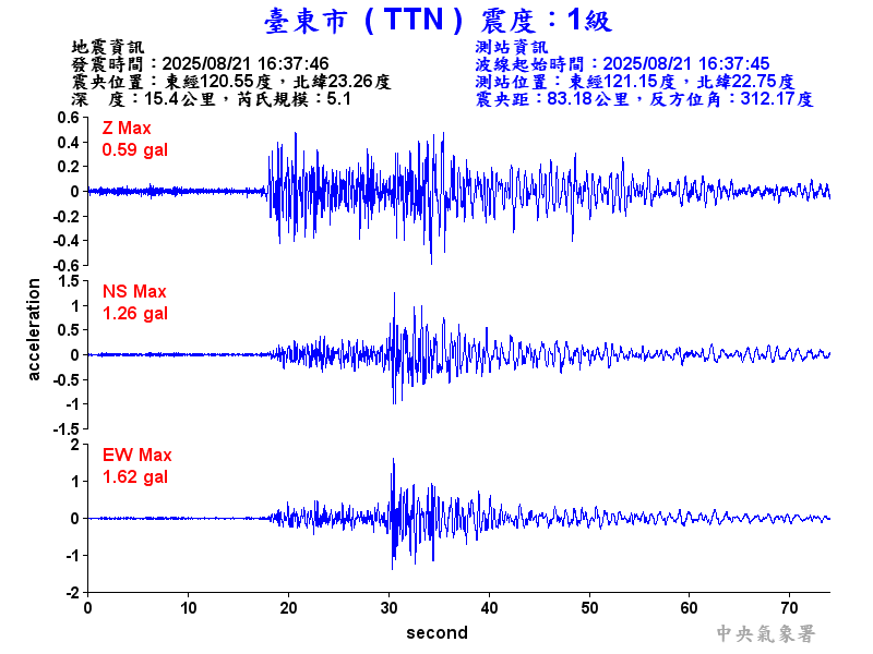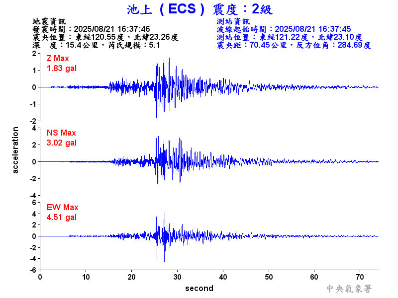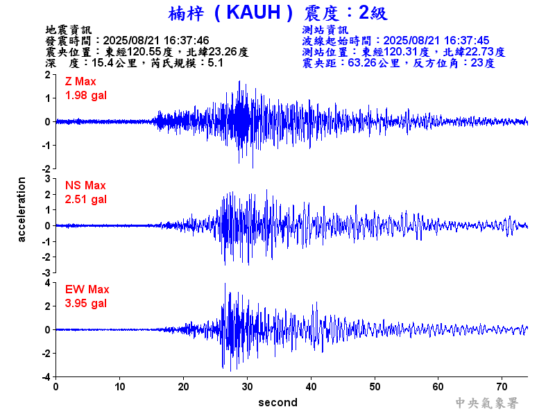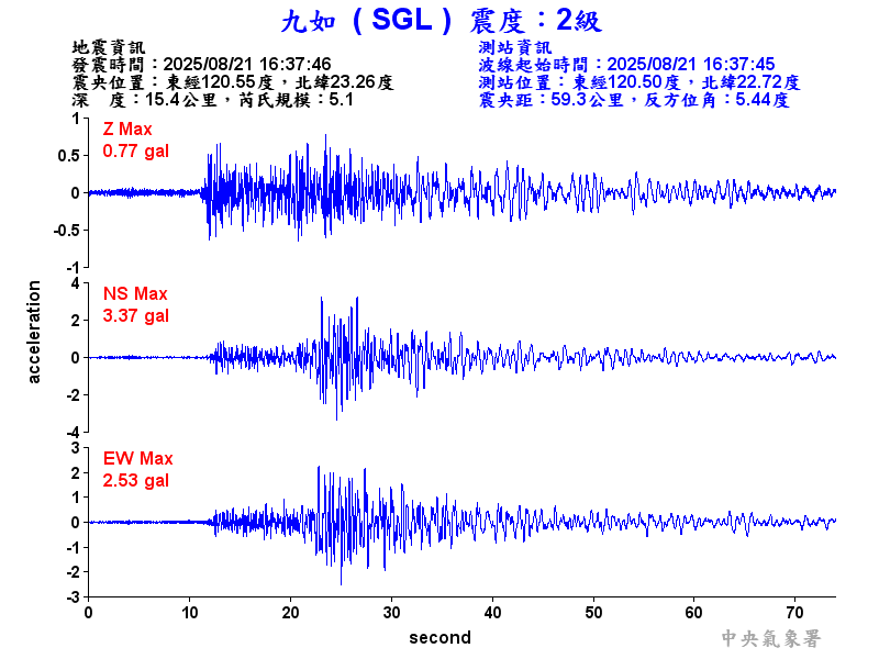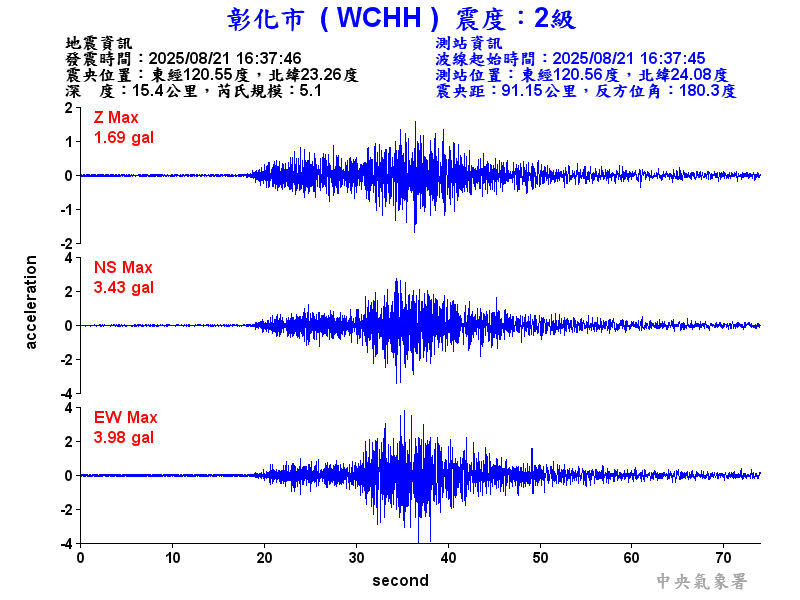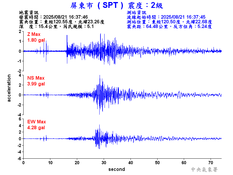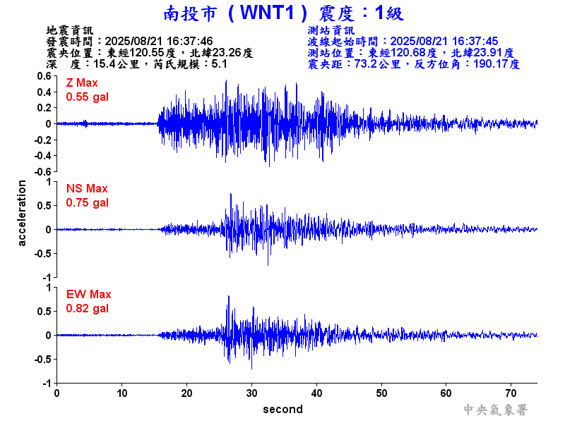 Origin Time:2025/08/21 16:37:46 Lon:120.55°E Lat:23.26°N Depth:15.4km