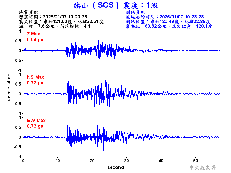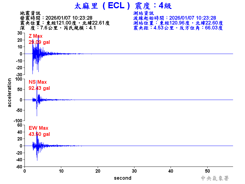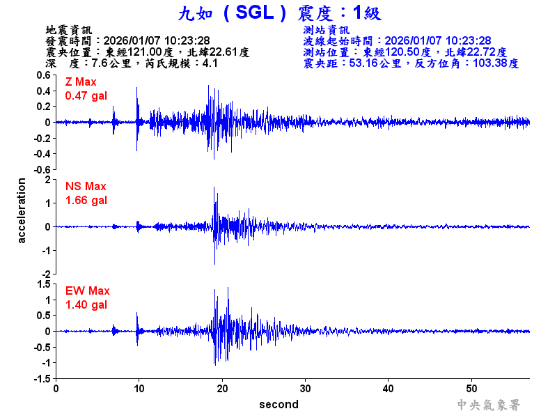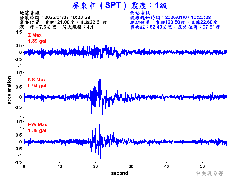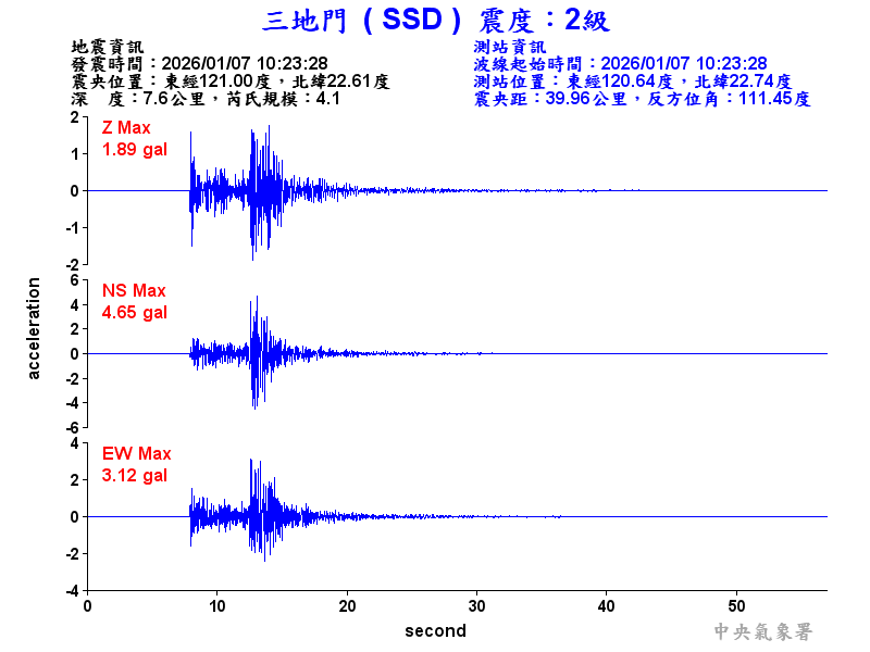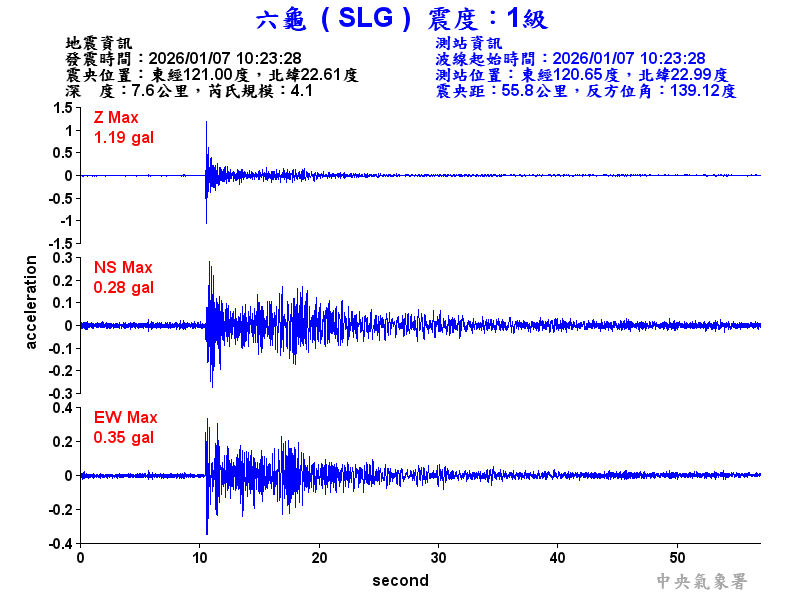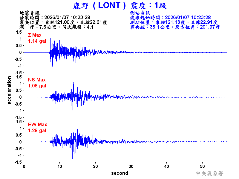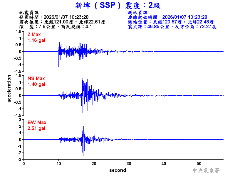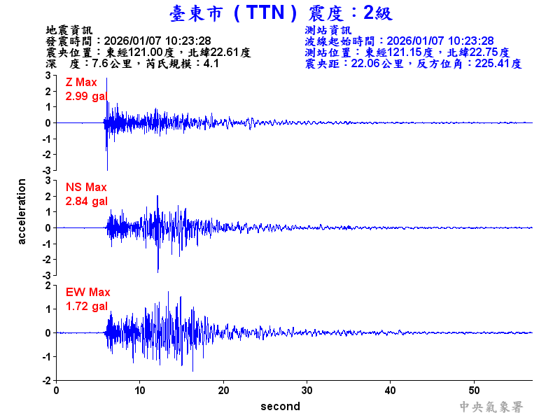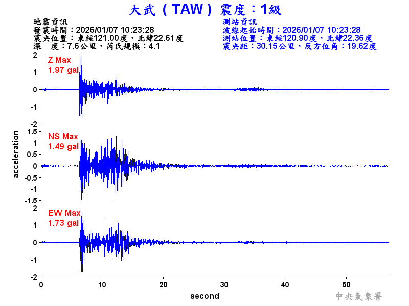 Origin Time:2026/01/07 10:23:28 Lon:121.01°E Lat:22.61°N Depth:7.3km