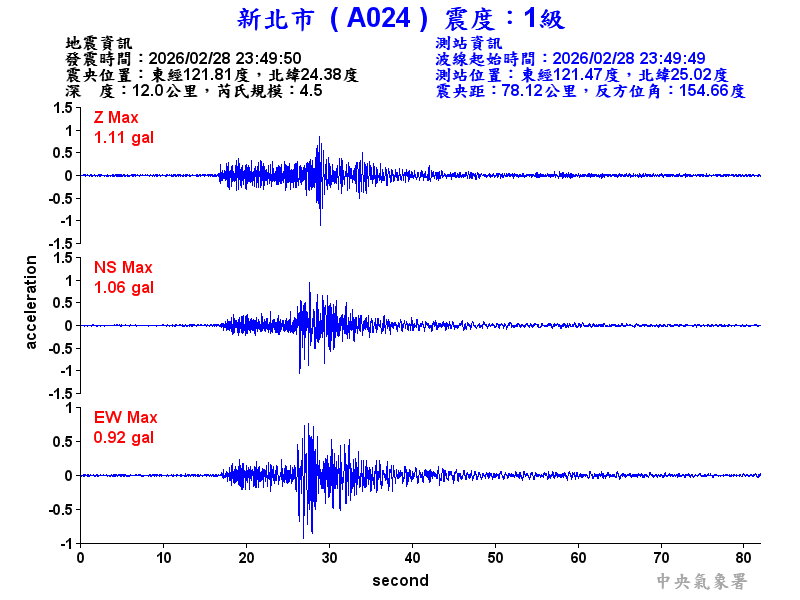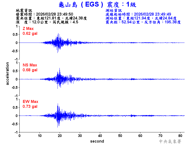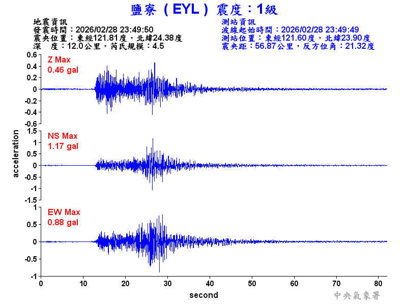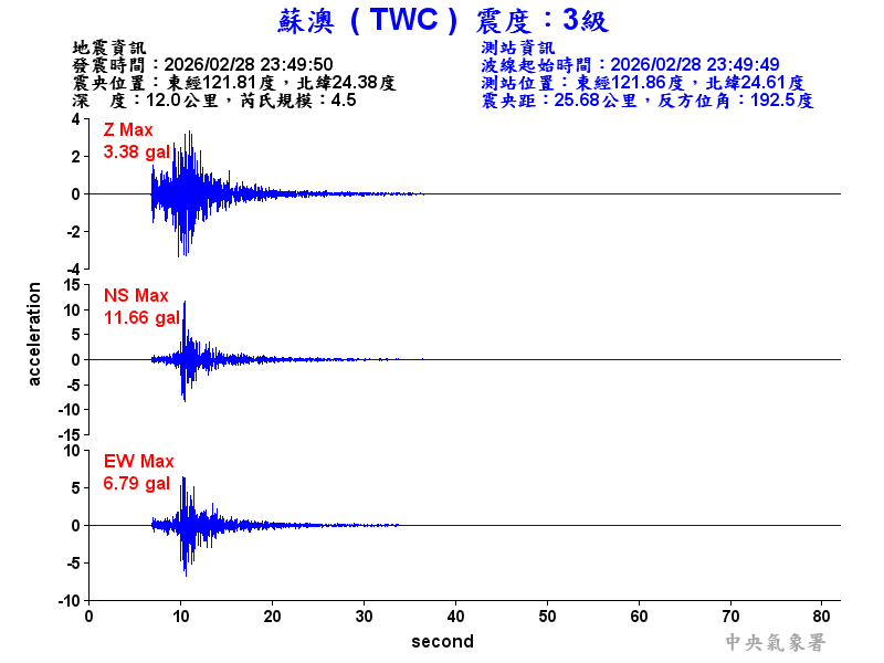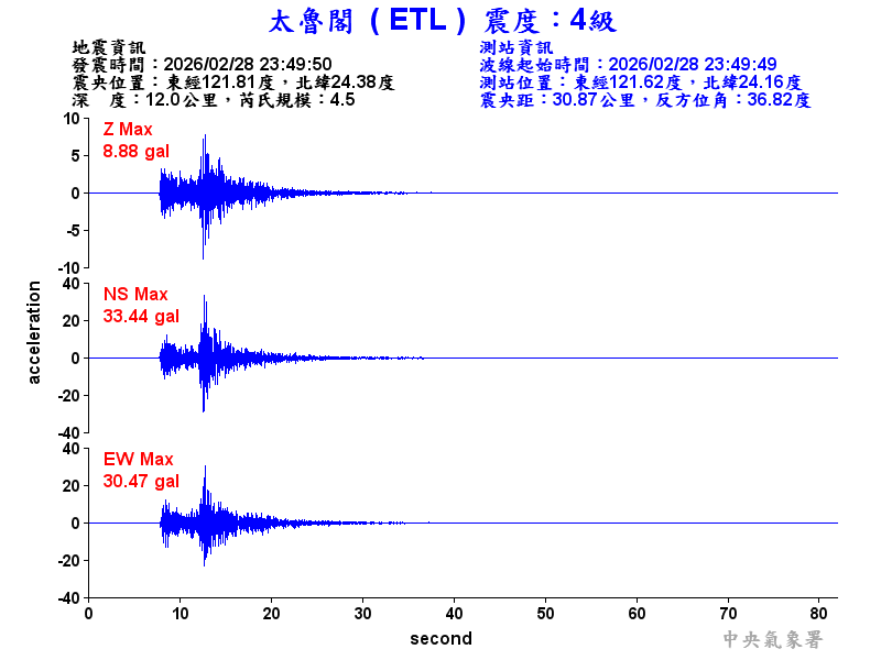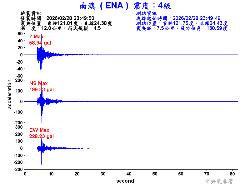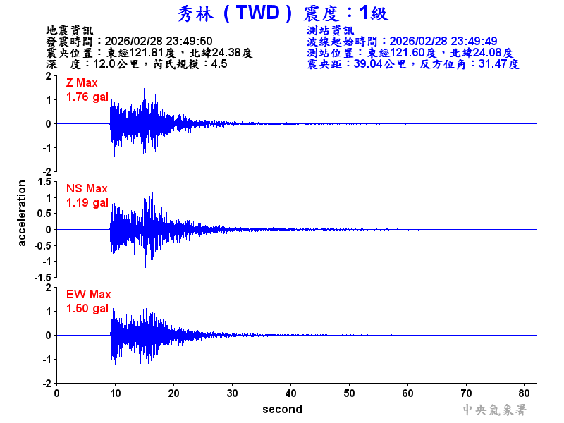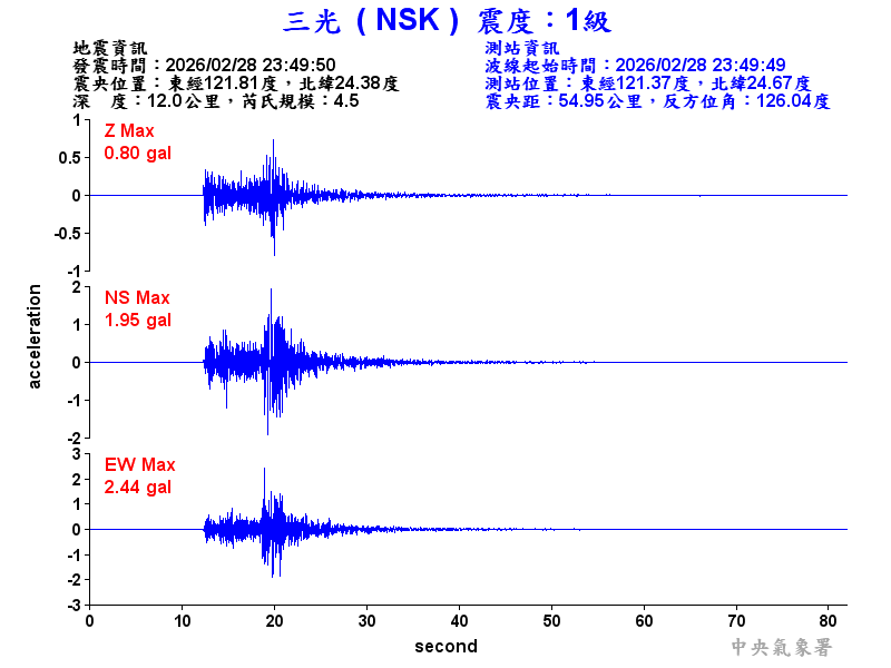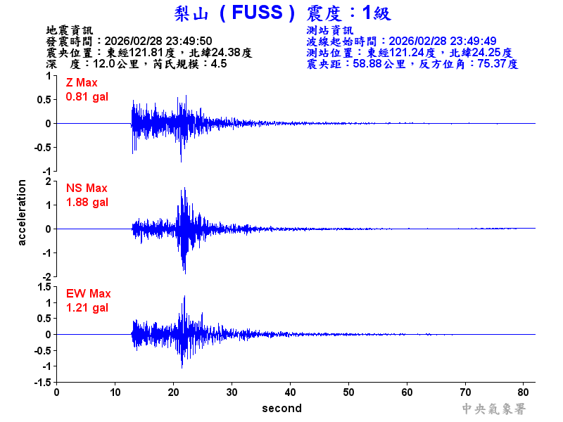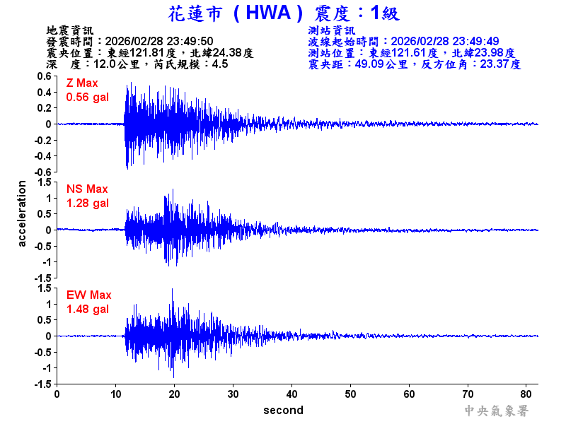 Origin Time:2026/02/28 23:49:50 Lon:121.81°E Lat:24.38°N Depth:12.0km