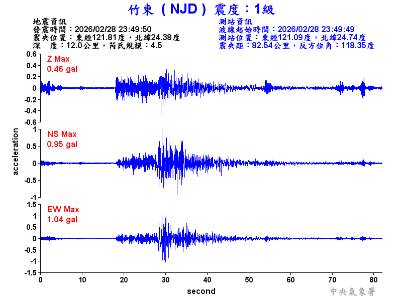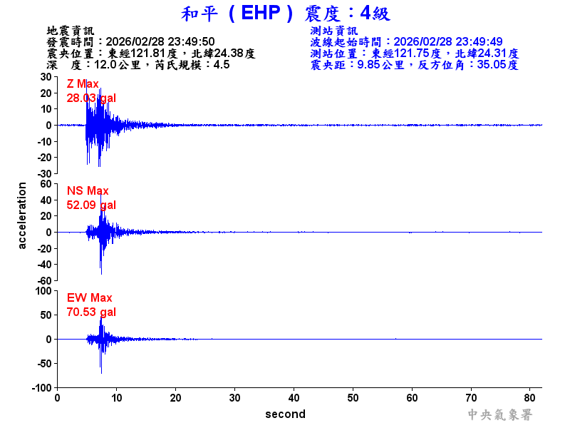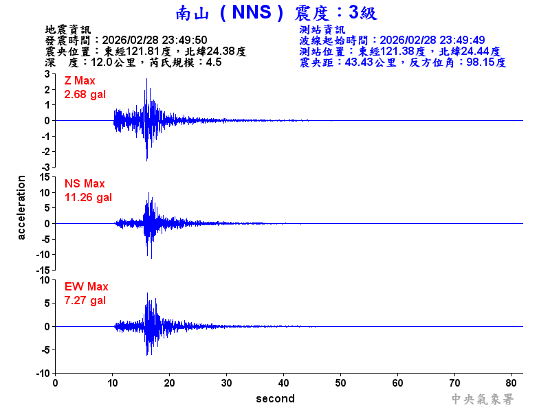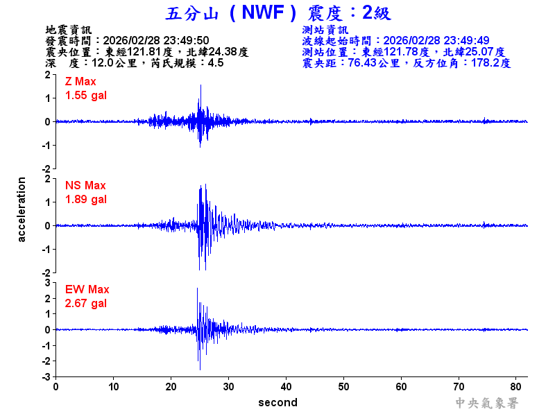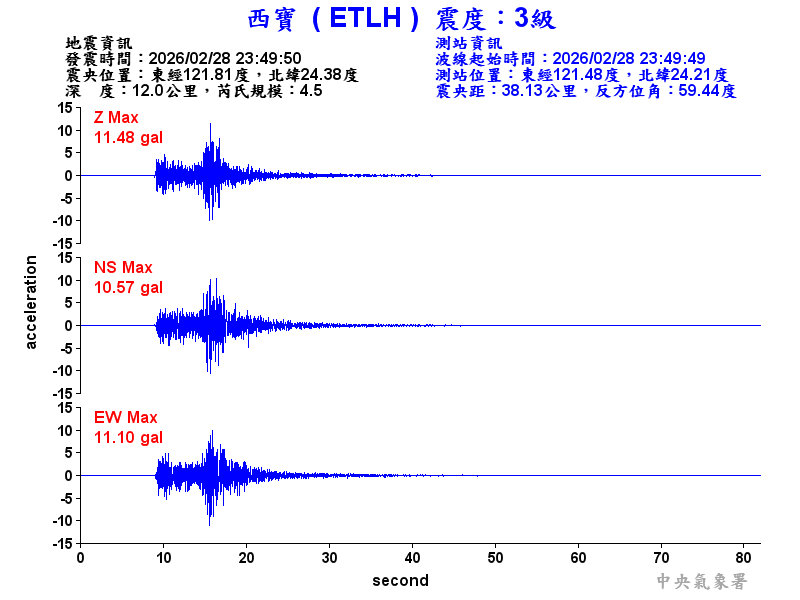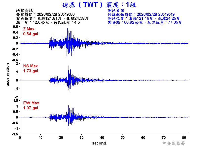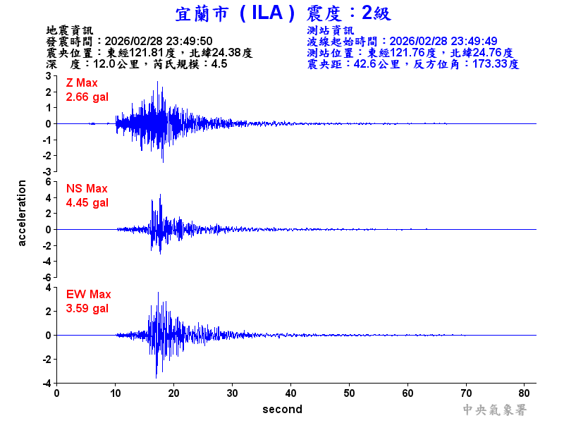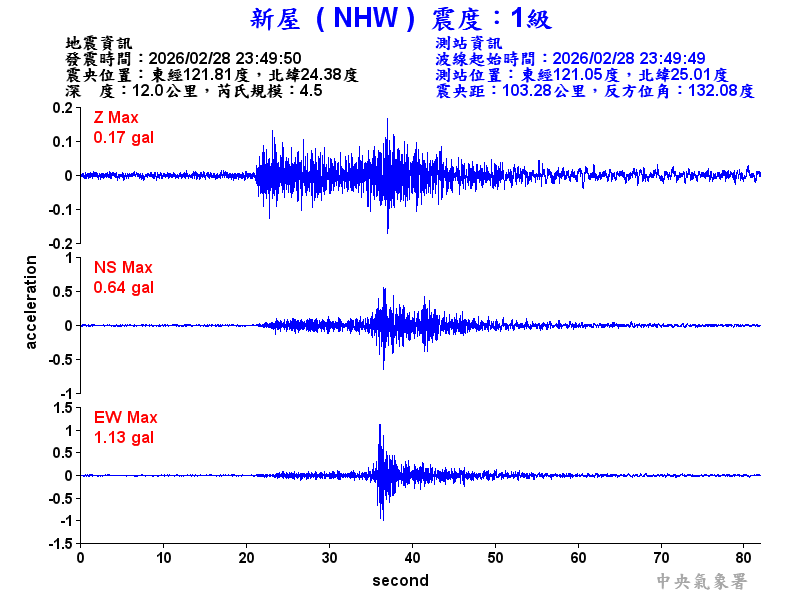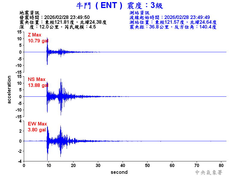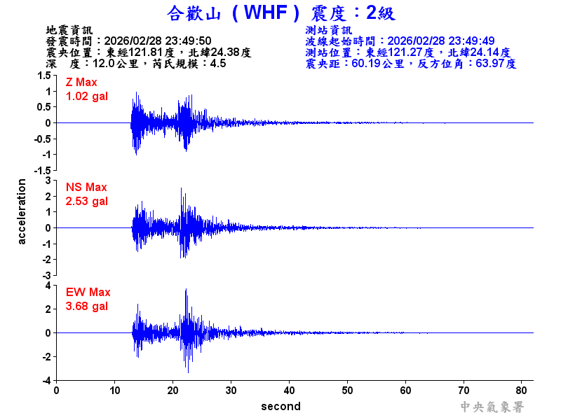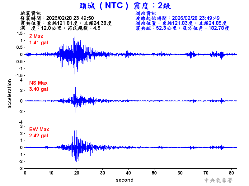 Origin Time:2026/02/28 23:49:50 Lon:121.81°E Lat:24.38°N Depth:12.0km