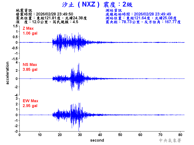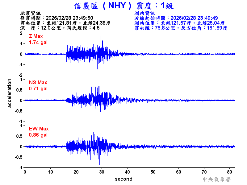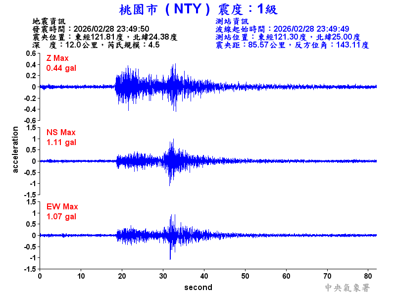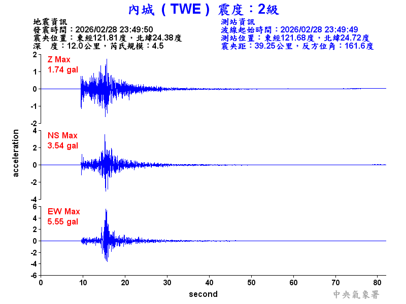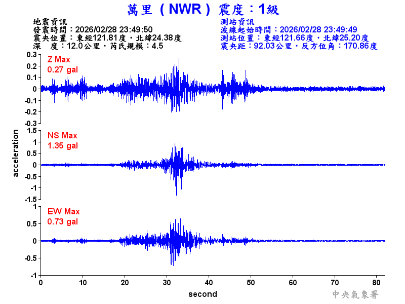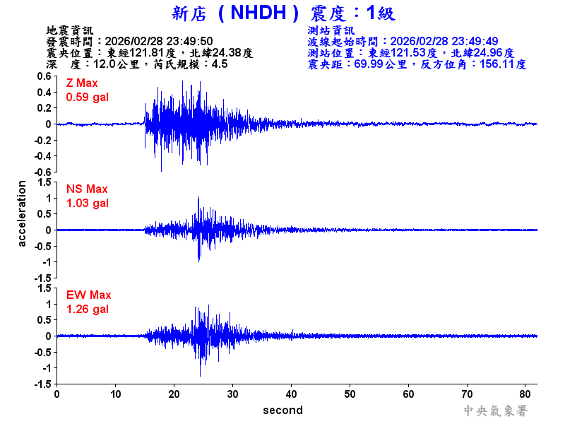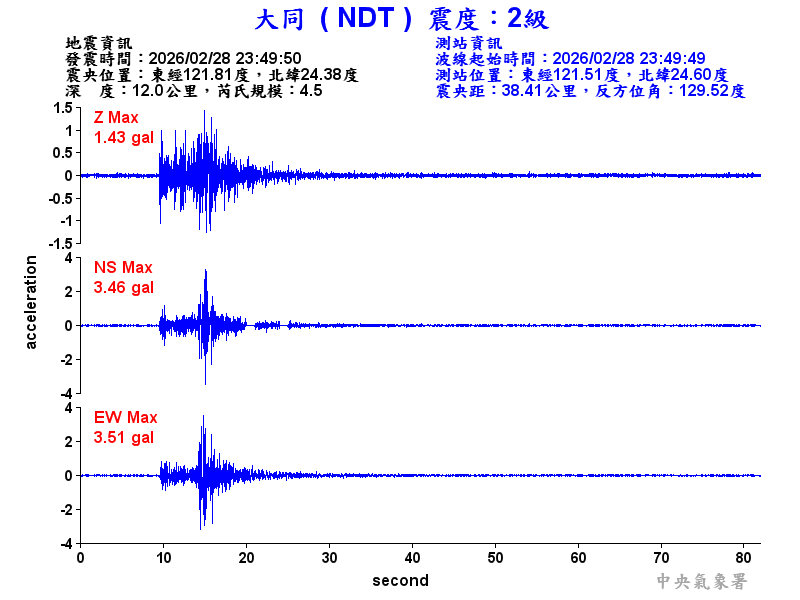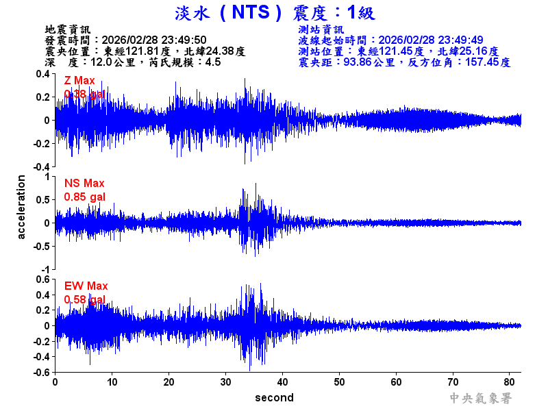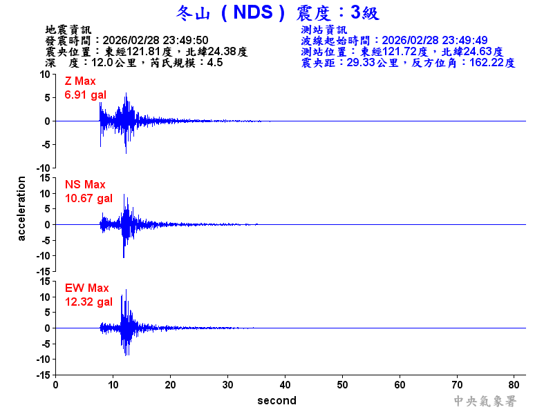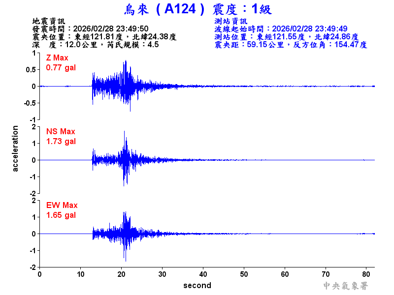 Origin Time:2026/02/28 23:49:50 Lon:121.81°E Lat:24.38°N Depth:12.0km