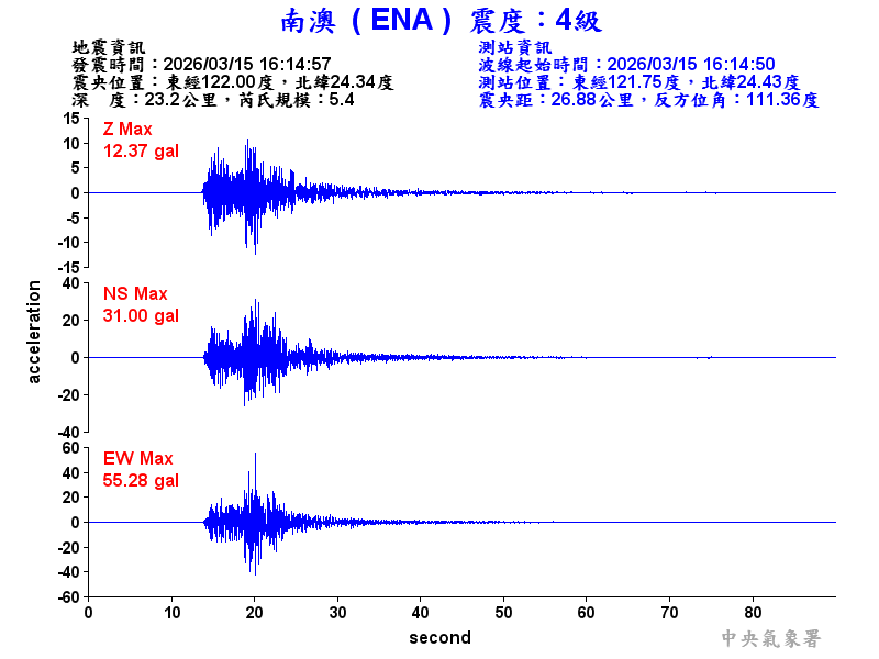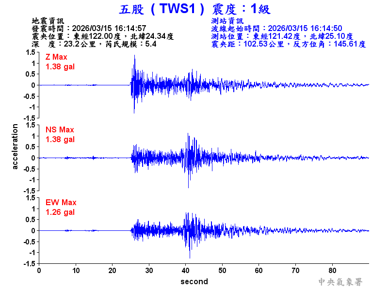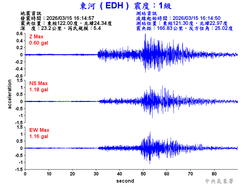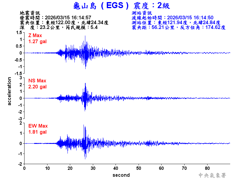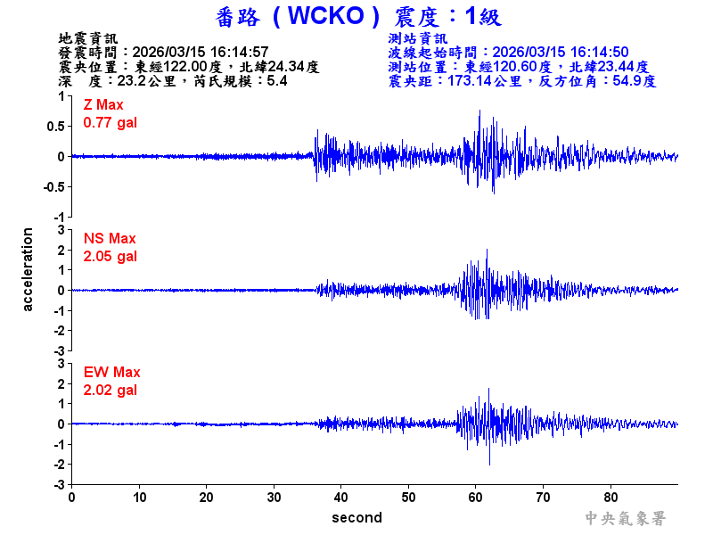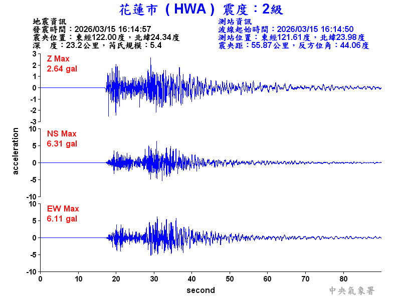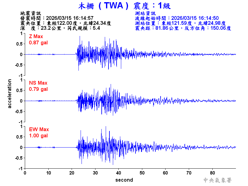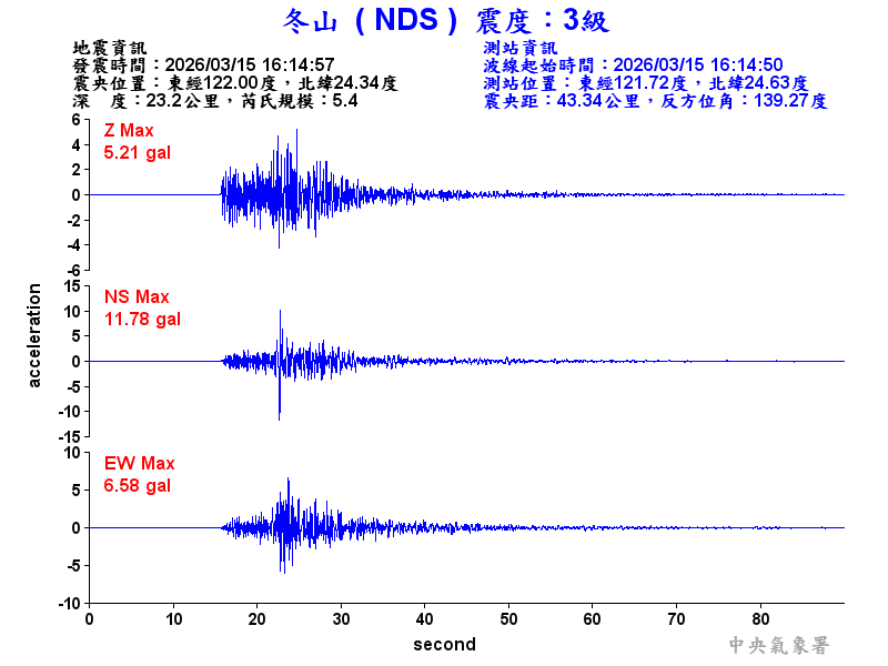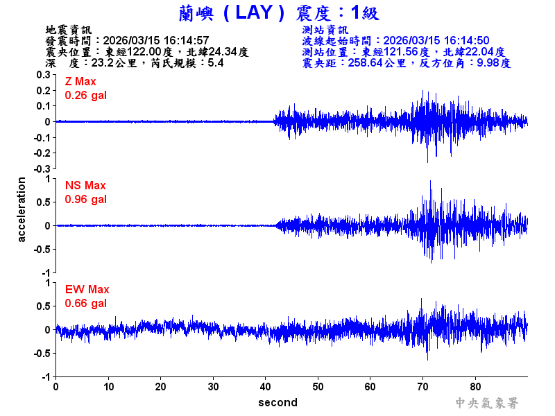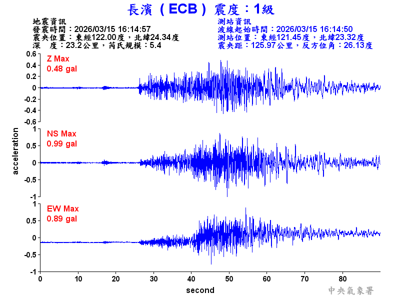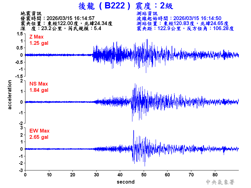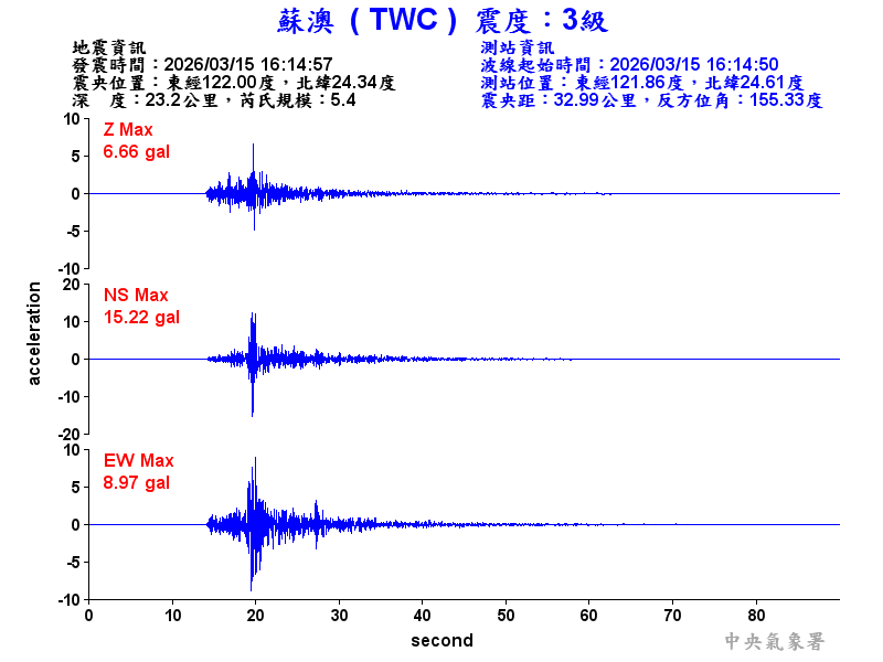 Origin Time:2026/03/15 16:14:57 Lon:122.00°E Lat:24.34°N Depth:23.2km