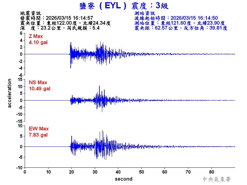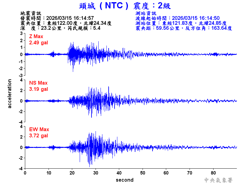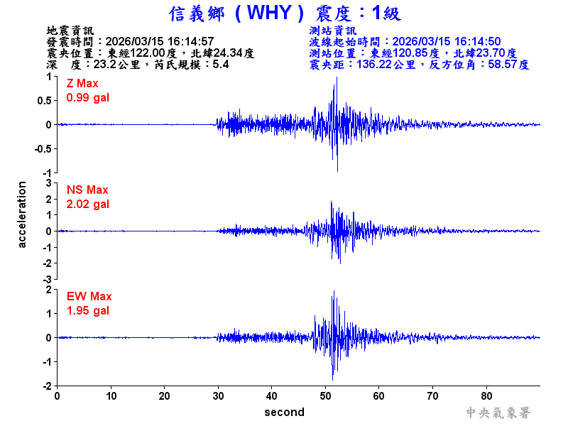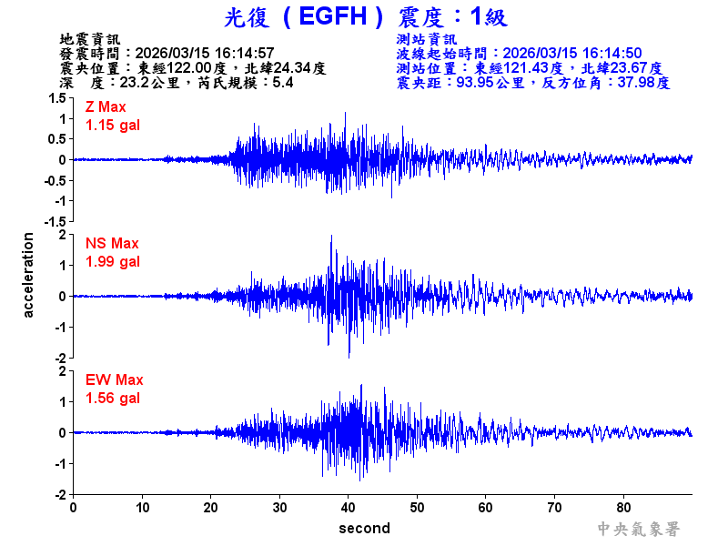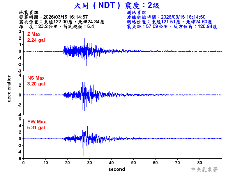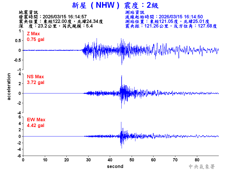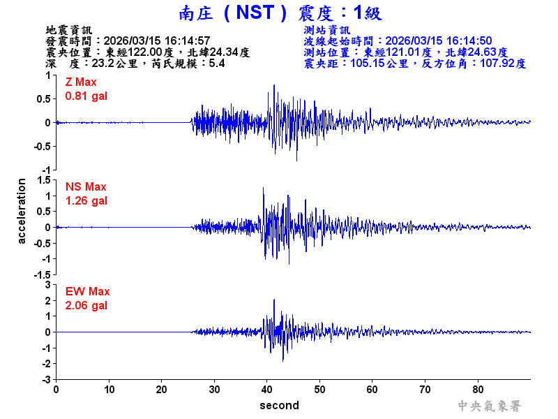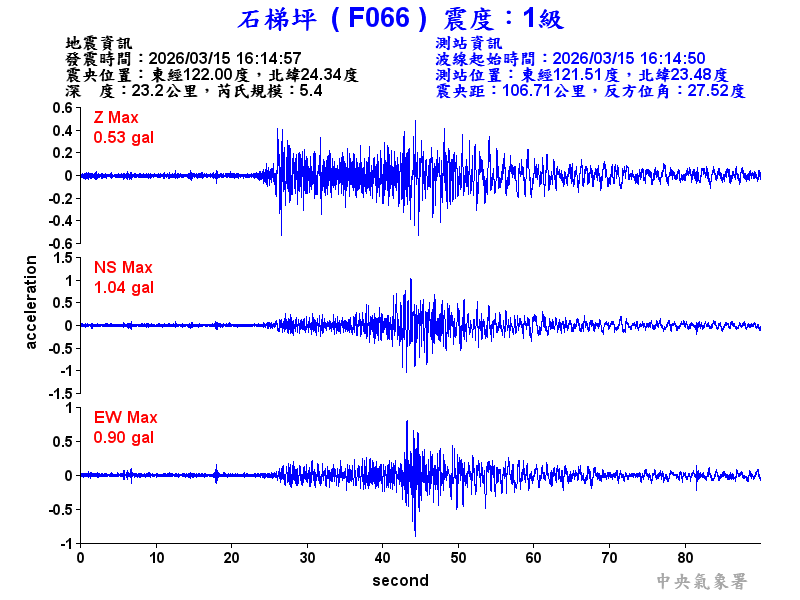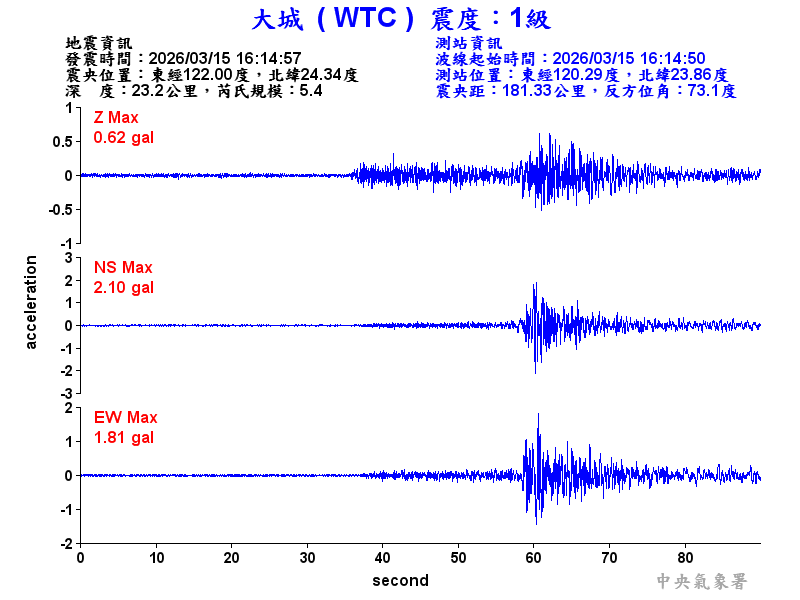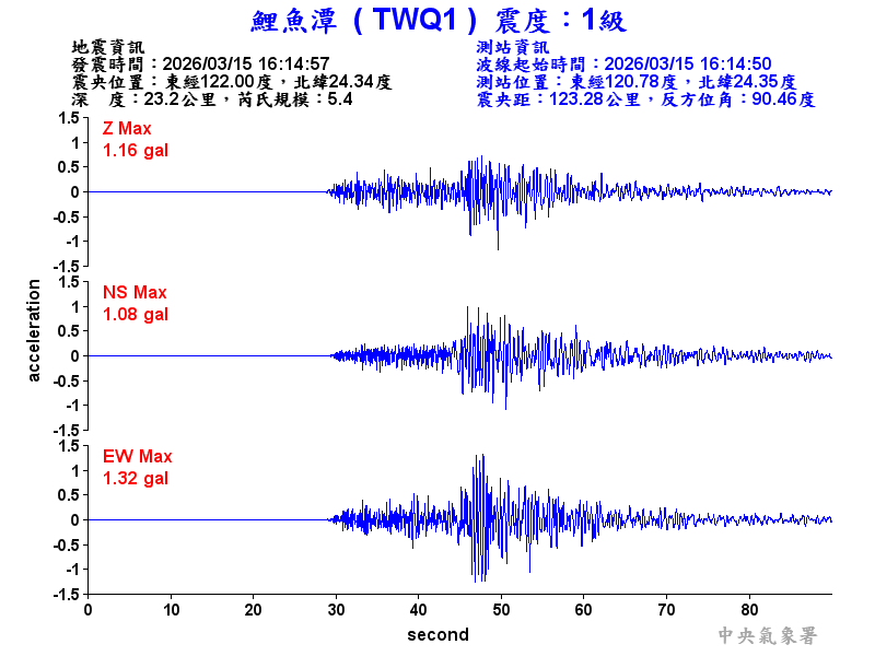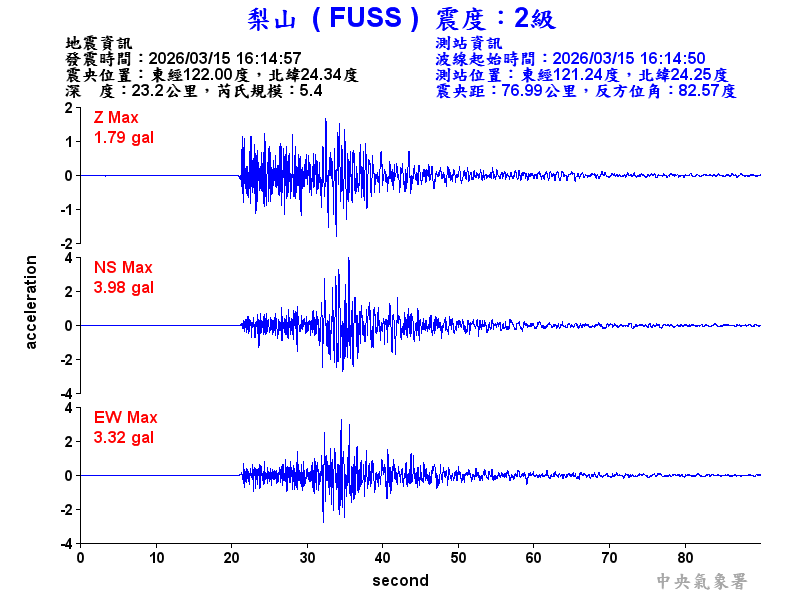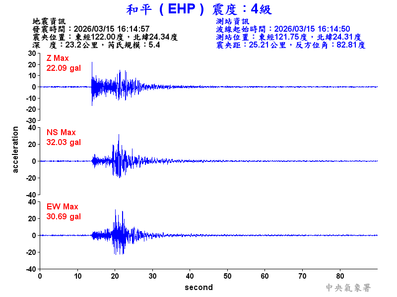 Origin Time:2026/03/15 16:14:57 Lon:122.00°E Lat:24.34°N Depth:23.2km