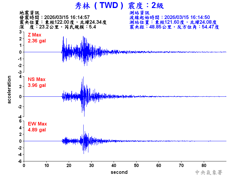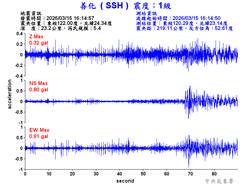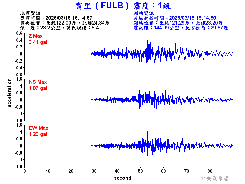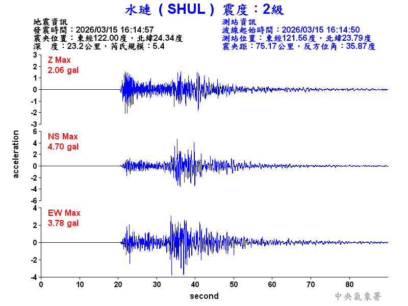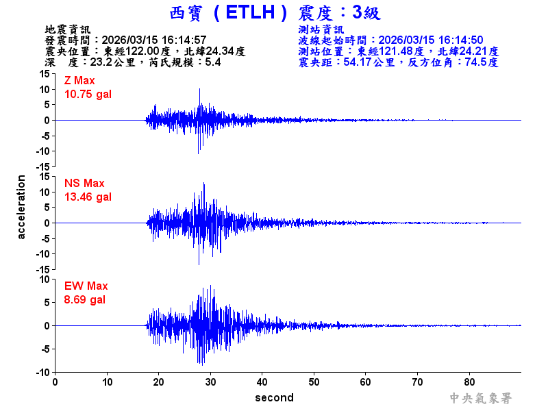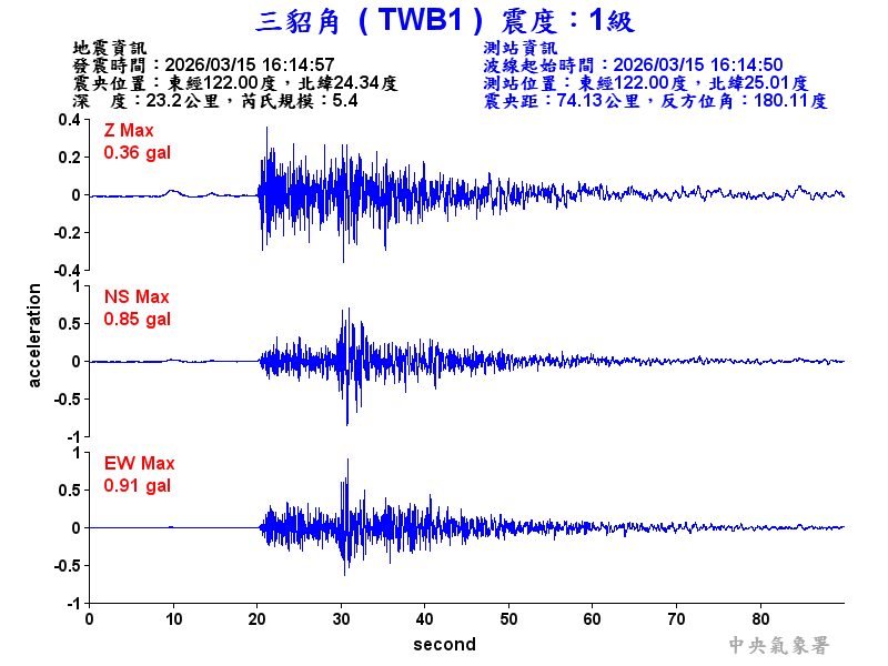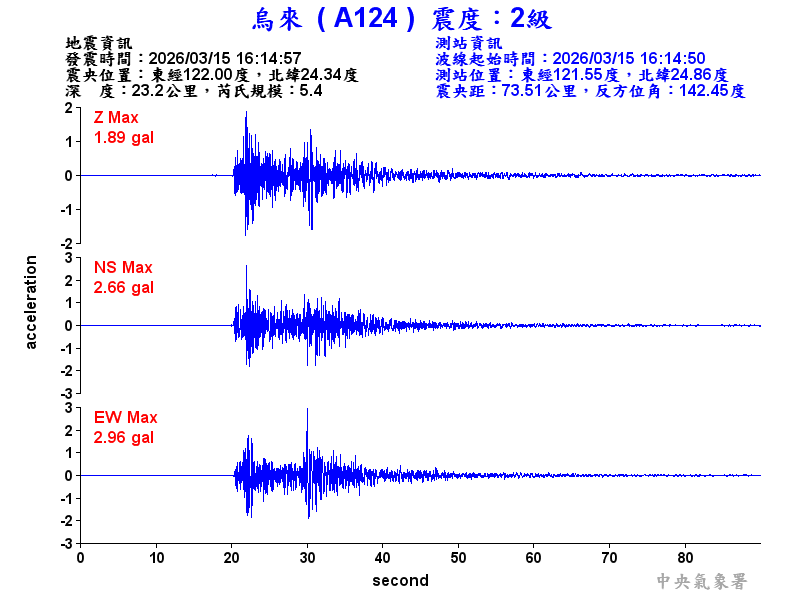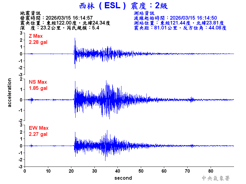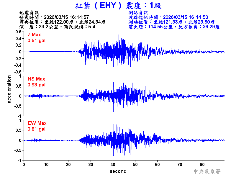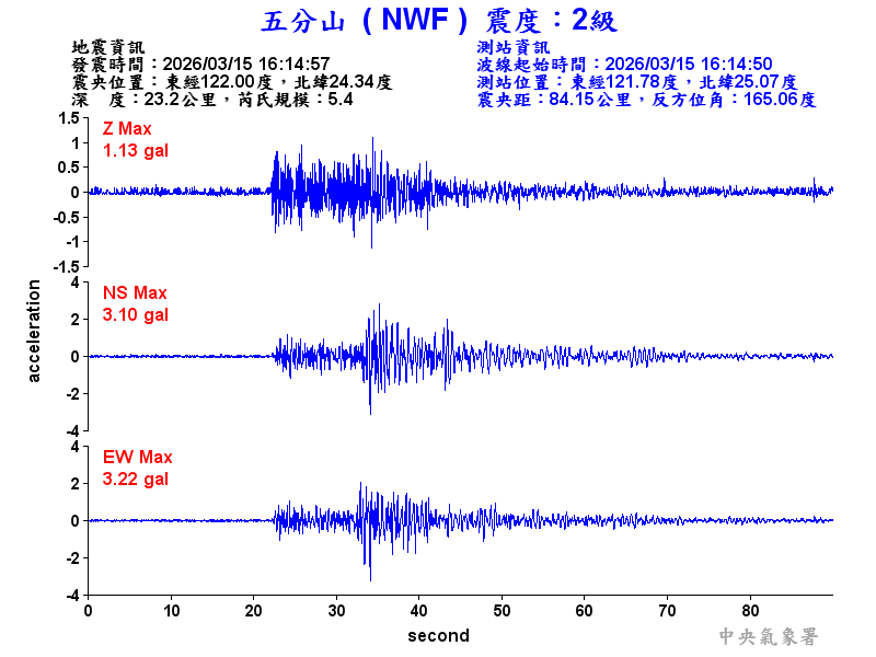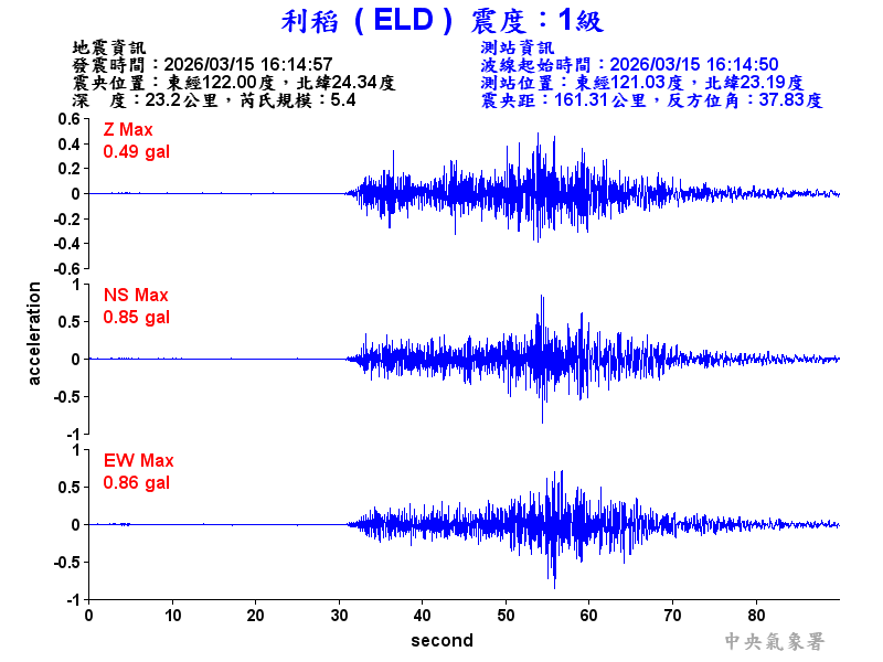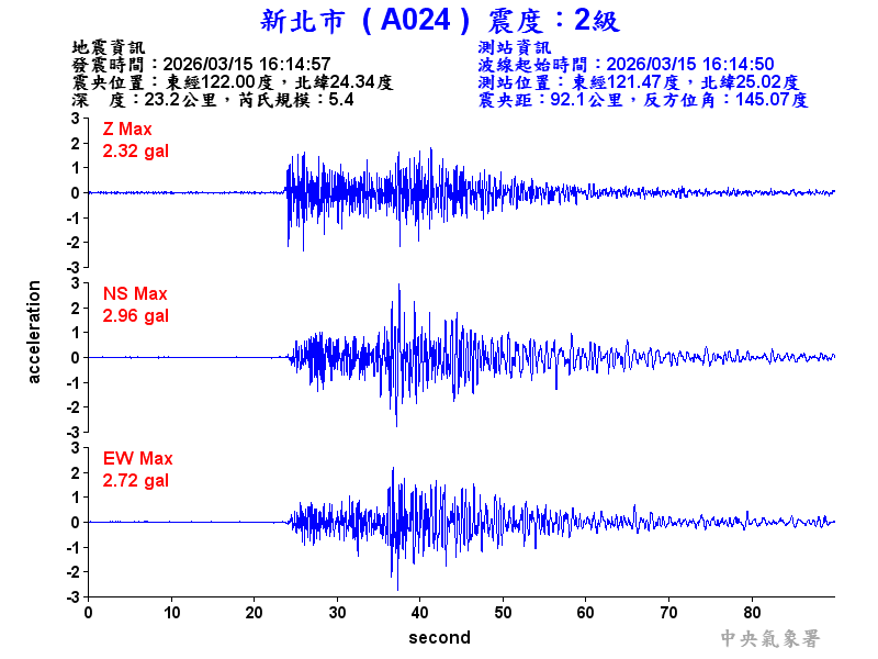Origin Time:2026/03/15 16:14:57 Lon:122.00°E Lat:24.34°N Depth:23.2km