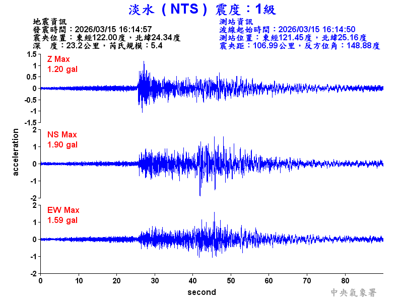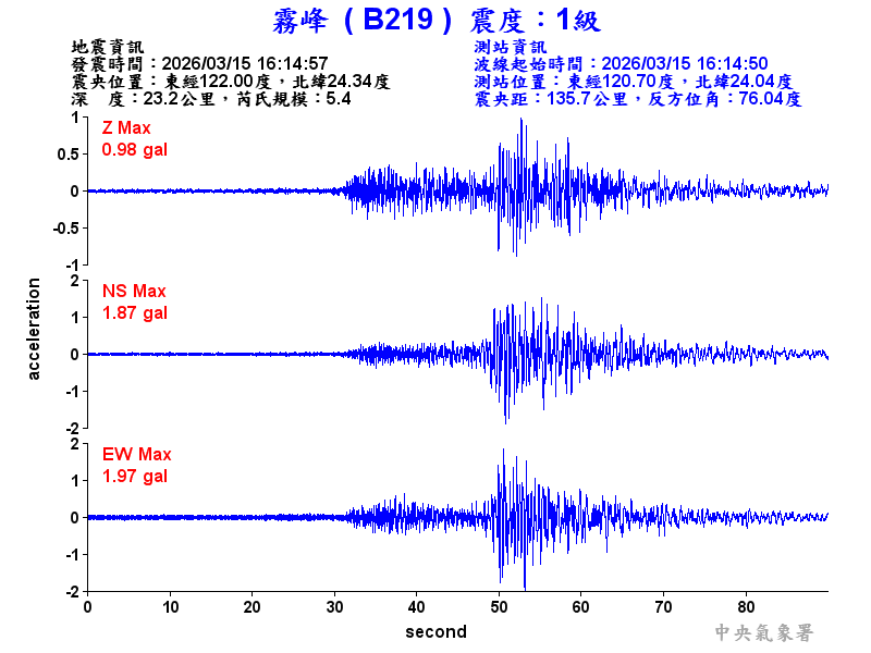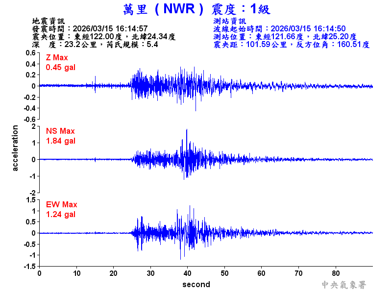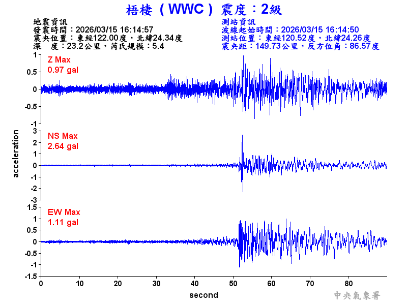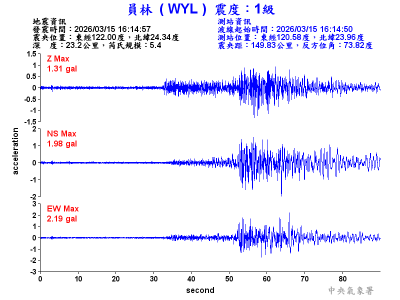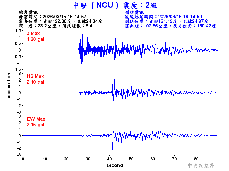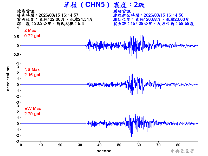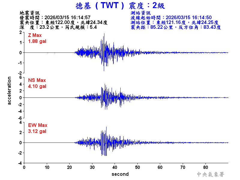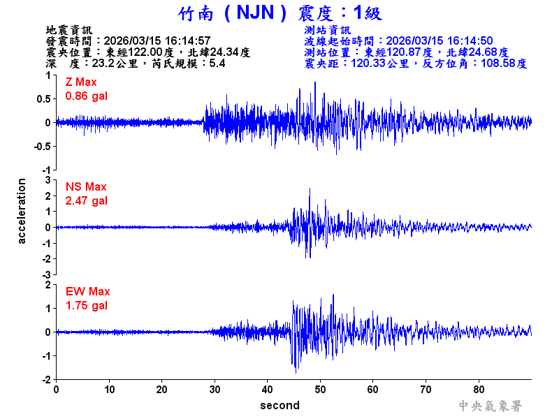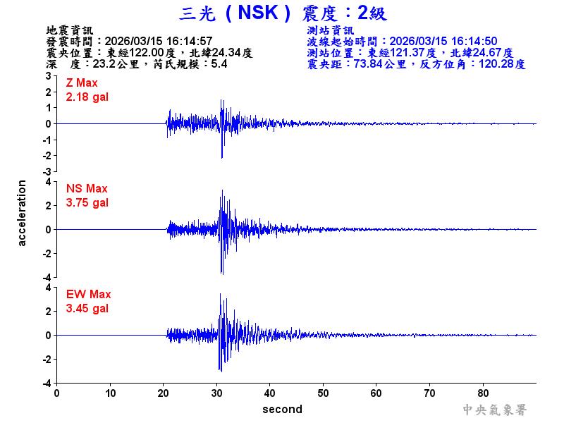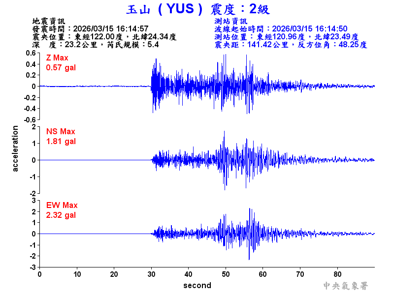 Origin Time:2026/03/15 16:14:57 Lon:122.00°E Lat:24.34°N Depth:23.2km