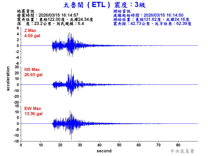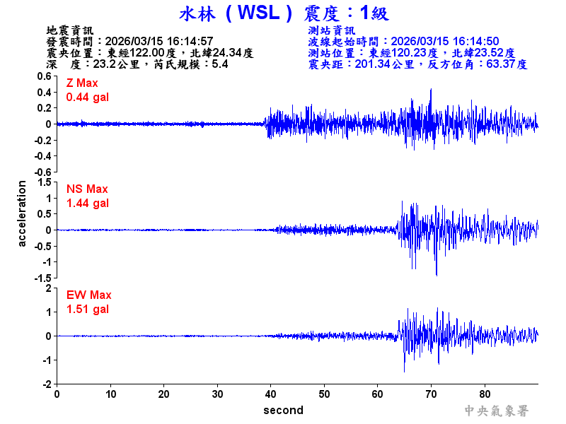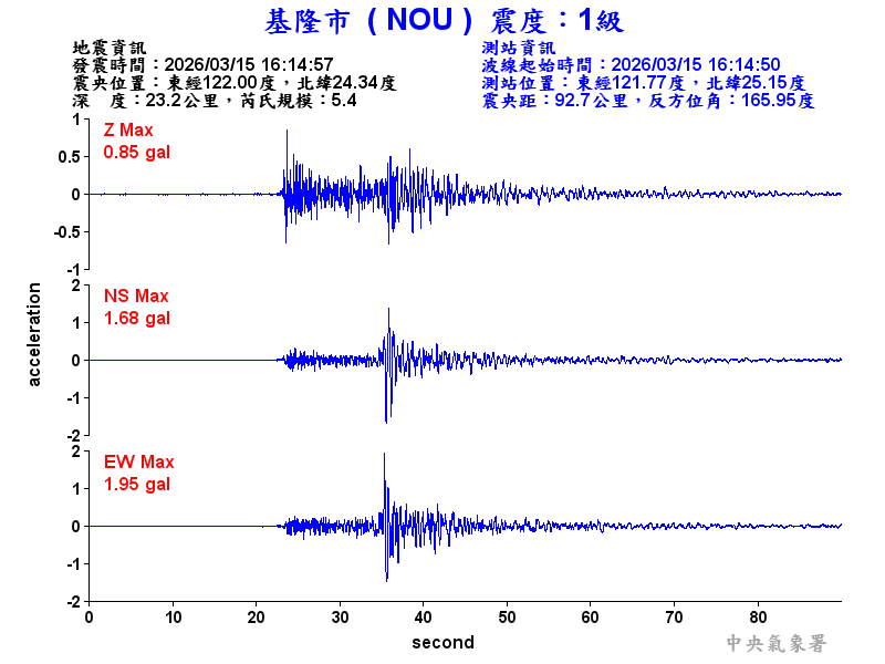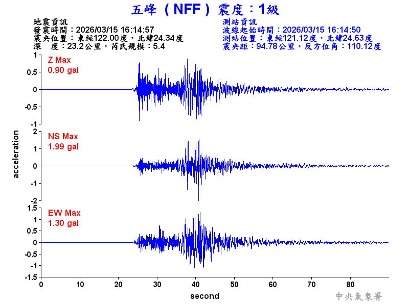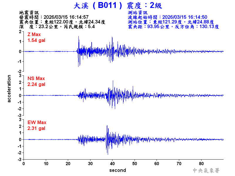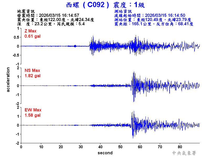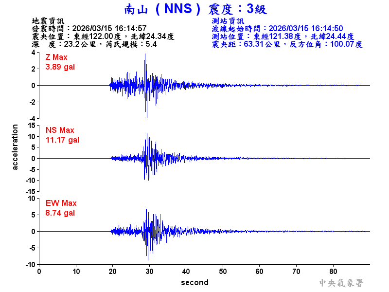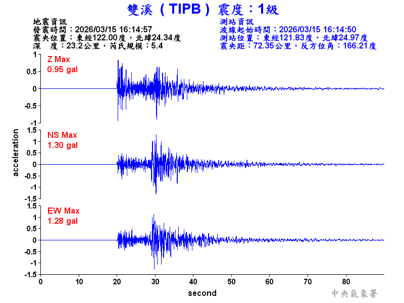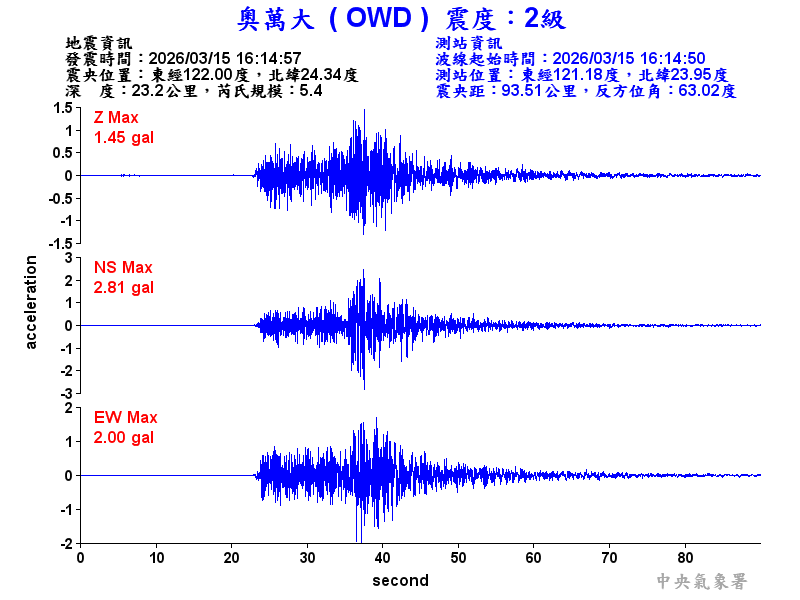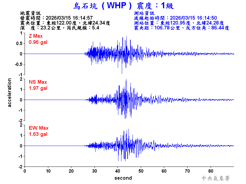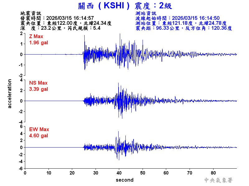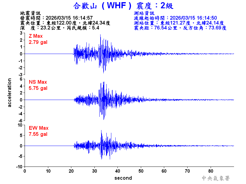 Origin Time:2026/03/15 16:14:57 Lon:122.00°E Lat:24.34°N Depth:23.2km