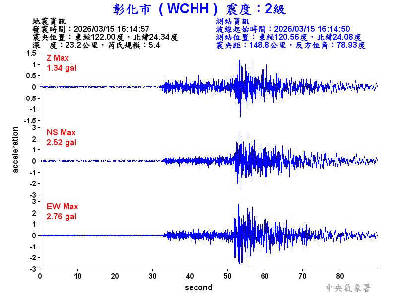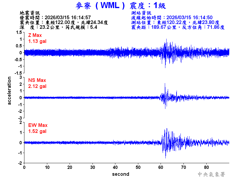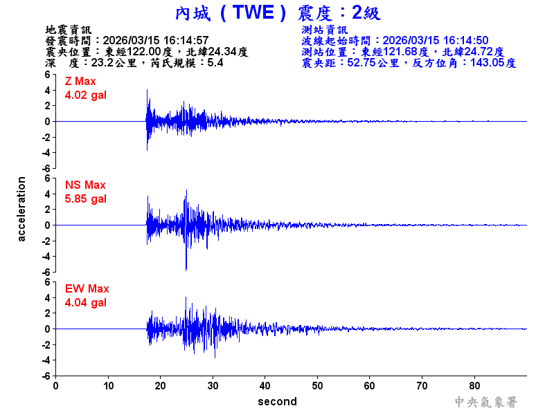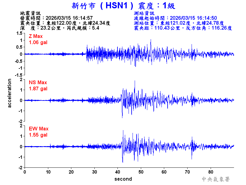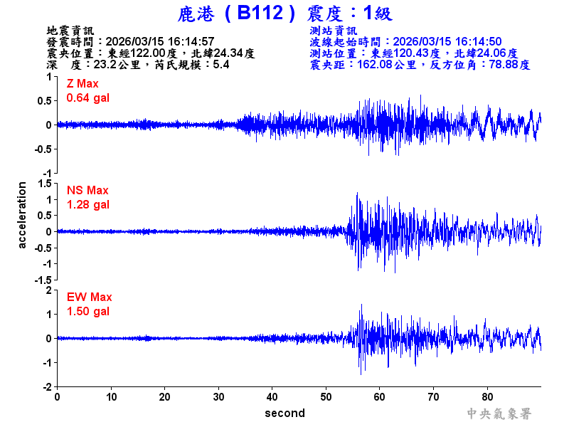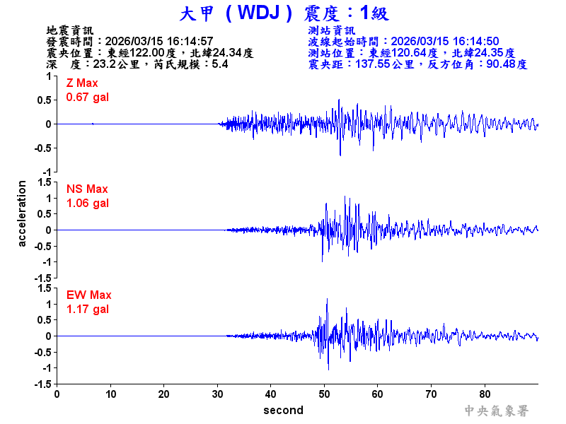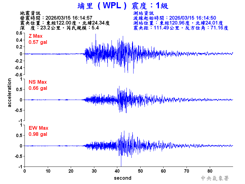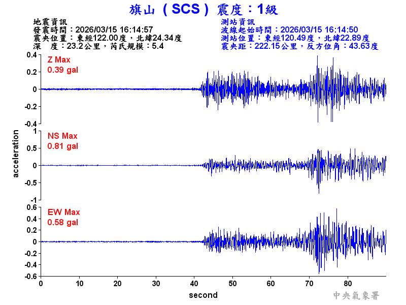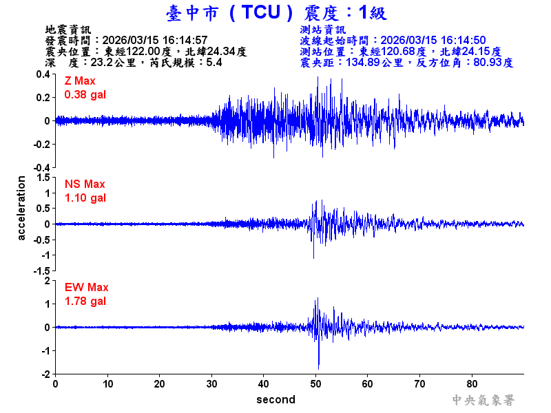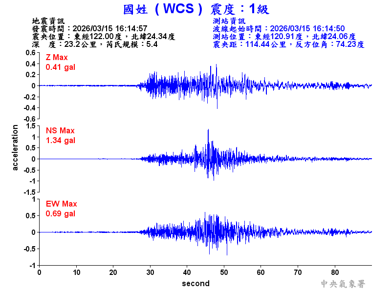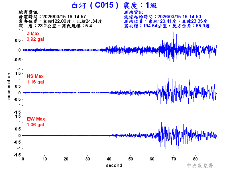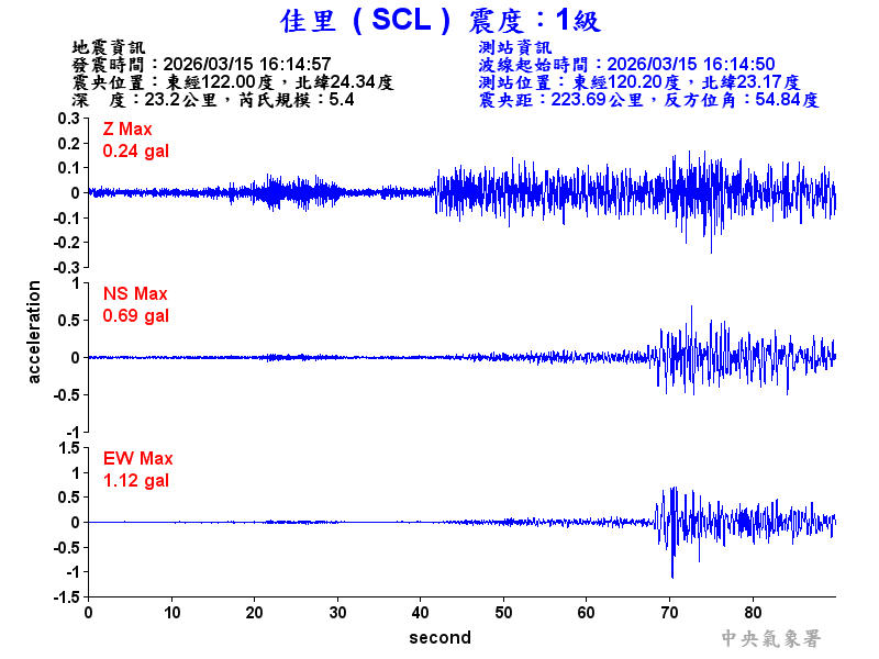 Origin Time:2026/03/15 16:14:57 Lon:122.00°E Lat:24.34°N Depth:23.2km
