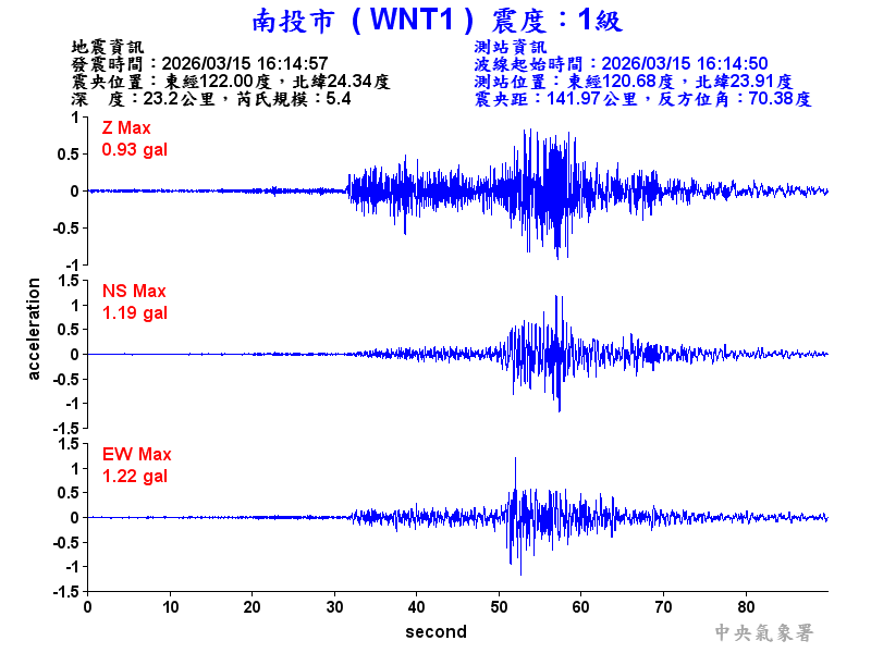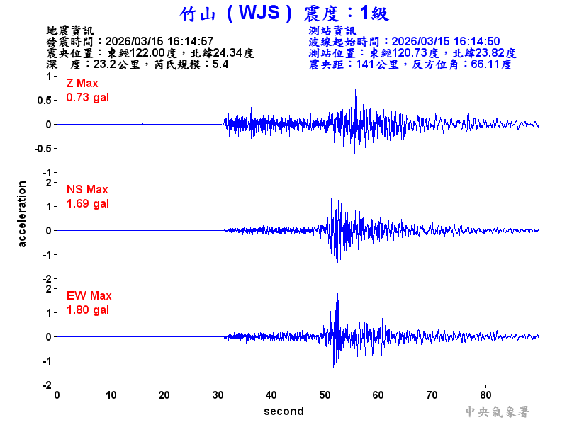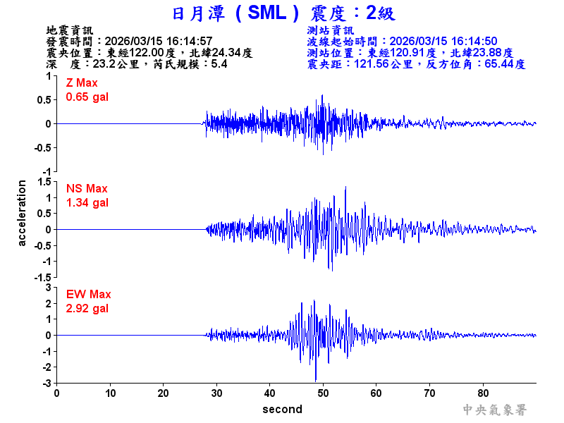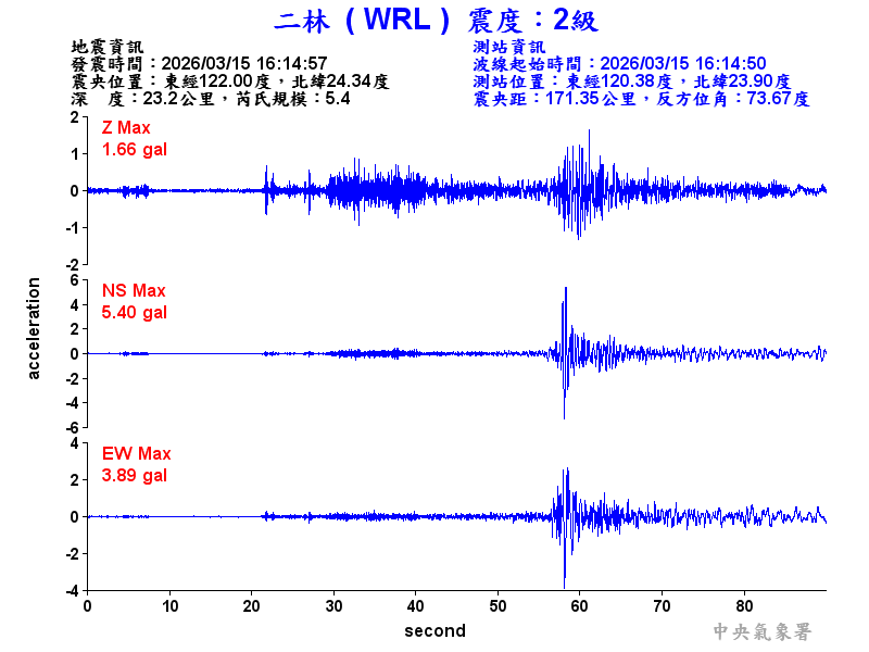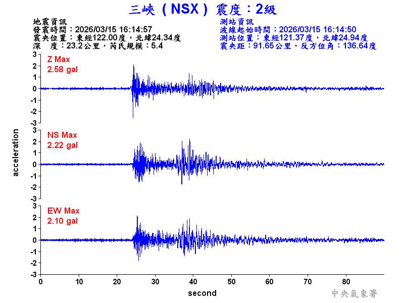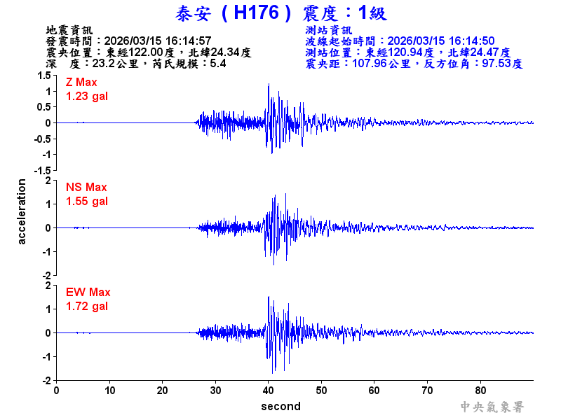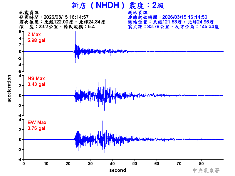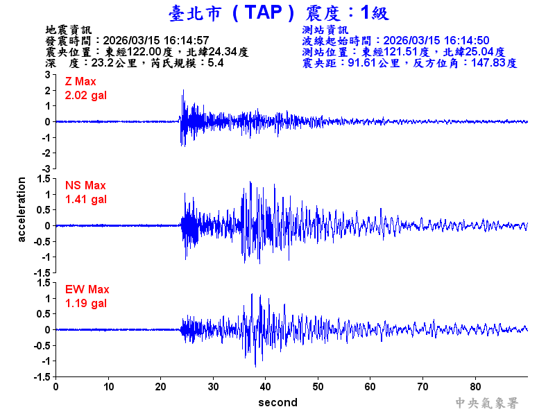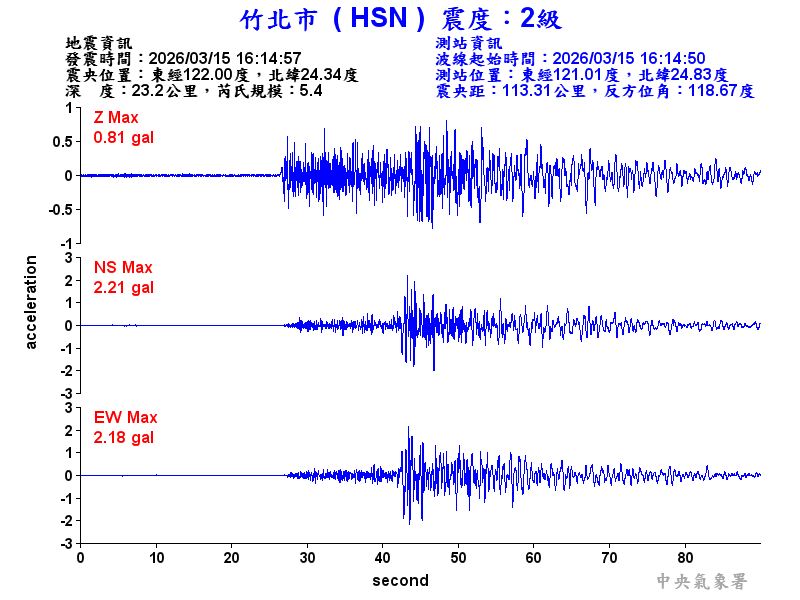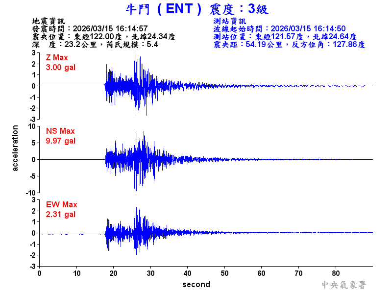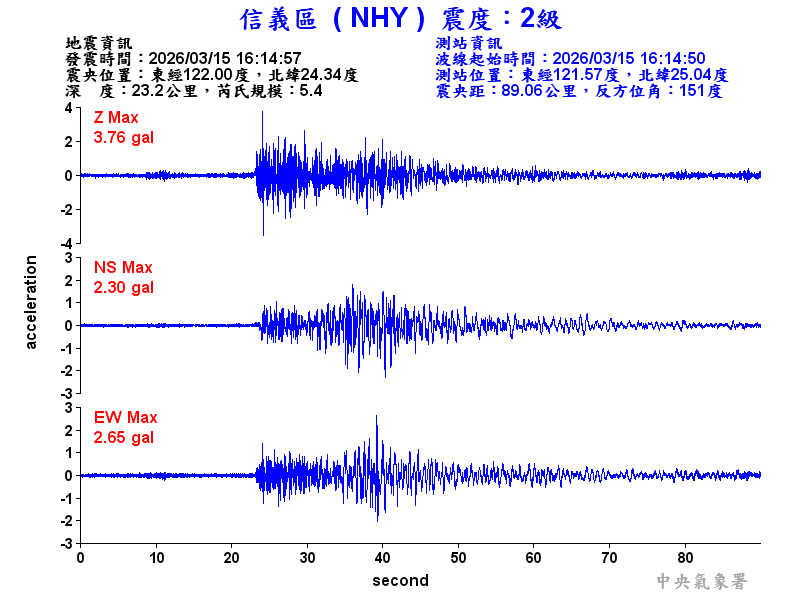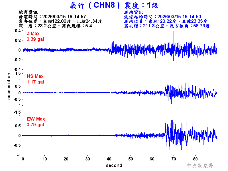 Origin Time:2026/03/15 16:14:57 Lon:122.00°E Lat:24.34°N Depth:23.2km