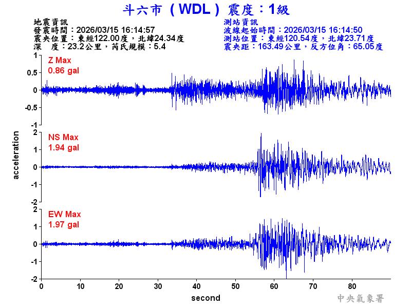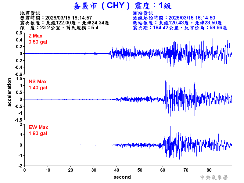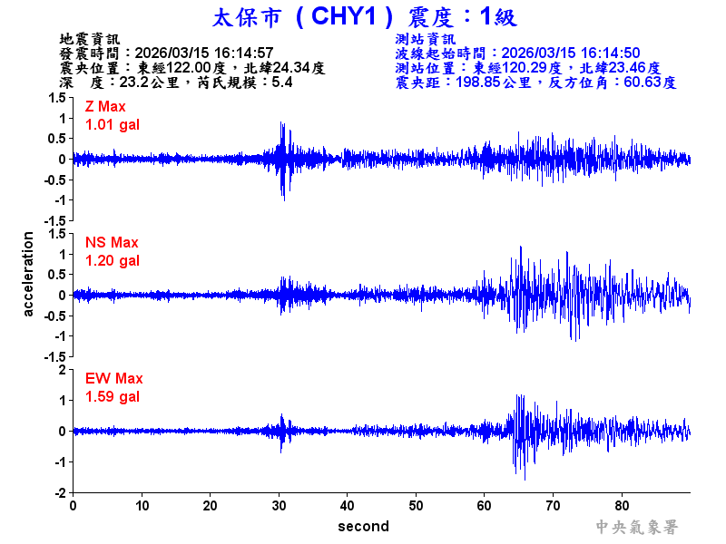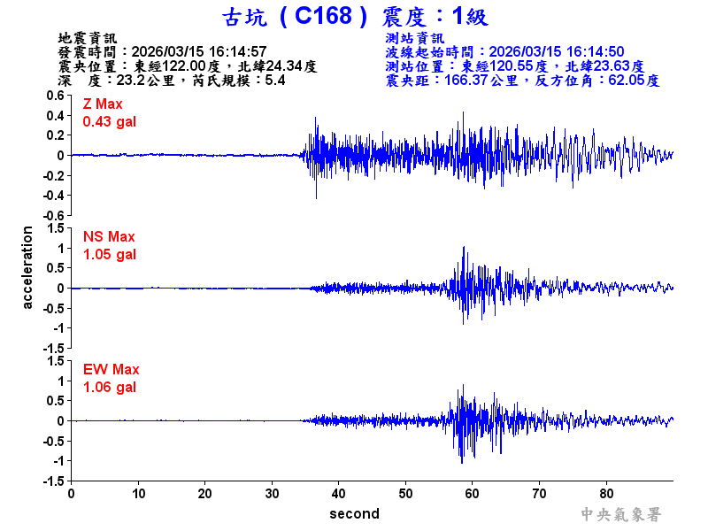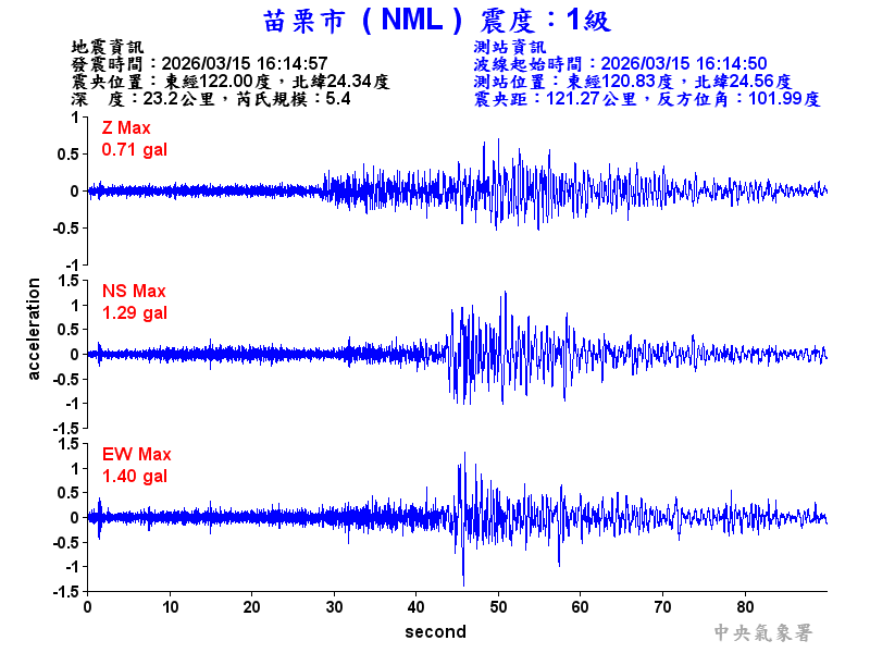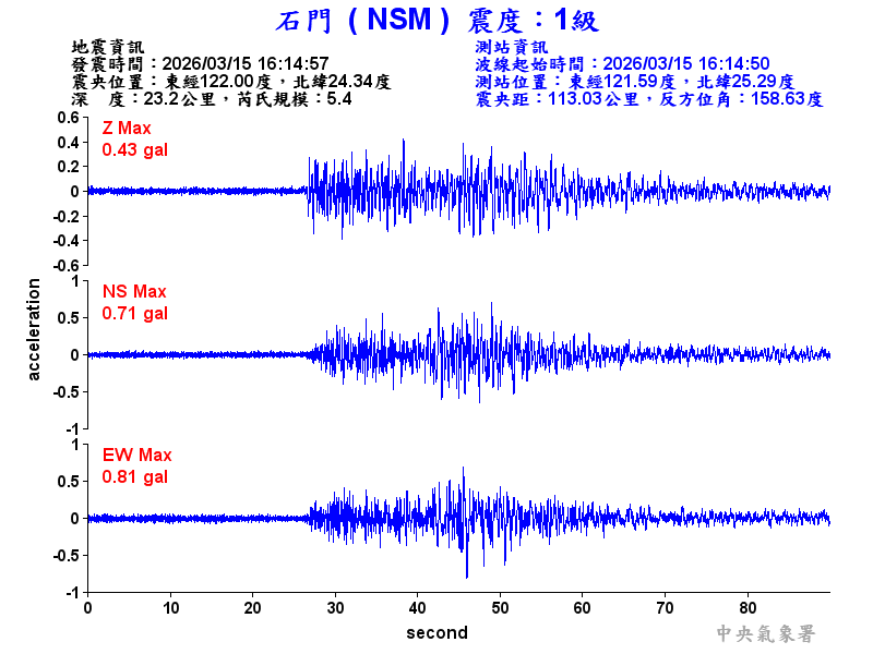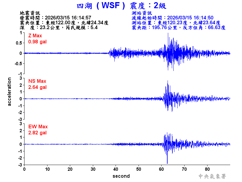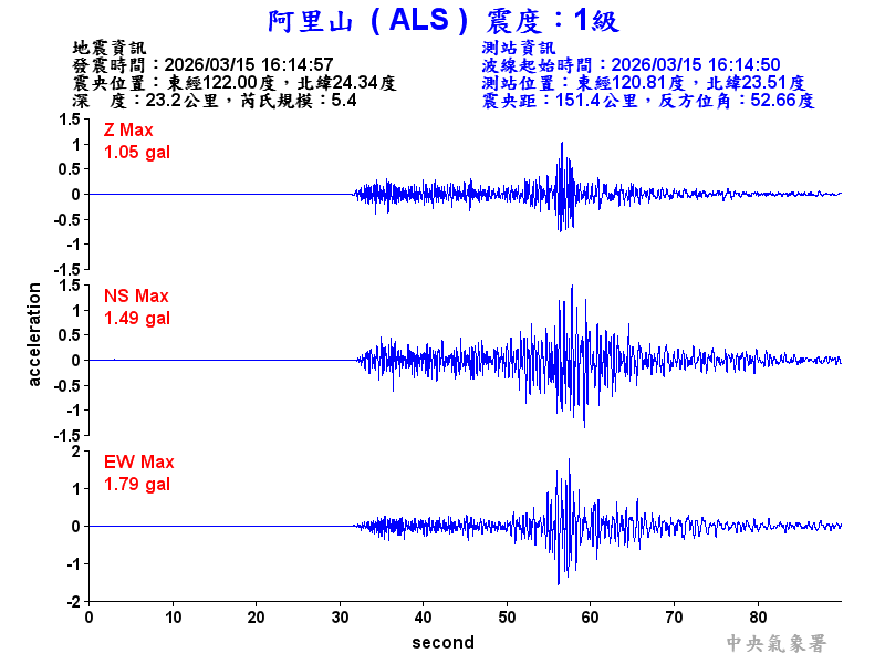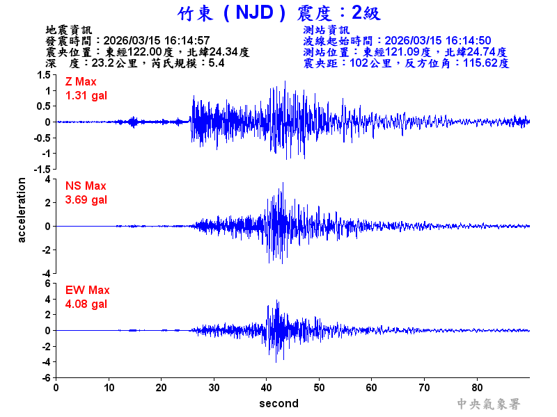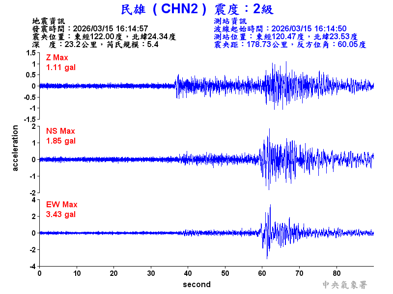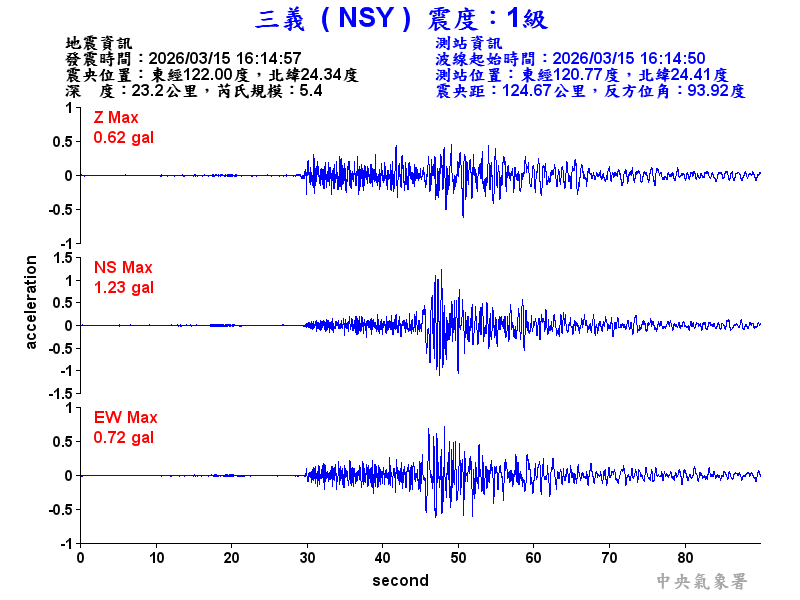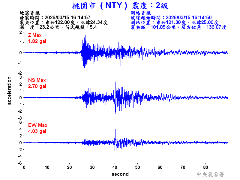 Origin Time:2026/03/15 16:14:57 Lon:122.00°E Lat:24.34°N Depth:23.2km