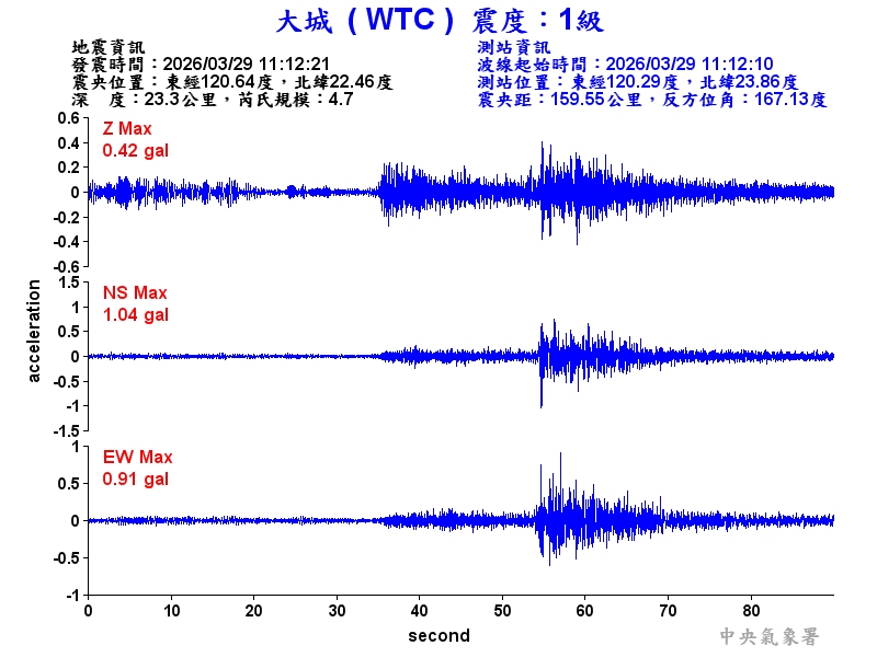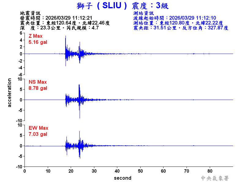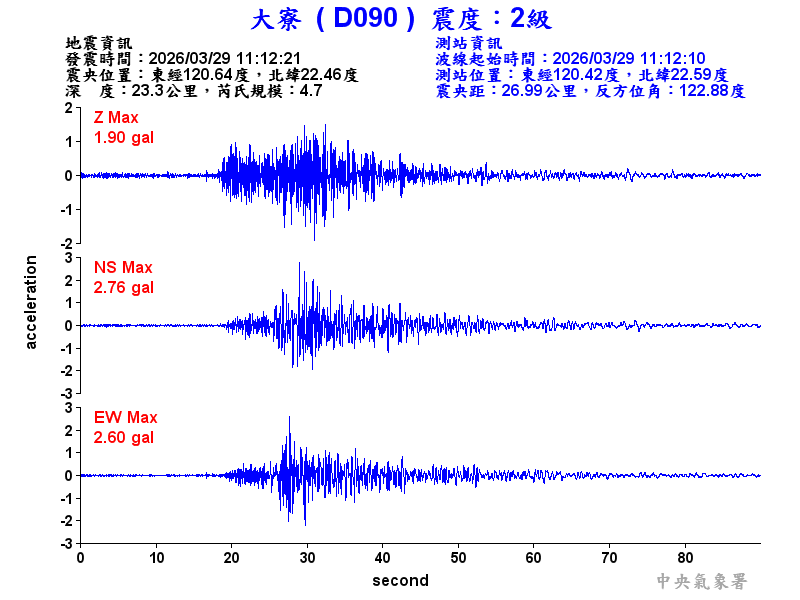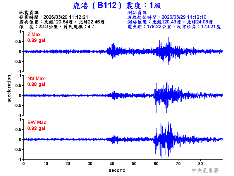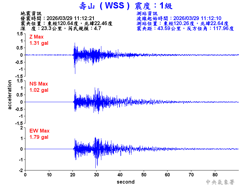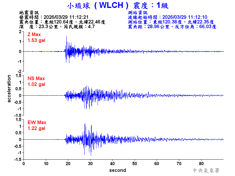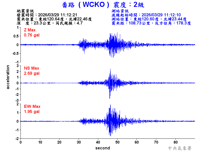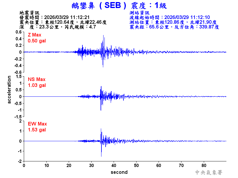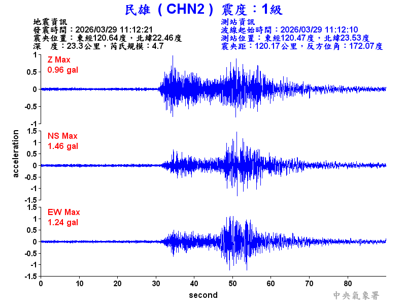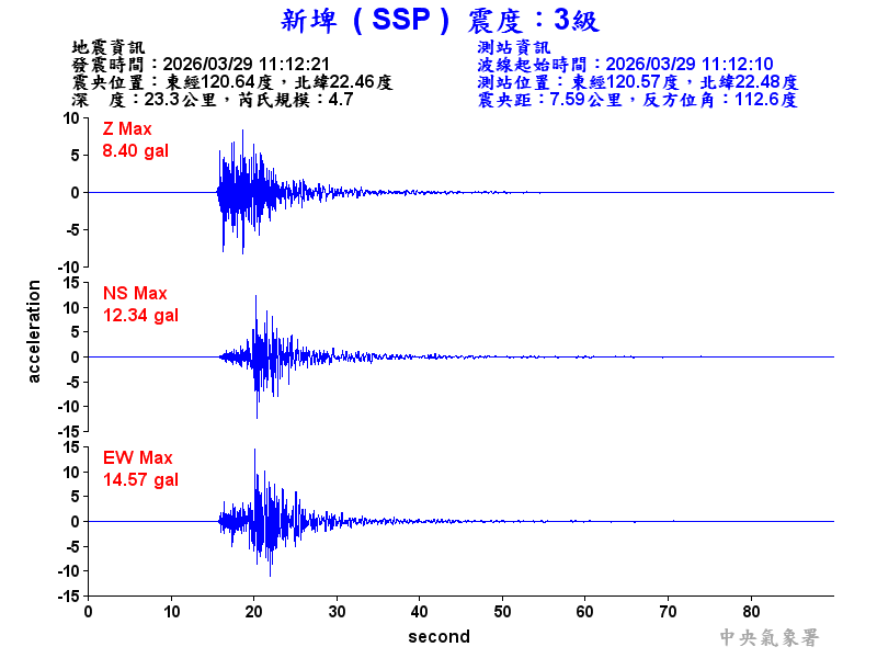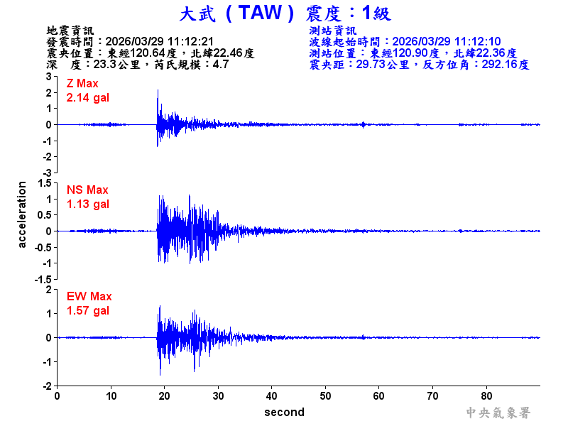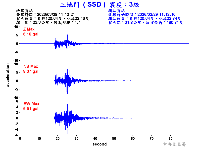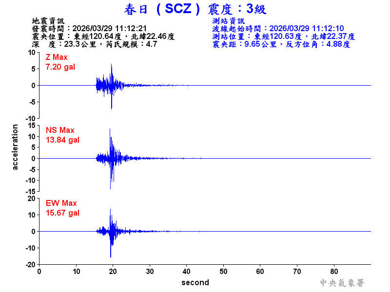 Origin Time:2026/03/29 11:12:21 Lon:120.64°E Lat:22.46°N Depth:23.3km