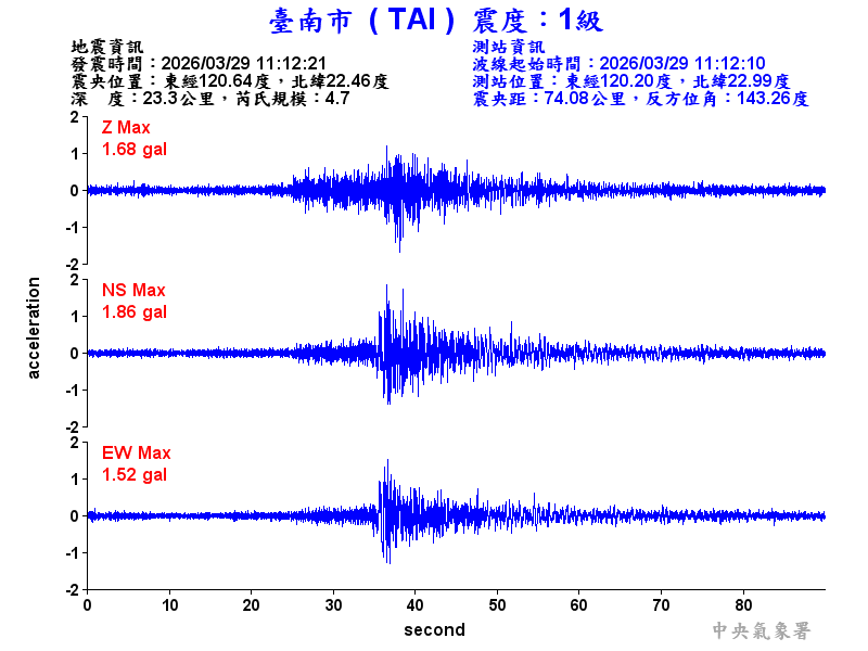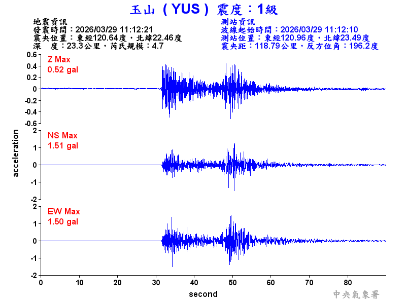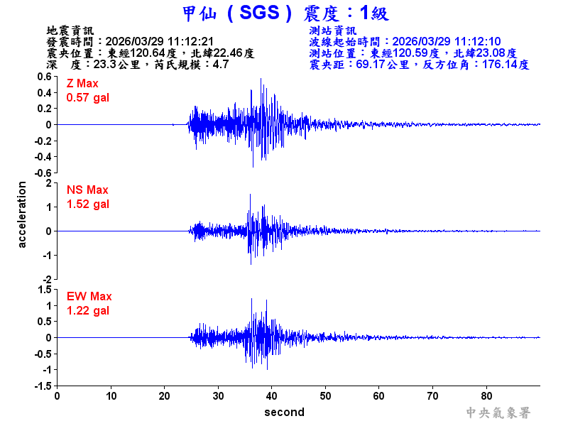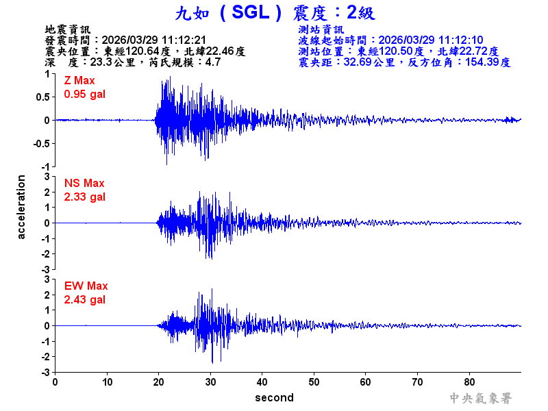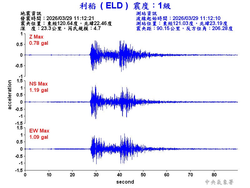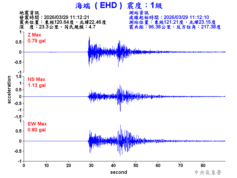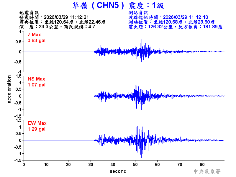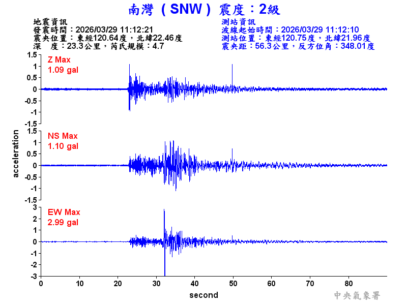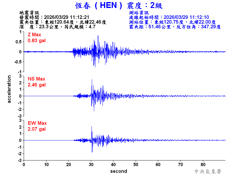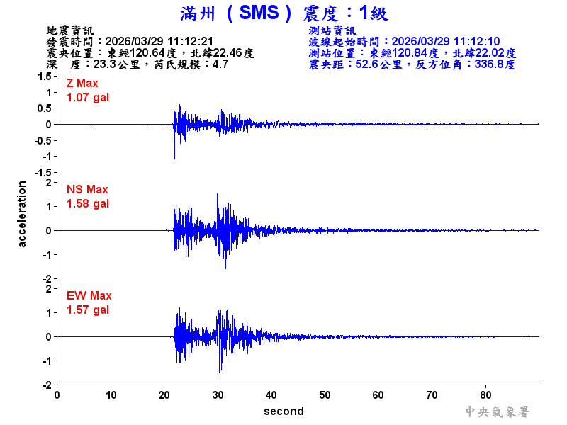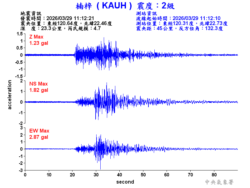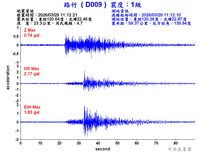 Origin Time:2026/03/29 11:12:21 Lon:120.64°E Lat:22.46°N Depth:23.3km