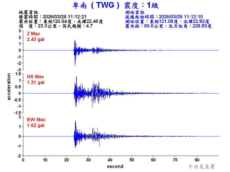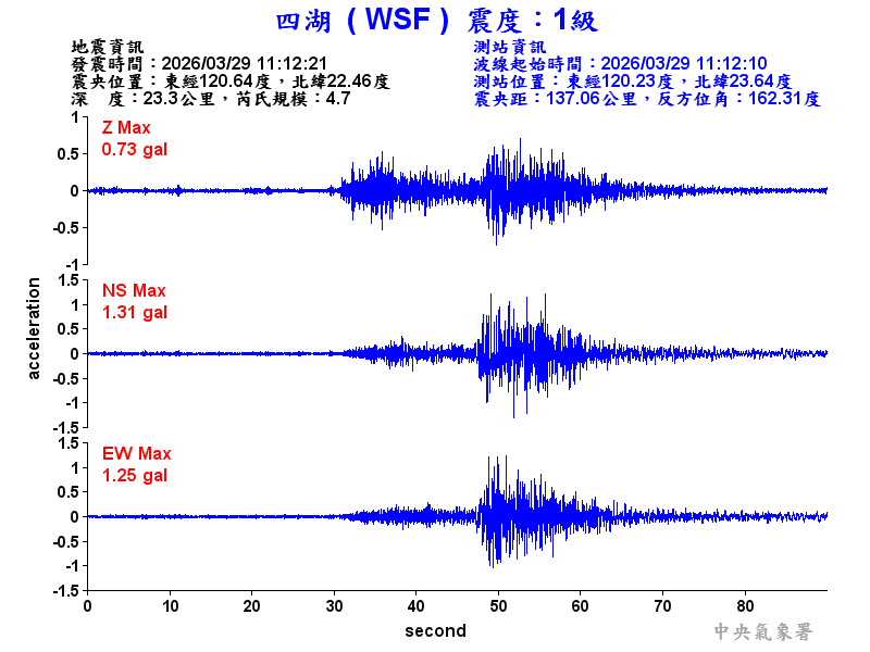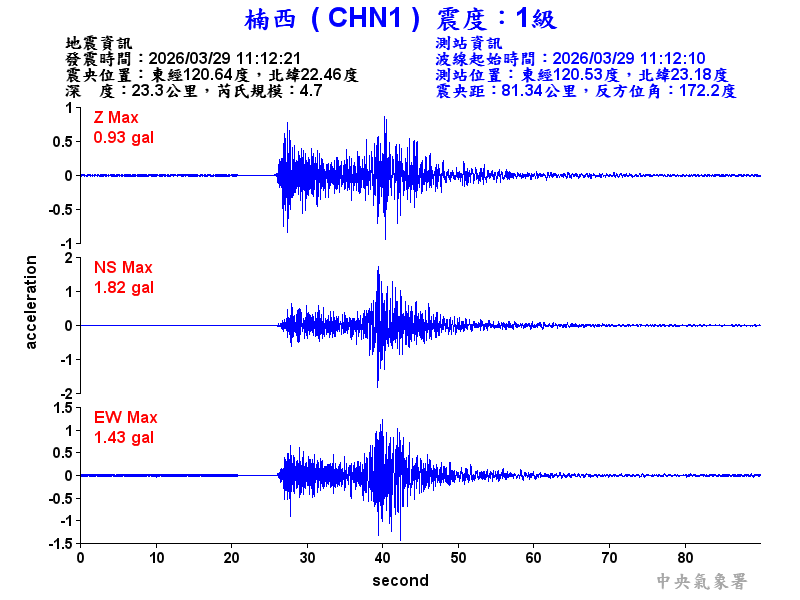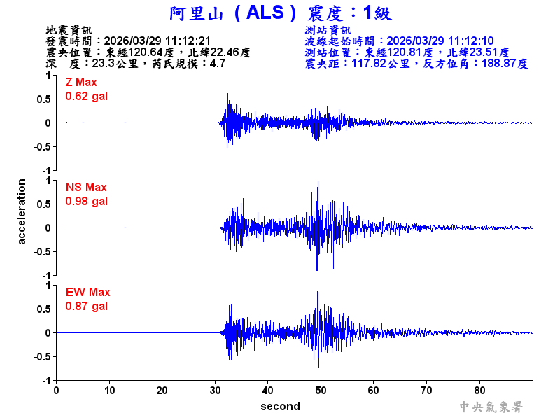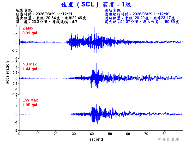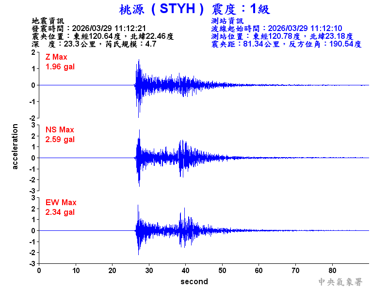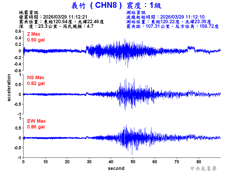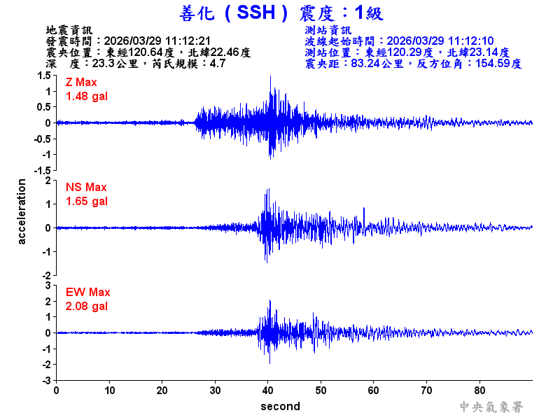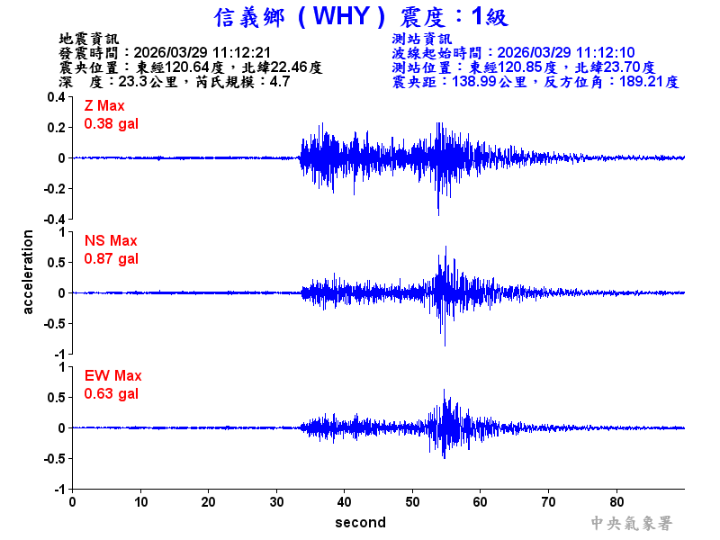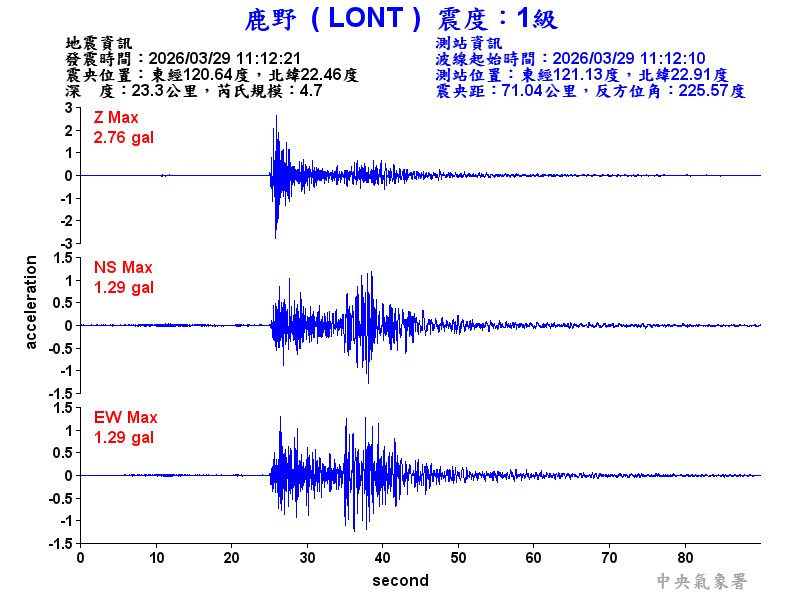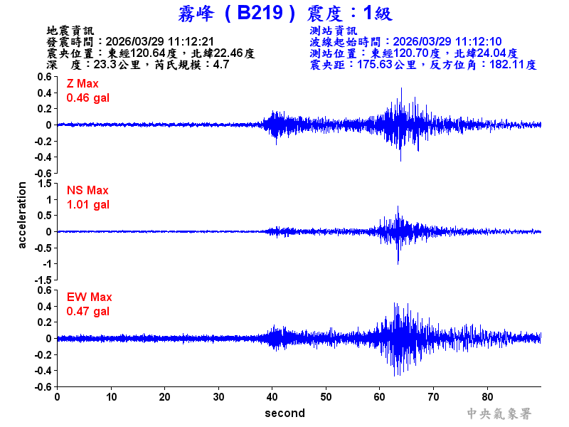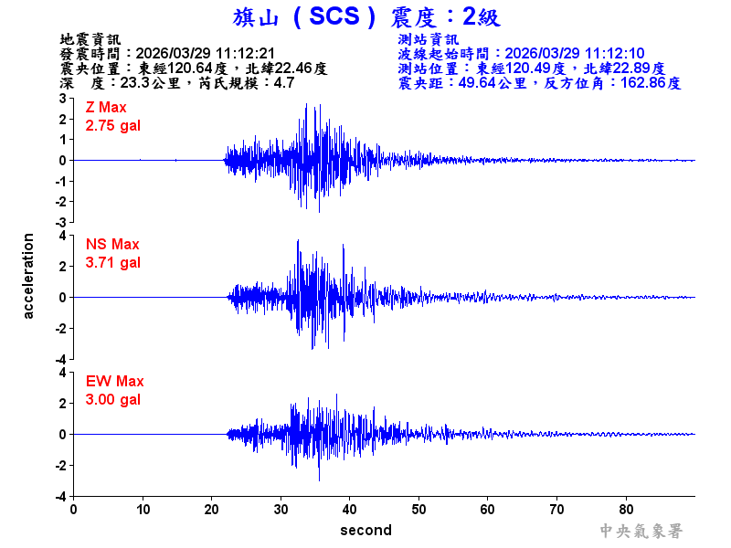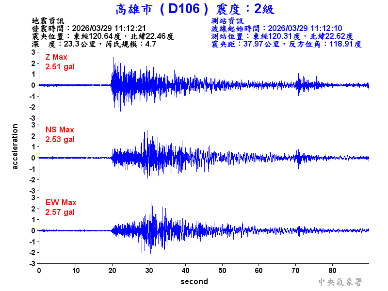 Origin Time:2026/03/29 11:12:21 Lon:120.64°E Lat:22.46°N Depth:23.3km