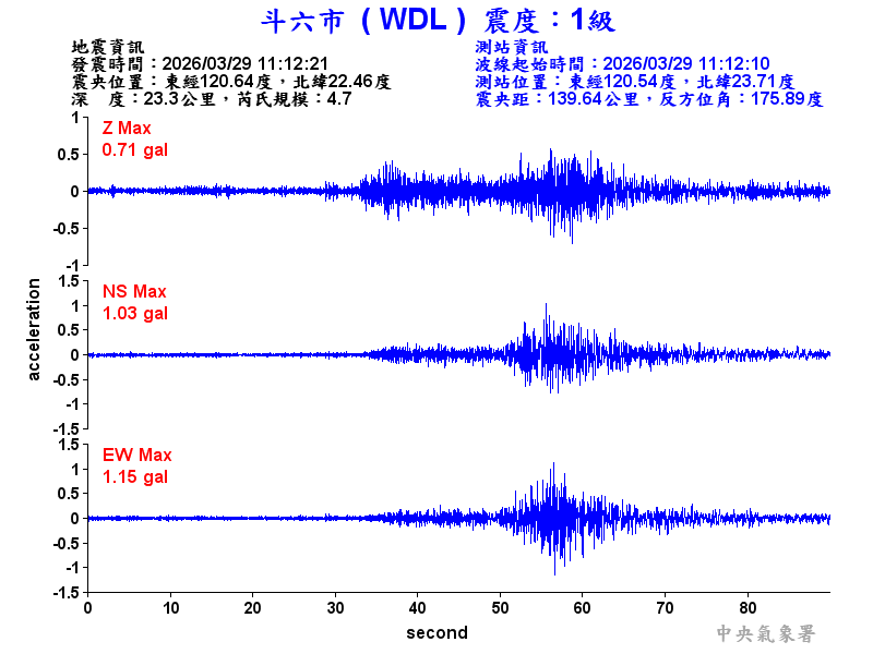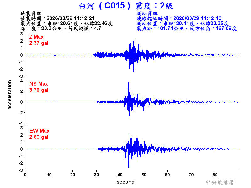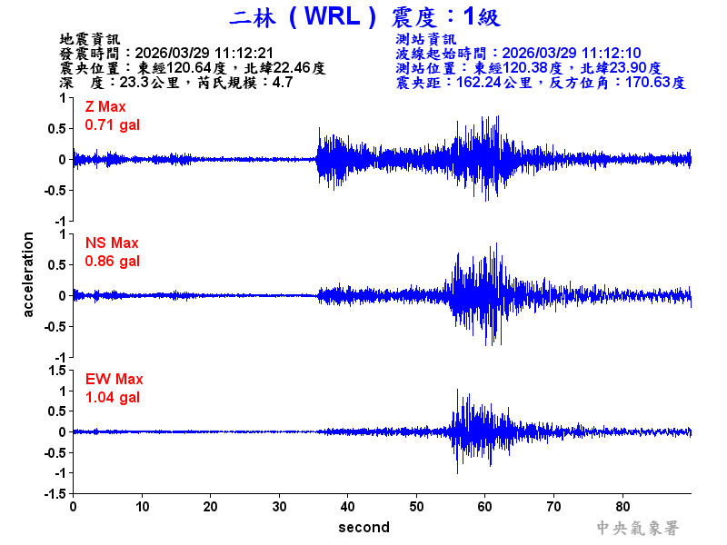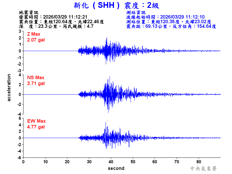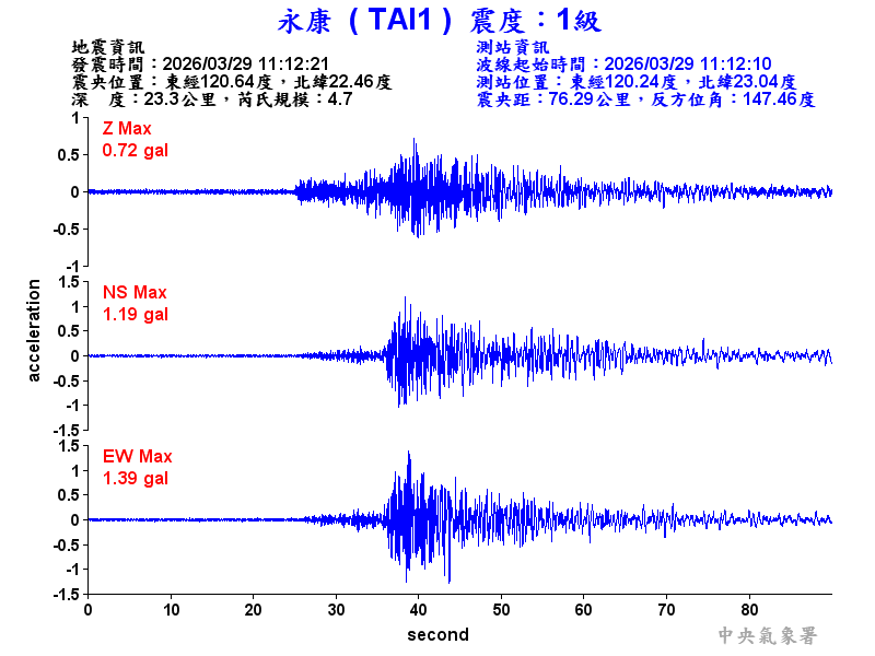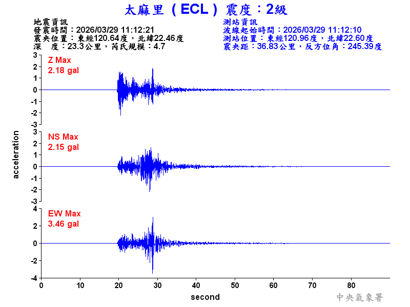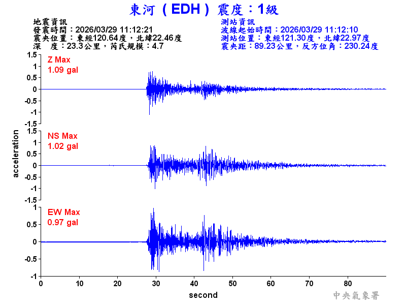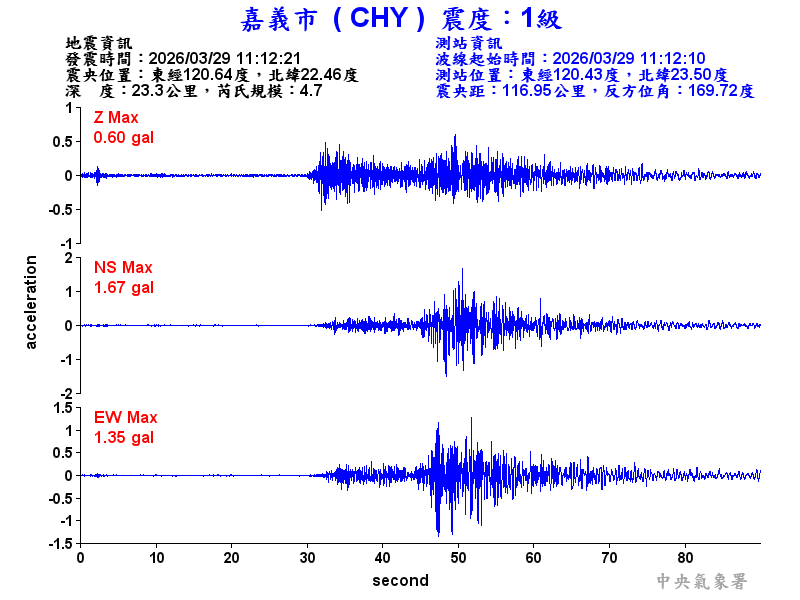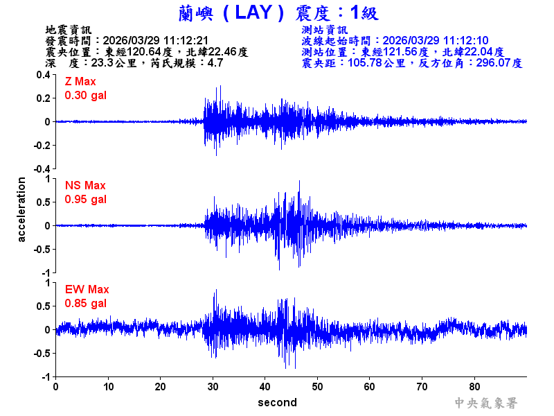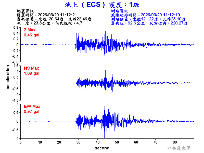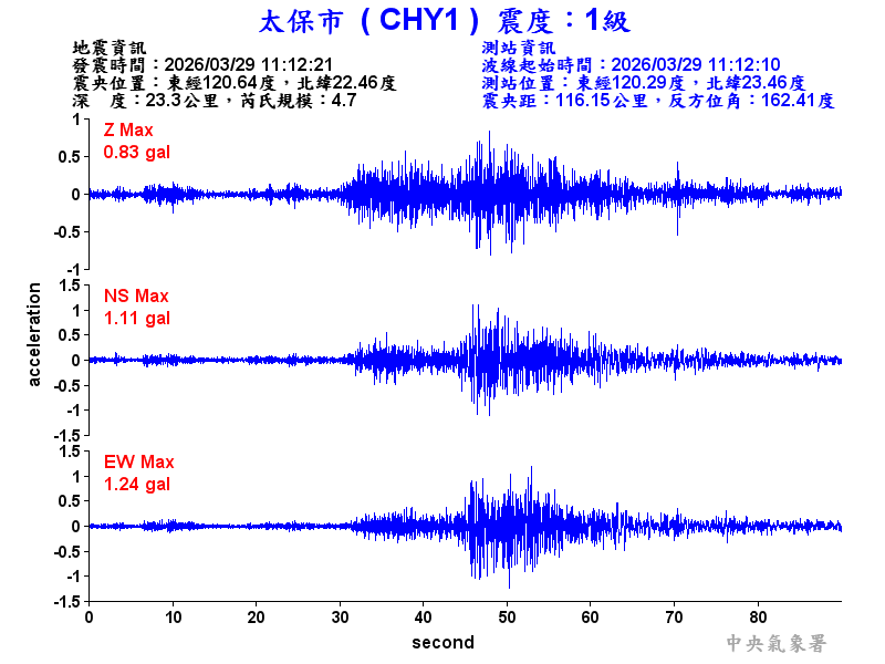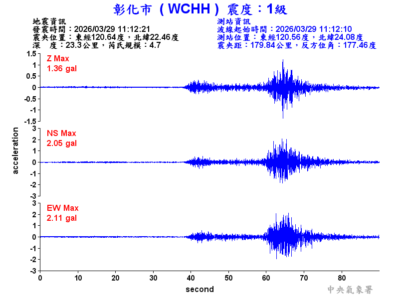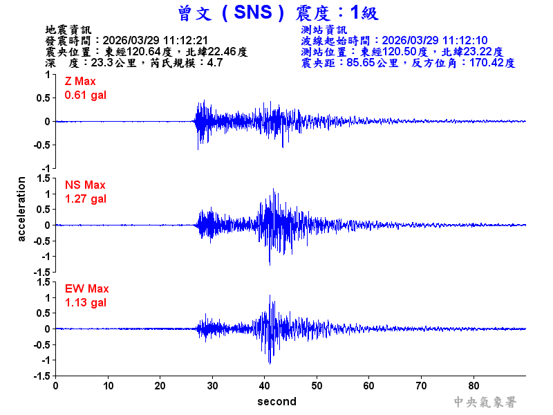 Origin Time:2026/03/29 11:12:21 Lon:120.64°E Lat:22.46°N Depth:23.3km